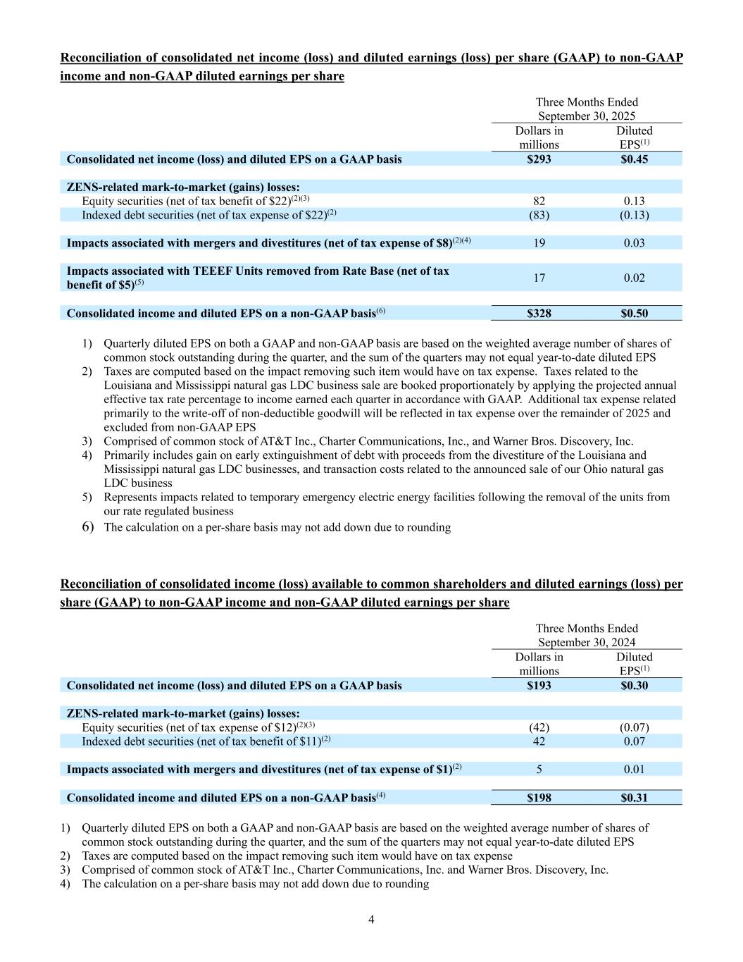 4 Reconciliation of consolidated net income (loss) and diluted earnings (loss) per share (GAAP) to non-GAAP income and non-GAAP diluted earnings per share Three Months Ended September 30, 2025 Dollars in millions Diluted EPS(1) Consolidated net income (loss) and diluted EPS on a GAAP basis $293 $0.45 ZENS-related mark-to-market (gains) losses: Equity securities (net of tax benefit of $22)(2)(3) 82 0.13 Indexed debt securities (net of tax expense of $22)(2) (83) (0.13) Impacts associated with mergers and divestitures (net of tax expense of $8)(2)(4) 19 0.03 Impacts associated with TEEEF Units removed from Rate Base (net of tax benefit of $5)(5) 17 0.02 Consolidated income and diluted EPS on a non-GAAP basis(6) $328 $0.50 1) Quarterly diluted EPS on both a GAAP and non-GAAP basis are based on the weighted average number of shares of common stock outstanding during the quarter, and the sum of the quarters may not equal year-to-date diluted EPS 2) Taxes are computed based on the impact removing such item would have on tax expense. Taxes related to the Louisiana and Mississippi natural gas LDC business sale are booked proportionately by applying the projected annual effective tax rate percentage to income earned each quarter in accordance with GAAP. Additional tax expense related primarily to the write-off of non-deductible goodwill will be reflected in tax expense over the remainder of 2025 and excluded from non-GAAP EPS 3) Comprised of common stock of AT&T Inc., Charter Communications, Inc., and Warner Bros. Discovery, Inc. 4) Primarily includes gain on early extinguishment of debt with proceeds from the divestiture of the Louisiana and Mississippi natural gas LDC businesses, and transaction costs related to the announced sale of our Ohio natural gas LDC business 5) Represents impacts related to temporary emergency electric energy facilities following the removal of the units from our rate regulated business 6) The calculation on a per-share basis may not add down due to rounding Reconciliation of consolidated income (loss) available to common shareholders and diluted earnings (loss) per share (GAAP) to non-GAAP income and non-GAAP diluted earnings per share Three Months Ended September 30, 2024 Dollars in millions Diluted EPS(1) Consolidated net income (loss) and diluted EPS on a GAAP basis $193 $0.30 ZENS-related mark-to-market (gains) losses: Equity securities (net of tax expense of $12)(2)(3) (42) (0.07) Indexed debt securities (net of tax benefit of $11)(2) 42 0.07 Impacts associated with mergers and divestitures (net of tax expense of $1)(2) 5 0.01 Consolidated income and diluted EPS on a non-GAAP basis(4) $198 $0.31 1) Quarterly diluted EPS on both a GAAP and non-GAAP basis are based on the weighted average number of shares of common stock outstanding during the quarter, and the sum of the quarters may not equal year-to-date diluted EPS 2) Taxes are computed based on the impact removing such item would have on tax expense 3) Comprised of common stock of AT&T Inc., Charter Communications, Inc. and Warner Bros. Discovery, Inc. 4) The calculation on a per-share basis may not add down due to rounding