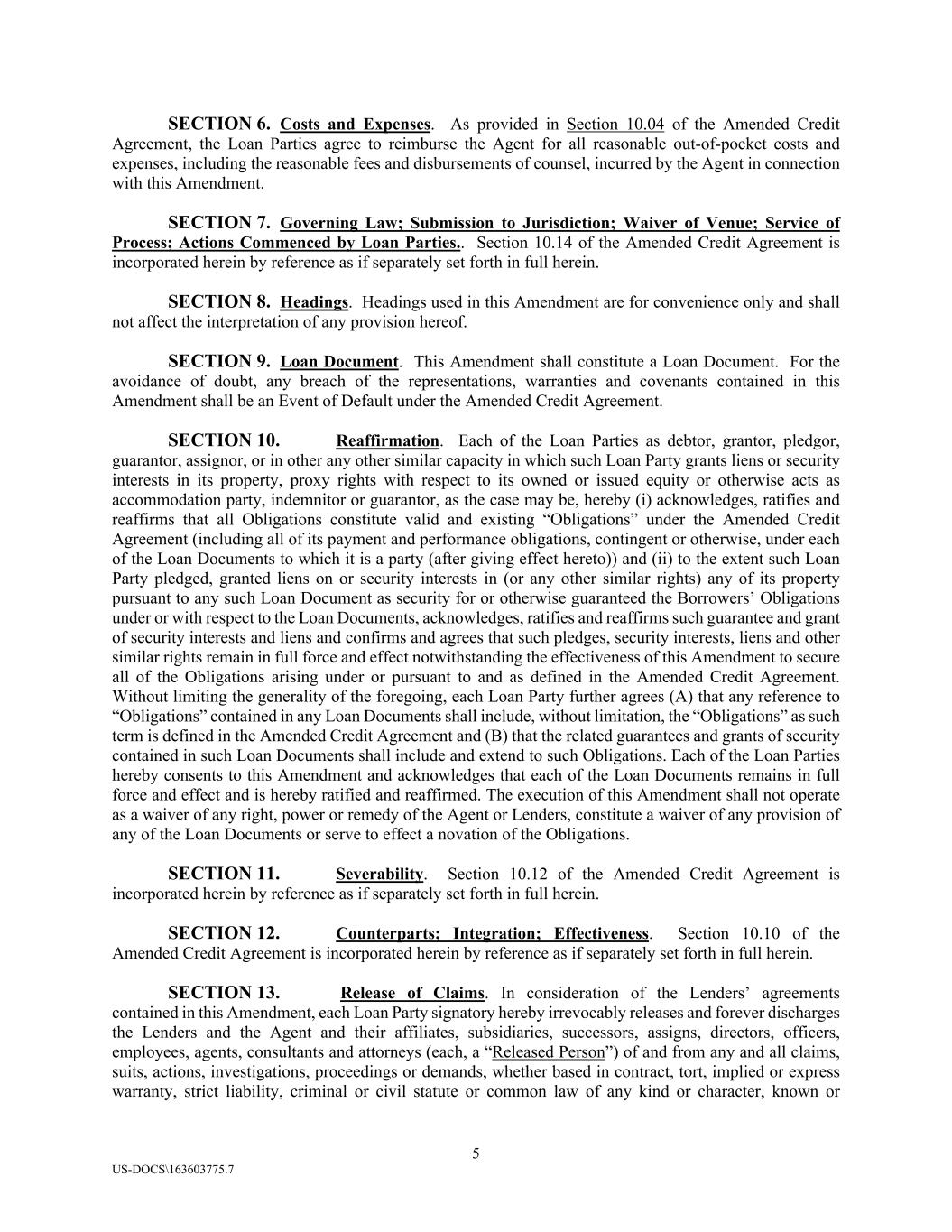 5 US-DOCS\163603775.7 SECTION 6. Costs and Expenses. As provided in Section 10.04 of the Amended Credit Agreement, the Loan Parties agree to reimburse the Agent for all reasonable out-of-pocket costs and expenses, including the reasonable fees and disbursements of counsel, incurred by the Agent in connection with this Amendment. SECTION 7. Governing Law; Submission to Jurisdiction; Waiver of Venue; Service of Process; Actions Commenced by Loan Parties.. Section 10.14 of the Amended Credit Agreement is incorporated herein by reference as if separately set forth in full herein. SECTION 8. Headings. Headings used in this Amendment are for convenience only and shall not affect the interpretation of any provision hereof. SECTION 9. Loan Document. This Amendment shall constitute a Loan Document. For the avoidance of doubt, any breach of the representations, warranties and covenants contained in this Amendment shall be an Event of Default under the Amended Credit Agreement. SECTION 10. Reaffirmation. Each of the Loan Parties as debtor, grantor, pledgor, guarantor, assignor, or in other any other similar capacity in which such Loan Party grants liens or security interests in its property, proxy rights with respect to its owned or issued equity or otherwise acts as accommodation party, indemnitor or guarantor, as the case may be, hereby (i) acknowledges, ratifies and reaffirms that all Obligations constitute valid and existing “Obligations” under the Amended Credit Agreement (including all of its payment and performance obligations, contingent or otherwise, under each of the Loan Documents to which it is a party (after giving effect hereto)) and (ii) to the extent such Loan Party pledged, granted liens on or security interests in (or any other similar rights) any of its property pursuant to any such Loan Document as security for or otherwise guaranteed the Borrowers’ Obligations under or with respect to the Loan Documents, acknowledges, ratifies and reaffirms such guarantee and grant of security interests and liens and confirms and agrees that such pledges, security interests, liens and other similar rights remain in full force and effect notwithstanding the effectiveness of this Amendment to secure all of the Obligations arising under or pursuant to and as defined in the Amended Credit Agreement. Without limiting the generality of the foregoing, each Loan Party further agrees (A) that any reference to “Obligations” contained in any Loan Documents shall include, without limitation, the “Obligations” as such term is defined in the Amended Credit Agreement and (B) that the related guarantees and grants of security contained in such Loan Documents shall include and extend to such Obligations. Each of the Loan Parties hereby consents to this Amendment and acknowledges that each of the Loan Documents remains in full force and effect and is hereby ratified and reaffirmed. The execution of this Amendment shall not operate as a waiver of any right, power or remedy of the Agent or Lenders, constitute a waiver of any provision of any of the Loan Documents or serve to effect a novation of the Obligations. SECTION 11. Severability. Section 10.12 of the Amended Credit Agreement is incorporated herein by reference as if separately set forth in full herein. SECTION 12. Counterparts; Integration; Effectiveness. Section 10.10 of the Amended Credit Agreement is incorporated herein by reference as if separately set forth in full herein. SECTION 13. Release of Claims. In consideration of the Lenders’ agreements contained in this Amendment, each Loan Party signatory hereby irrevocably releases and forever discharges the Lenders and the Agent and their affiliates, subsidiaries, successors, assigns, directors, officers, employees, agents, consultants and attorneys (each, a “Released Person”) of and from any and all claims, suits, actions, investigations, proceedings or demands, whether based in contract, tort, implied or express warranty, strict liability, criminal or civil statute or common law of any kind or character, known or