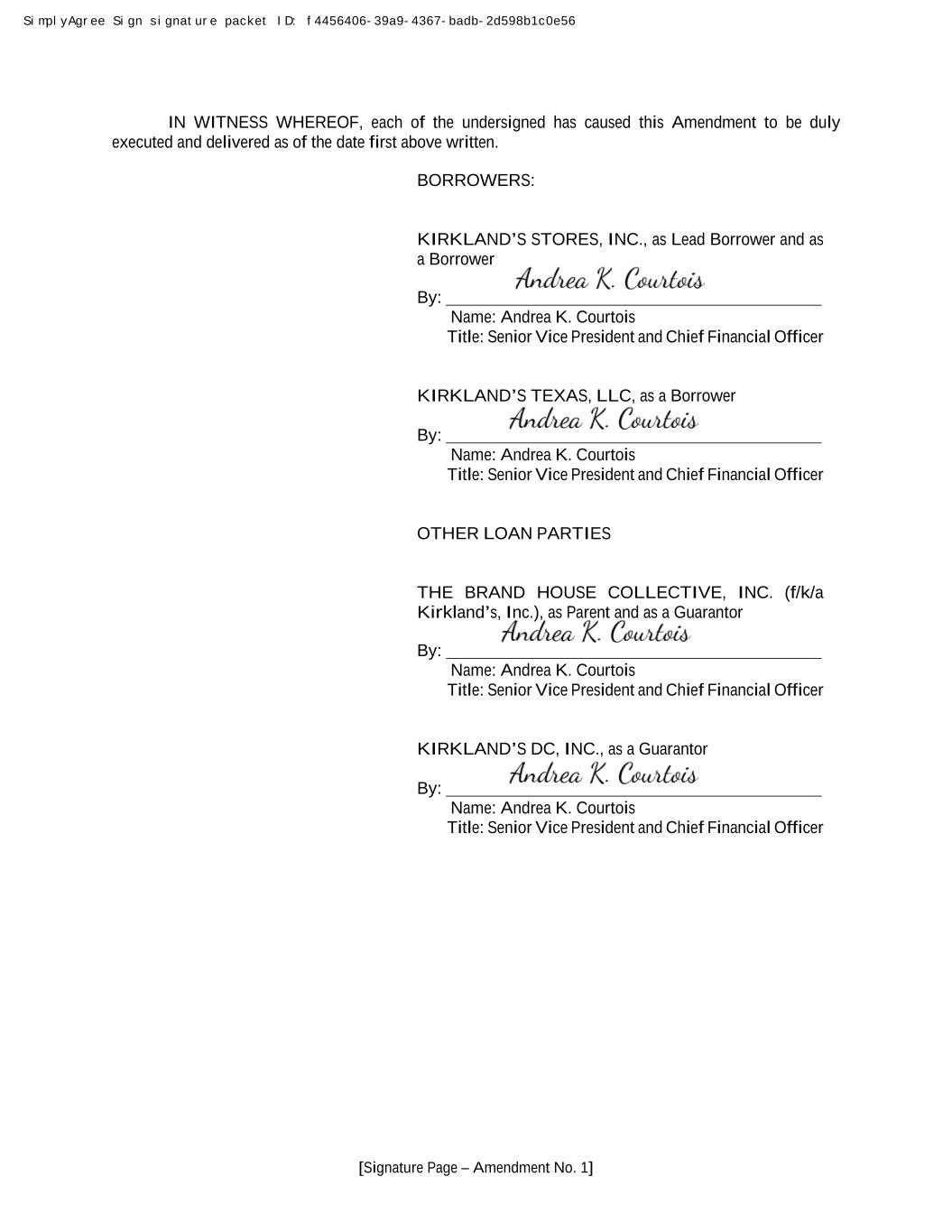 [Signature Page – Amendment No. 1] IN WITNESS WHEREOF, each of the undersigned has caused this Amendment to be duly executed and delivered as of the date first above written. BORROWERS: KIRKLAND’S STORES, INC., as Lead Borrower and as a Borrower By: Name: Andrea K. Courtois Title: Senior Vice President and Chief Financial Officer KIRKLAND’S TEXAS, LLC, as a Borrower By: Name: Andrea K. Courtois Title: Senior Vice President and Chief Financial Officer OTHER LOAN PARTIES THE BRAND HOUSE COLLECTIVE, INC. (f/k/a Kirkland’s, Inc.), as Parent and as a Guarantor By: Name: Andrea K. Courtois Title: Senior Vice President and Chief Financial Officer KIRKLAND’S DC, INC., as a Guarantor By: Name: Andrea K. Courtois Title: Senior Vice President and Chief Financial Officer SimplyAgree Sign signature packet ID: f4456406-39a9-4367-badb-2d598b1c0e56