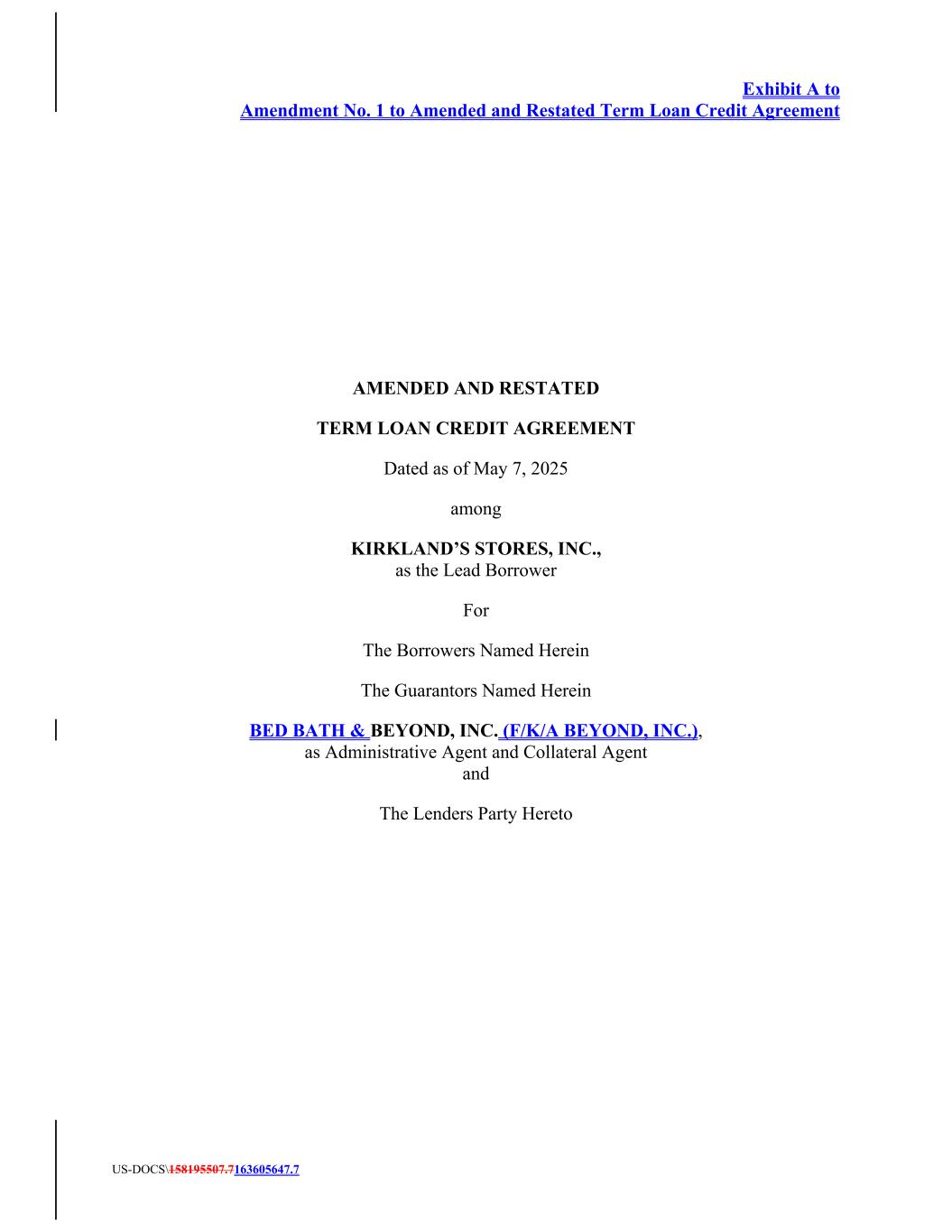 Exhibit A to Amendment No. 1 to Amended and Restated Term Loan Credit Agreement US-DOCS\158195507.7163605647.7 AMENDED AND RESTATED TERM LOAN CREDIT AGREEMENT Dated as of May 7, 2025 among KIRKLAND’S STORES, INC., as the Lead Borrower For The Borrowers Named Herein The Guarantors Named Herein BED BATH & BEYOND, INC. (F/K/A BEYOND, INC.), as Administrative Agent and Collateral Agent and The Lenders Party Hereto