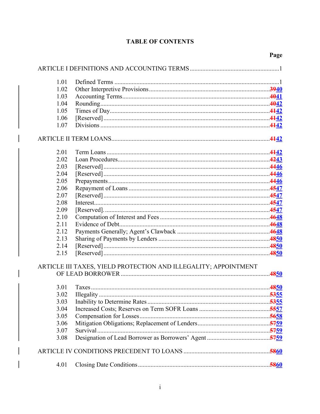 i TABLE OF CONTENTS Page ARTICLE I DEFINITIONS AND ACCOUNTING TERMS.........................................................1 1.01 Defined Terms .........................................................................................................1 1.02 Other Interpretive Provisions.............................................................................3940 1.03 Accounting Terms..............................................................................................4041 1.04 Rounding............................................................................................................4042 1.05 Times of Day......................................................................................................4142 1.06 [Reserved] ..........................................................................................................4142 1.07 Divisions ............................................................................................................4142 ARTICLE II TERM LOANS.....................................................................................................4142 2.01 Term Loans ........................................................................................................4142 2.02 Loan Procedures.................................................................................................4243 2.03 [Reserved] ..........................................................................................................4446 2.04 [Reserved] ..........................................................................................................4446 2.05 Prepayments.......................................................................................................4446 2.06 Repayment of Loans ..........................................................................................4547 2.07 [Reserved] ..........................................................................................................4547 2.08 Interest................................................................................................................4547 2.09 [Reserved]. .........................................................................................................4547 2.10 Computation of Interest and Fees ......................................................................4648 2.11 Evidence of Debt................................................................................................4648 2.12 Payments Generally; Agent’s Clawback ...........................................................4648 2.13 Sharing of Payments by Lenders .......................................................................4850 2.14 [Reserved] ..........................................................................................................4850 2.15 [Reserved] ..........................................................................................................4850 ARTICLE III TAXES, YIELD PROTECTION AND ILLEGALITY; APPOINTMENT OF LEAD BORROWER ...............................................................................................4850 3.01 Taxes ..................................................................................................................4850 3.02 Illegality .............................................................................................................5355 3.03 Inability to Determine Rates ..............................................................................5355 3.04 Increased Costs; Reserves on Term SOFR Loans .............................................5557 3.05 Compensation for Losses...................................................................................5658 3.06 Mitigation Obligations; Replacement of Lenders..............................................5759 3.07 Survival ..............................................................................................................5759 3.08 Designation of Lead Borrower as Borrowers’ Agent ........................................5759 ARTICLE IV CONDITIONS PRECEDENT TO LOANS .......................................................5860 4.01 Closing Date Conditions ....................................................................................5860
