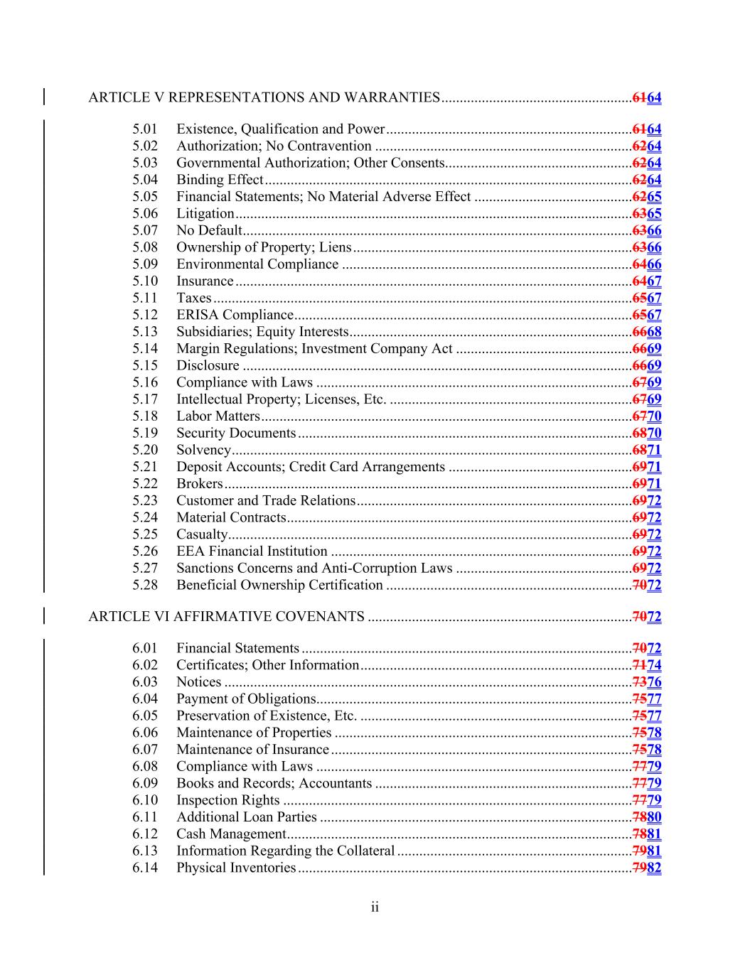 ii ARTICLE V REPRESENTATIONS AND WARRANTIES....................................................6164 5.01 Existence, Qualification and Power...................................................................6164 5.02 Authorization; No Contravention ......................................................................6264 5.03 Governmental Authorization; Other Consents...................................................6264 5.04 Binding Effect....................................................................................................6264 5.05 Financial Statements; No Material Adverse Effect ...........................................6265 5.06 Litigation............................................................................................................6365 5.07 No Default..........................................................................................................6366 5.08 Ownership of Property; Liens............................................................................6366 5.09 Environmental Compliance ...............................................................................6466 5.10 Insurance ............................................................................................................6467 5.11 Taxes ..................................................................................................................6567 5.12 ERISA Compliance............................................................................................6567 5.13 Subsidiaries; Equity Interests.............................................................................6668 5.14 Margin Regulations; Investment Company Act ................................................6669 5.15 Disclosure ..........................................................................................................6669 5.16 Compliance with Laws ......................................................................................6769 5.17 Intellectual Property; Licenses, Etc. ..................................................................6769 5.18 Labor Matters.....................................................................................................6770 5.19 Security Documents ...........................................................................................6870 5.20 Solvency.............................................................................................................6871 5.21 Deposit Accounts; Credit Card Arrangements ..................................................6971 5.22 Brokers...............................................................................................................6971 5.23 Customer and Trade Relations...........................................................................6972 5.24 Material Contracts..............................................................................................6972 5.25 Casualty..............................................................................................................6972 5.26 EEA Financial Institution ..................................................................................6972 5.27 Sanctions Concerns and Anti-Corruption Laws ................................................6972 5.28 Beneficial Ownership Certification ...................................................................7072 ARTICLE VI AFFIRMATIVE COVENANTS ........................................................................7072 6.01 Financial Statements ..........................................................................................7072 6.02 Certificates; Other Information..........................................................................7174 6.03 Notices ...............................................................................................................7376 6.04 Payment of Obligations......................................................................................7577 6.05 Preservation of Existence, Etc. ..........................................................................7577 6.06 Maintenance of Properties .................................................................................7578 6.07 Maintenance of Insurance ..................................................................................7578 6.08 Compliance with Laws ......................................................................................7779 6.09 Books and Records; Accountants ......................................................................7779 6.10 Inspection Rights ...............................................................................................7779 6.11 Additional Loan Parties .....................................................................................7880 6.12 Cash Management..............................................................................................7881 6.13 Information Regarding the Collateral ................................................................7981 6.14 Physical Inventories ...........................................................................................7982