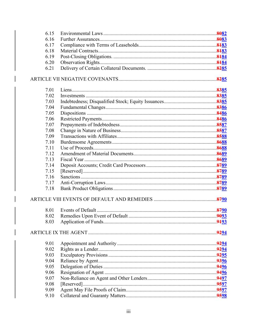 iii 6.15 Environmental Laws ..........................................................................................8082 6.16 Further Assurances.............................................................................................8083 6.17 Compliance with Terms of Leaseholds..............................................................8183 6.18 Material Contracts..............................................................................................8183 6.19 Post-Closing Obligations. ..................................................................................8184 6.20 Observation Rights.............................................................................................8184 6.21 Delivery of Certain Collateral Documents. .......................................................8285 ARTICLE VII NEGATIVE COVENANTS..............................................................................8285 7.01 Liens...................................................................................................................8385 7.02 Investments ........................................................................................................8385 7.03 Indebtedness; Disqualified Stock; Equity Issuances..........................................8385 7.04 Fundamental Changes........................................................................................8386 7.05 Dispositions .......................................................................................................8486 7.06 Restricted Payments...........................................................................................8486 7.07 Prepayments of Indebtedness.............................................................................8587 7.08 Change in Nature of Business............................................................................8587 7.09 Transactions with Affiliates...............................................................................8588 7.10 Burdensome Agreements ...................................................................................8688 7.11 Use of Proceeds..................................................................................................8688 7.12 Amendment of Material Documents..................................................................8689 7.13 Fiscal Year .........................................................................................................8689 7.14 Deposit Accounts; Credit Card Processors ........................................................8789 7.15 [Reserved] ..........................................................................................................8789 7.16 Sanctions ............................................................................................................8789 7.17 Anti-Corruption Laws........................................................................................8789 7.18 Bank Product Obligations ..................................................................................8789 ARTICLE VIII EVENTS OF DEFAULT AND REMEDIES ..................................................8790 8.01 Events of Default ...............................................................................................8790 8.02 Remedies Upon Event of Default ......................................................................9093 8.03 Application of Funds..........................................................................................9193 ARTICLE IX THE AGENT ......................................................................................................9294 9.01 Appointment and Authority ...............................................................................9294 9.02 Rights as a Lender..............................................................................................9294 9.03 Exculpatory Provisions ......................................................................................9295 9.04 Reliance by Agent..............................................................................................9396 9.05 Delegation of Duties ..........................................................................................9496 9.06 Resignation of Agent .........................................................................................9496 9.07 Non-Reliance on Agent and Other Lenders.......................................................9497 9.08 [Reserved] ..........................................................................................................9597 9.09 Agent May File Proofs of Claim........................................................................9597 9.10 Collateral and Guaranty Matters........................................................................9598