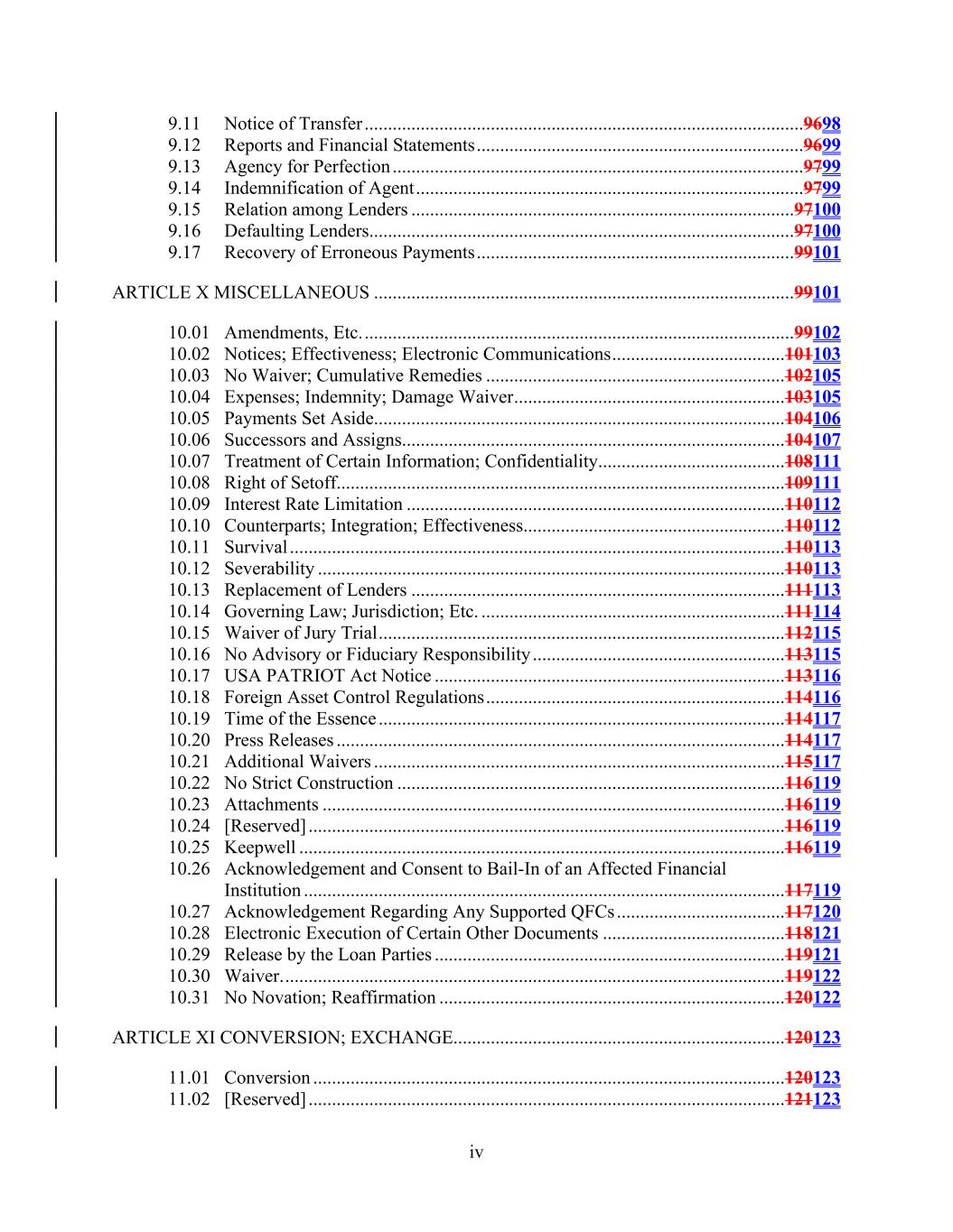 iv 9.11 Notice of Transfer ..............................................................................................9698 9.12 Reports and Financial Statements......................................................................9699 9.13 Agency for Perfection ........................................................................................9799 9.14 Indemnification of Agent...................................................................................9799 9.15 Relation among Lenders ..................................................................................97100 9.16 Defaulting Lenders...........................................................................................97100 9.17 Recovery of Erroneous Payments....................................................................99101 ARTICLE X MISCELLANEOUS ..........................................................................................99101 10.01 Amendments, Etc.............................................................................................99102 10.02 Notices; Effectiveness; Electronic Communications.....................................101103 10.03 No Waiver; Cumulative Remedies ................................................................102105 10.04 Expenses; Indemnity; Damage Waiver..........................................................103105 10.05 Payments Set Aside........................................................................................104106 10.06 Successors and Assigns..................................................................................104107 10.07 Treatment of Certain Information; Confidentiality........................................108111 10.08 Right of Setoff................................................................................................109111 10.09 Interest Rate Limitation .................................................................................110112 10.10 Counterparts; Integration; Effectiveness........................................................110112 10.11 Survival ..........................................................................................................110113 10.12 Severability ....................................................................................................110113 10.13 Replacement of Lenders ................................................................................111113 10.14 Governing Law; Jurisdiction; Etc. .................................................................111114 10.15 Waiver of Jury Trial.......................................................................................112115 10.16 No Advisory or Fiduciary Responsibility ......................................................113115 10.17 USA PATRIOT Act Notice ...........................................................................113116 10.18 Foreign Asset Control Regulations................................................................114116 10.19 Time of the Essence .......................................................................................114117 10.20 Press Releases ................................................................................................114117 10.21 Additional Waivers ........................................................................................115117 10.22 No Strict Construction ...................................................................................116119 10.23 Attachments ...................................................................................................116119 10.24 [Reserved] ......................................................................................................116119 10.25 Keepwell ........................................................................................................116119 10.26 Acknowledgement and Consent to Bail-In of an Affected Financial Institution .......................................................................................................117119 10.27 Acknowledgement Regarding Any Supported QFCs ....................................117120 10.28 Electronic Execution of Certain Other Documents .......................................118121 10.29 Release by the Loan Parties ...........................................................................119121 10.30 Waiver............................................................................................................119122 10.31 No Novation; Reaffirmation ..........................................................................120122 ARTICLE XI CONVERSION; EXCHANGE.......................................................................120123 11.01 Conversion .....................................................................................................120123 11.02 [Reserved] ......................................................................................................121123