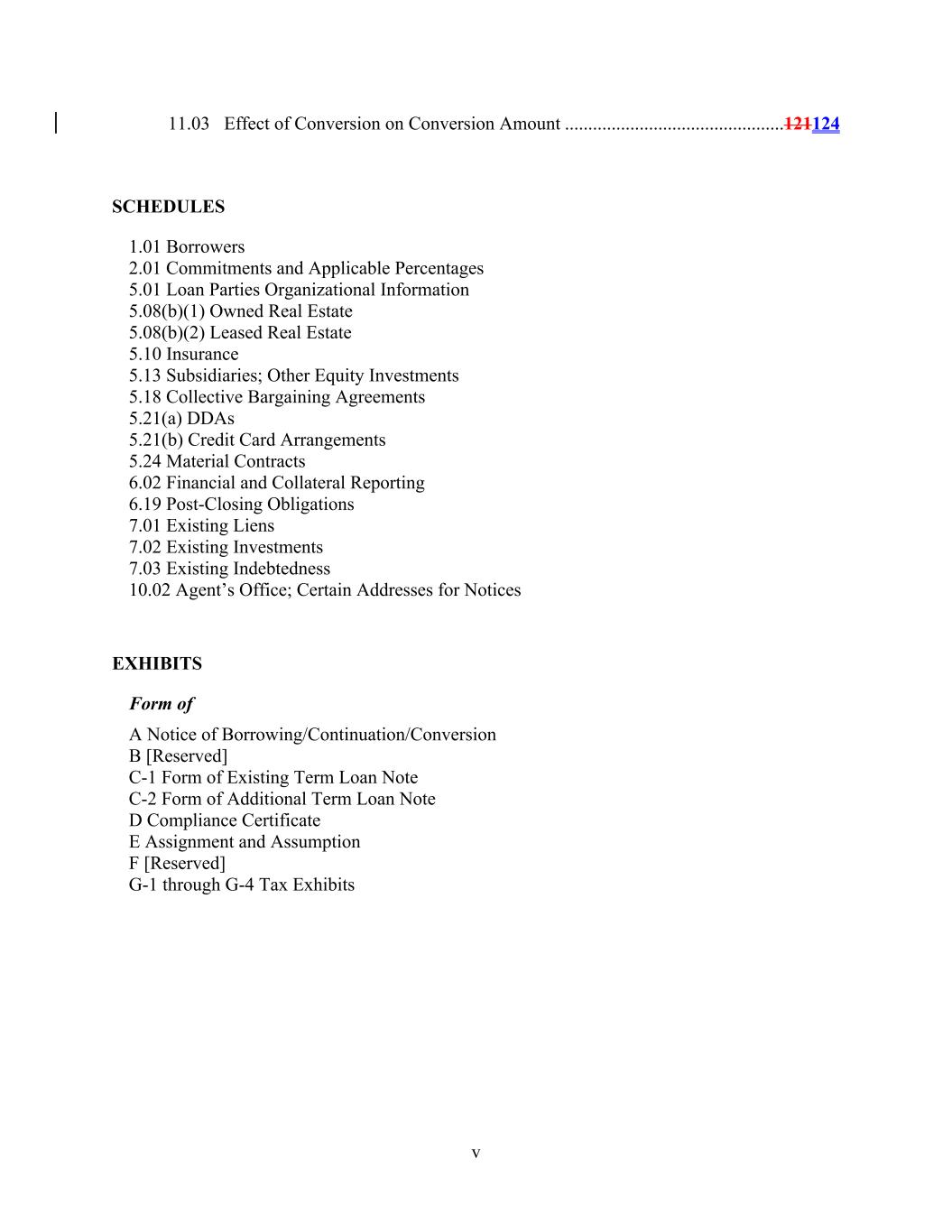 v 11.03 Effect of Conversion on Conversion Amount ...............................................121124 SCHEDULES 1.01 Borrowers 2.01 Commitments and Applicable Percentages 5.01 Loan Parties Organizational Information 5.08(b)(1) Owned Real Estate 5.08(b)(2) Leased Real Estate 5.10 Insurance 5.13 Subsidiaries; Other Equity Investments 5.18 Collective Bargaining Agreements 5.21(a) DDAs 5.21(b) Credit Card Arrangements 5.24 Material Contracts 6.02 Financial and Collateral Reporting 6.19 Post-Closing Obligations 7.01 Existing Liens 7.02 Existing Investments 7.03 Existing Indebtedness 10.02 Agent’s Office; Certain Addresses for Notices EXHIBITS Form of A Notice of Borrowing/Continuation/Conversion B [Reserved] C-1 Form of Existing Term Loan Note C-2 Form of Additional Term Loan Note D Compliance Certificate E Assignment and Assumption F [Reserved] G-1 through G-4 Tax Exhibits