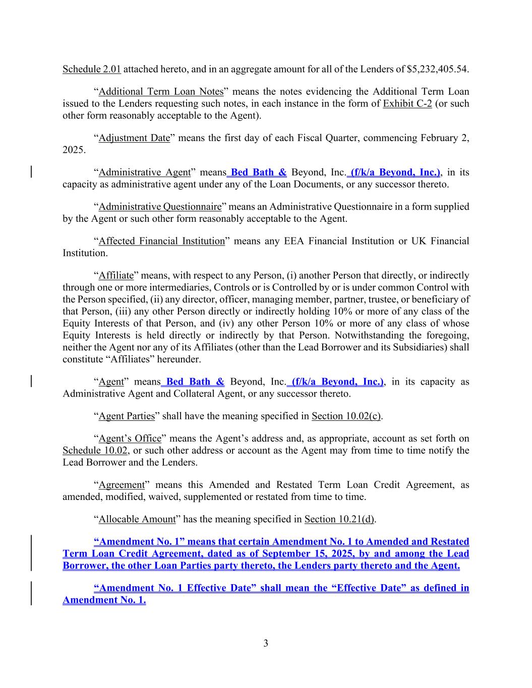 3 Schedule 2.01 attached hereto, and in an aggregate amount for all of the Lenders of $5,232,405.54. “Additional Term Loan Notes” means the notes evidencing the Additional Term Loan issued to the Lenders requesting such notes, in each instance in the form of Exhibit C-2 (or such other form reasonably acceptable to the Agent). “Adjustment Date” means the first day of each Fiscal Quarter, commencing February 2, 2025. “Administrative Agent” means Bed Bath & Beyond, Inc. (f/k/a Beyond, Inc.), in its capacity as administrative agent under any of the Loan Documents, or any successor thereto. “Administrative Questionnaire” means an Administrative Questionnaire in a form supplied by the Agent or such other form reasonably acceptable to the Agent. “Affected Financial Institution” means any EEA Financial Institution or UK Financial Institution. “Affiliate” means, with respect to any Person, (i) another Person that directly, or indirectly through one or more intermediaries, Controls or is Controlled by or is under common Control with the Person specified, (ii) any director, officer, managing member, partner, trustee, or beneficiary of that Person, (iii) any other Person directly or indirectly holding 10% or more of any class of the Equity Interests of that Person, and (iv) any other Person 10% or more of any class of whose Equity Interests is held directly or indirectly by that Person. Notwithstanding the foregoing, neither the Agent nor any of its Affiliates (other than the Lead Borrower and its Subsidiaries) shall constitute “Affiliates” hereunder. “Agent” means Bed Bath & Beyond, Inc. (f/k/a Beyond, Inc.), in its capacity as Administrative Agent and Collateral Agent, or any successor thereto. “Agent Parties” shall have the meaning specified in Section 10.02(c). “Agent’s Office” means the Agent’s address and, as appropriate, account as set forth on Schedule 10.02, or such other address or account as the Agent may from time to time notify the Lead Borrower and the Lenders. “Agreement” means this Amended and Restated Term Loan Credit Agreement, as amended, modified, waived, supplemented or restated from time to time. “Allocable Amount” has the meaning specified in Section 10.21(d). “Amendment No. 1” means that certain Amendment No. 1 to Amended and Restated Term Loan Credit Agreement, dated as of September 15, 2025, by and among the Lead Borrower, the other Loan Parties party thereto, the Lenders party thereto and the Agent. “Amendment No. 1 Effective Date” shall mean the “Effective Date” as defined in Amendment No. 1.