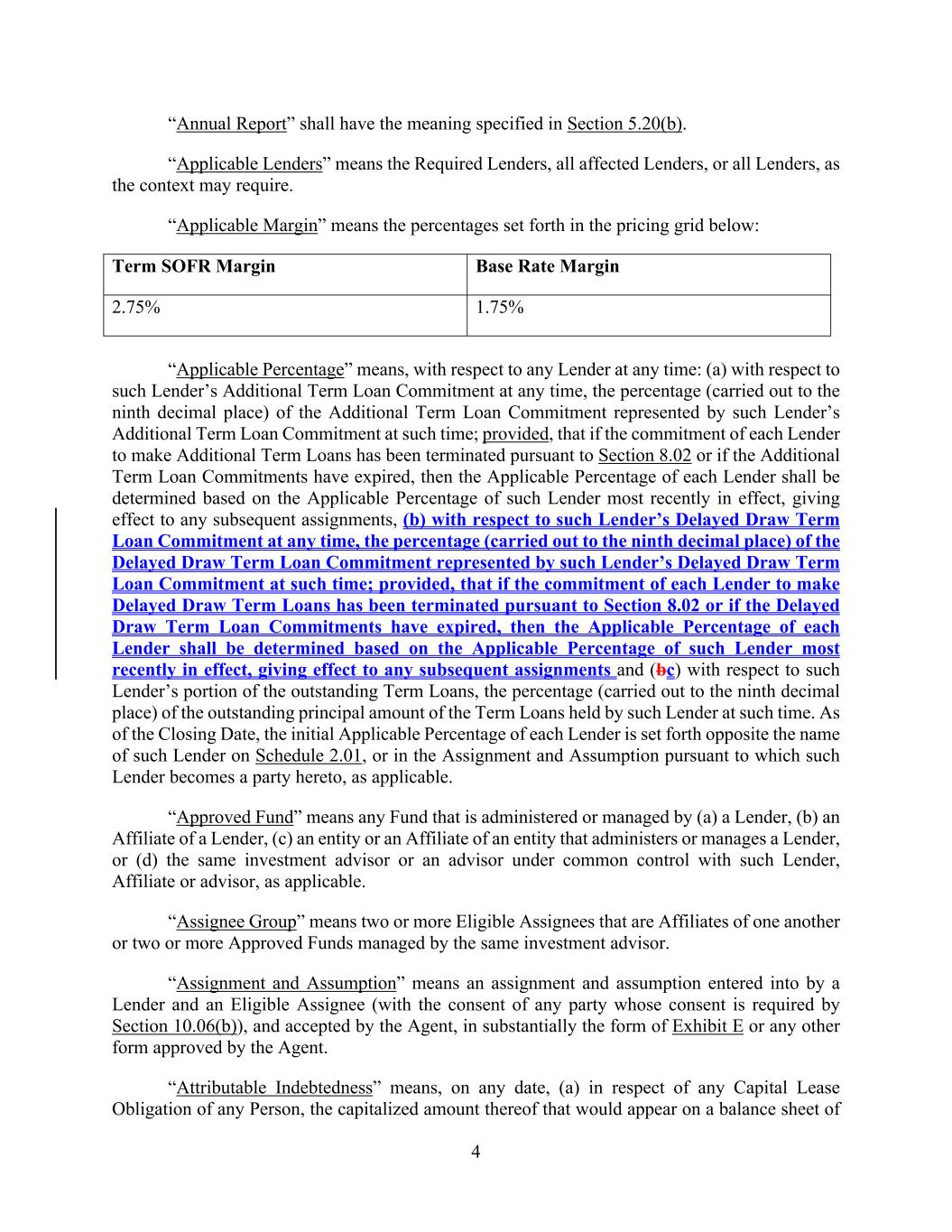 4 “Annual Report” shall have the meaning specified in Section 5.20(b). “Applicable Lenders” means the Required Lenders, all affected Lenders, or all Lenders, as the context may require. “Applicable Margin” means the percentages set forth in the pricing grid below: Term SOFR Margin Base Rate Margin 2.75% 1.75% “Applicable Percentage” means, with respect to any Lender at any time: (a) with respect to such Lender’s Additional Term Loan Commitment at any time, the percentage (carried out to the ninth decimal place) of the Additional Term Loan Commitment represented by such Lender’s Additional Term Loan Commitment at such time; provided, that if the commitment of each Lender to make Additional Term Loans has been terminated pursuant to Section 8.02 or if the Additional Term Loan Commitments have expired, then the Applicable Percentage of each Lender shall be determined based on the Applicable Percentage of such Lender most recently in effect, giving effect to any subsequent assignments, (b) with respect to such Lender’s Delayed Draw Term Loan Commitment at any time, the percentage (carried out to the ninth decimal place) of the Delayed Draw Term Loan Commitment represented by such Lender’s Delayed Draw Term Loan Commitment at such time; provided, that if the commitment of each Lender to make Delayed Draw Term Loans has been terminated pursuant to Section 8.02 or if the Delayed Draw Term Loan Commitments have expired, then the Applicable Percentage of each Lender shall be determined based on the Applicable Percentage of such Lender most recently in effect, giving effect to any subsequent assignments and (bc) with respect to such Lender’s portion of the outstanding Term Loans, the percentage (carried out to the ninth decimal place) of the outstanding principal amount of the Term Loans held by such Lender at such time. As of the Closing Date, the initial Applicable Percentage of each Lender is set forth opposite the name of such Lender on Schedule 2.01, or in the Assignment and Assumption pursuant to which such Lender becomes a party hereto, as applicable. “Approved Fund” means any Fund that is administered or managed by (a) a Lender, (b) an Affiliate of a Lender, (c) an entity or an Affiliate of an entity that administers or manages a Lender, or (d) the same investment advisor or an advisor under common control with such Lender, Affiliate or advisor, as applicable. “Assignee Group” means two or more Eligible Assignees that are Affiliates of one another or two or more Approved Funds managed by the same investment advisor. “Assignment and Assumption” means an assignment and assumption entered into by a Lender and an Eligible Assignee (with the consent of any party whose consent is required by Section 10.06(b)), and accepted by the Agent, in substantially the form of Exhibit E or any other form approved by the Agent. “Attributable Indebtedness” means, on any date, (a) in respect of any Capital Lease Obligation of any Person, the capitalized amount thereof that would appear on a balance sheet of