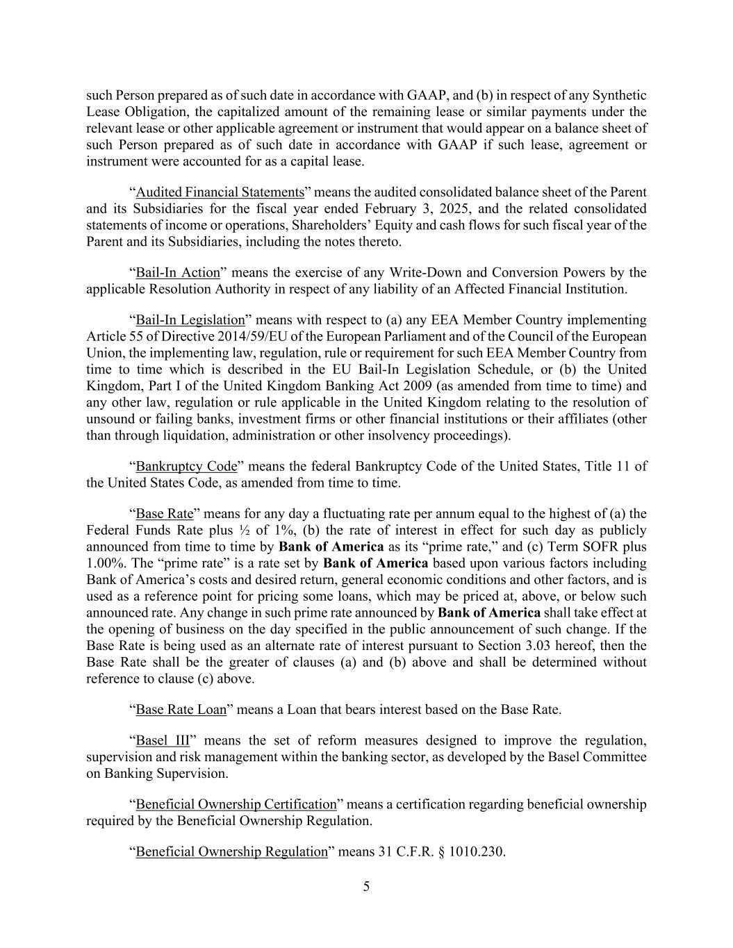 5 such Person prepared as of such date in accordance with GAAP, and (b) in respect of any Synthetic Lease Obligation, the capitalized amount of the remaining lease or similar payments under the relevant lease or other applicable agreement or instrument that would appear on a balance sheet of such Person prepared as of such date in accordance with GAAP if such lease, agreement or instrument were accounted for as a capital lease. “Audited Financial Statements” means the audited consolidated balance sheet of the Parent and its Subsidiaries for the fiscal year ended February 3, 2025, and the related consolidated statements of income or operations, Shareholders’ Equity and cash flows for such fiscal year of the Parent and its Subsidiaries, including the notes thereto. “Bail-In Action” means the exercise of any Write-Down and Conversion Powers by the applicable Resolution Authority in respect of any liability of an Affected Financial Institution. “Bail-In Legislation” means with respect to (a) any EEA Member Country implementing Article 55 of Directive 2014/59/EU of the European Parliament and of the Council of the European Union, the implementing law, regulation, rule or requirement for such EEA Member Country from time to time which is described in the EU Bail-In Legislation Schedule, or (b) the United Kingdom, Part I of the United Kingdom Banking Act 2009 (as amended from time to time) and any other law, regulation or rule applicable in the United Kingdom relating to the resolution of unsound or failing banks, investment firms or other financial institutions or their affiliates (other than through liquidation, administration or other insolvency proceedings). “Bankruptcy Code” means the federal Bankruptcy Code of the United States, Title 11 of the United States Code, as amended from time to time. “Base Rate” means for any day a fluctuating rate per annum equal to the highest of (a) the Federal Funds Rate plus ½ of 1%, (b) the rate of interest in effect for such day as publicly announced from time to time by Bank of America as its “prime rate,” and (c) Term SOFR plus 1.00%. The “prime rate” is a rate set by Bank of America based upon various factors including Bank of America’s costs and desired return, general economic conditions and other factors, and is used as a reference point for pricing some loans, which may be priced at, above, or below such announced rate. Any change in such prime rate announced by Bank of America shall take effect at the opening of business on the day specified in the public announcement of such change. If the Base Rate is being used as an alternate rate of interest pursuant to Section 3.03 hereof, then the Base Rate shall be the greater of clauses (a) and (b) above and shall be determined without reference to clause (c) above. “Base Rate Loan” means a Loan that bears interest based on the Base Rate. “Basel III” means the set of reform measures designed to improve the regulation, supervision and risk management within the banking sector, as developed by the Basel Committee on Banking Supervision. “Beneficial Ownership Certification” means a certification regarding beneficial ownership required by the Beneficial Ownership Regulation. “Beneficial Ownership Regulation” means 31 C.F.R. § 1010.230.