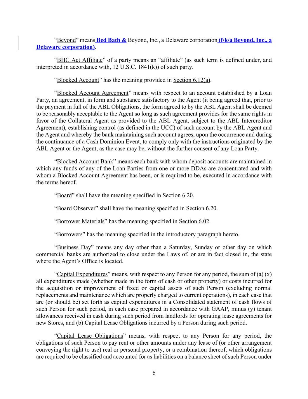 6 “Beyond” means Bed Bath & Beyond, Inc., a Delaware corporation (f/k/a Beyond, Inc., a Delaware corporation). “BHC Act Affiliate” of a party means an “affiliate” (as such term is defined under, and interpreted in accordance with, 12 U.S.C. 1841(k)) of such party. “Blocked Account” has the meaning provided in Section 6.12(a). “Blocked Account Agreement” means with respect to an account established by a Loan Party, an agreement, in form and substance satisfactory to the Agent (it being agreed that, prior to the payment in full of the ABL Obligations, the form agreed to by the ABL Agent shall be deemed to be reasonably acceptable to the Agent so long as such agreement provides for the same rights in favor of the Collateral Agent as provided to the ABL Agent, subject to the ABL Intercreditor Agreement), establishing control (as defined in the UCC) of such account by the ABL Agent and the Agent and whereby the bank maintaining such account agrees, upon the occurrence and during the continuance of a Cash Dominion Event, to comply only with the instructions originated by the ABL Agent or the Agent, as the case may be, without the further consent of any Loan Party. “Blocked Account Bank” means each bank with whom deposit accounts are maintained in which any funds of any of the Loan Parties from one or more DDAs are concentrated and with whom a Blocked Account Agreement has been, or is required to be, executed in accordance with the terms hereof. “Board” shall have the meaning specified in Section 6.20. “Board Observer” shall have the meaning specified in Section 6.20. “Borrower Materials” has the meaning specified in Section 6.02. “Borrowers” has the meaning specified in the introductory paragraph hereto. “Business Day” means any day other than a Saturday, Sunday or other day on which commercial banks are authorized to close under the Laws of, or are in fact closed in, the state where the Agent’s Office is located. “Capital Expenditures” means, with respect to any Person for any period, the sum of (a) (x) all expenditures made (whether made in the form of cash or other property) or costs incurred for the acquisition or improvement of fixed or capital assets of such Person (excluding normal replacements and maintenance which are properly charged to current operations), in each case that are (or should be) set forth as capital expenditures in a Consolidated statement of cash flows of such Person for such period, in each case prepared in accordance with GAAP, minus (y) tenant allowances received in cash during such period from landlords for operating lease agreements for new Stores, and (b) Capital Lease Obligations incurred by a Person during such period. “Capital Lease Obligations” means, with respect to any Person for any period, the obligations of such Person to pay rent or other amounts under any lease of (or other arrangement conveying the right to use) real or personal property, or a combination thereof, which obligations are required to be classified and accounted for as liabilities on a balance sheet of such Person under