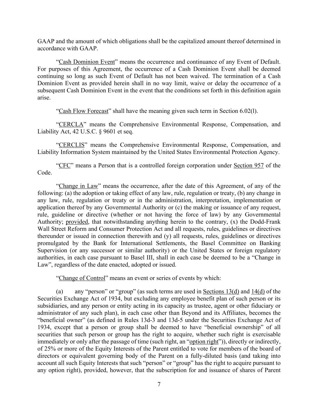 7 GAAP and the amount of which obligations shall be the capitalized amount thereof determined in accordance with GAAP. “Cash Dominion Event” means the occurrence and continuance of any Event of Default. For purposes of this Agreement, the occurrence of a Cash Dominion Event shall be deemed continuing so long as such Event of Default has not been waived. The termination of a Cash Dominion Event as provided herein shall in no way limit, waive or delay the occurrence of a subsequent Cash Dominion Event in the event that the conditions set forth in this definition again arise. “Cash Flow Forecast” shall have the meaning given such term in Section 6.02(l). “CERCLA” means the Comprehensive Environmental Response, Compensation, and Liability Act, 42 U.S.C. § 9601 et seq. “CERCLIS” means the Comprehensive Environmental Response, Compensation, and Liability Information System maintained by the United States Environmental Protection Agency. “CFC” means a Person that is a controlled foreign corporation under Section 957 of the Code. “Change in Law” means the occurrence, after the date of this Agreement, of any of the following: (a) the adoption or taking effect of any law, rule, regulation or treaty, (b) any change in any law, rule, regulation or treaty or in the administration, interpretation, implementation or application thereof by any Governmental Authority or (c) the making or issuance of any request, rule, guideline or directive (whether or not having the force of law) by any Governmental Authority; provided, that notwithstanding anything herein to the contrary, (x) the Dodd-Frank Wall Street Reform and Consumer Protection Act and all requests, rules, guidelines or directives thereunder or issued in connection therewith and (y) all requests, rules, guidelines or directives promulgated by the Bank for International Settlements, the Basel Committee on Banking Supervision (or any successor or similar authority) or the United States or foreign regulatory authorities, in each case pursuant to Basel III, shall in each case be deemed to be a “Change in Law”, regardless of the date enacted, adopted or issued. “Change of Control” means an event or series of events by which: (a) any “person” or “group” (as such terms are used in Sections 13(d) and 14(d) of the Securities Exchange Act of 1934, but excluding any employee benefit plan of such person or its subsidiaries, and any person or entity acting in its capacity as trustee, agent or other fiduciary or administrator of any such plan), in each case other than Beyond and its Affiliates, becomes the “beneficial owner” (as defined in Rules 13d-3 and 13d-5 under the Securities Exchange Act of 1934, except that a person or group shall be deemed to have “beneficial ownership” of all securities that such person or group has the right to acquire, whether such right is exercisable immediately or only after the passage of time (such right, an “option right”)), directly or indirectly, of 25% or more of the Equity Interests of the Parent entitled to vote for members of the board of directors or equivalent governing body of the Parent on a fully-diluted basis (and taking into account all such Equity Interests that such “person” or “group” has the right to acquire pursuant to any option right), provided, however, that the subscription for and issuance of shares of Parent