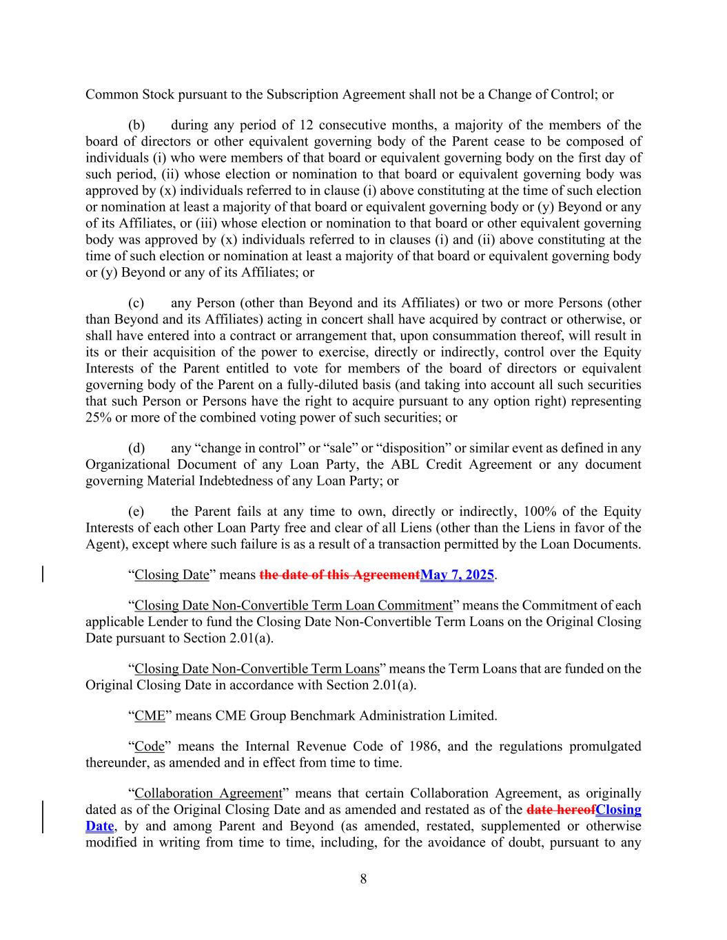 8 Common Stock pursuant to the Subscription Agreement shall not be a Change of Control; or (b) during any period of 12 consecutive months, a majority of the members of the board of directors or other equivalent governing body of the Parent cease to be composed of individuals (i) who were members of that board or equivalent governing body on the first day of such period, (ii) whose election or nomination to that board or equivalent governing body was approved by (x) individuals referred to in clause (i) above constituting at the time of such election or nomination at least a majority of that board or equivalent governing body or (y) Beyond or any of its Affiliates, or (iii) whose election or nomination to that board or other equivalent governing body was approved by (x) individuals referred to in clauses (i) and (ii) above constituting at the time of such election or nomination at least a majority of that board or equivalent governing body or (y) Beyond or any of its Affiliates; or (c) any Person (other than Beyond and its Affiliates) or two or more Persons (other than Beyond and its Affiliates) acting in concert shall have acquired by contract or otherwise, or shall have entered into a contract or arrangement that, upon consummation thereof, will result in its or their acquisition of the power to exercise, directly or indirectly, control over the Equity Interests of the Parent entitled to vote for members of the board of directors or equivalent governing body of the Parent on a fully-diluted basis (and taking into account all such securities that such Person or Persons have the right to acquire pursuant to any option right) representing 25% or more of the combined voting power of such securities; or (d) any “change in control” or “sale” or “disposition” or similar event as defined in any Organizational Document of any Loan Party, the ABL Credit Agreement or any document governing Material Indebtedness of any Loan Party; or (e) the Parent fails at any time to own, directly or indirectly, 100% of the Equity Interests of each other Loan Party free and clear of all Liens (other than the Liens in favor of the Agent), except where such failure is as a result of a transaction permitted by the Loan Documents. “Closing Date” means the date of this AgreementMay 7, 2025. “Closing Date Non-Convertible Term Loan Commitment” means the Commitment of each applicable Lender to fund the Closing Date Non-Convertible Term Loans on the Original Closing Date pursuant to Section 2.01(a). “Closing Date Non-Convertible Term Loans” means the Term Loans that are funded on the Original Closing Date in accordance with Section 2.01(a). “CME” means CME Group Benchmark Administration Limited. “Code” means the Internal Revenue Code of 1986, and the regulations promulgated thereunder, as amended and in effect from time to time. “Collaboration Agreement” means that certain Collaboration Agreement, as originally dated as of the Original Closing Date and as amended and restated as of the date hereofClosing Date, by and among Parent and Beyond (as amended, restated, supplemented or otherwise modified in writing from time to time, including, for the avoidance of doubt, pursuant to any