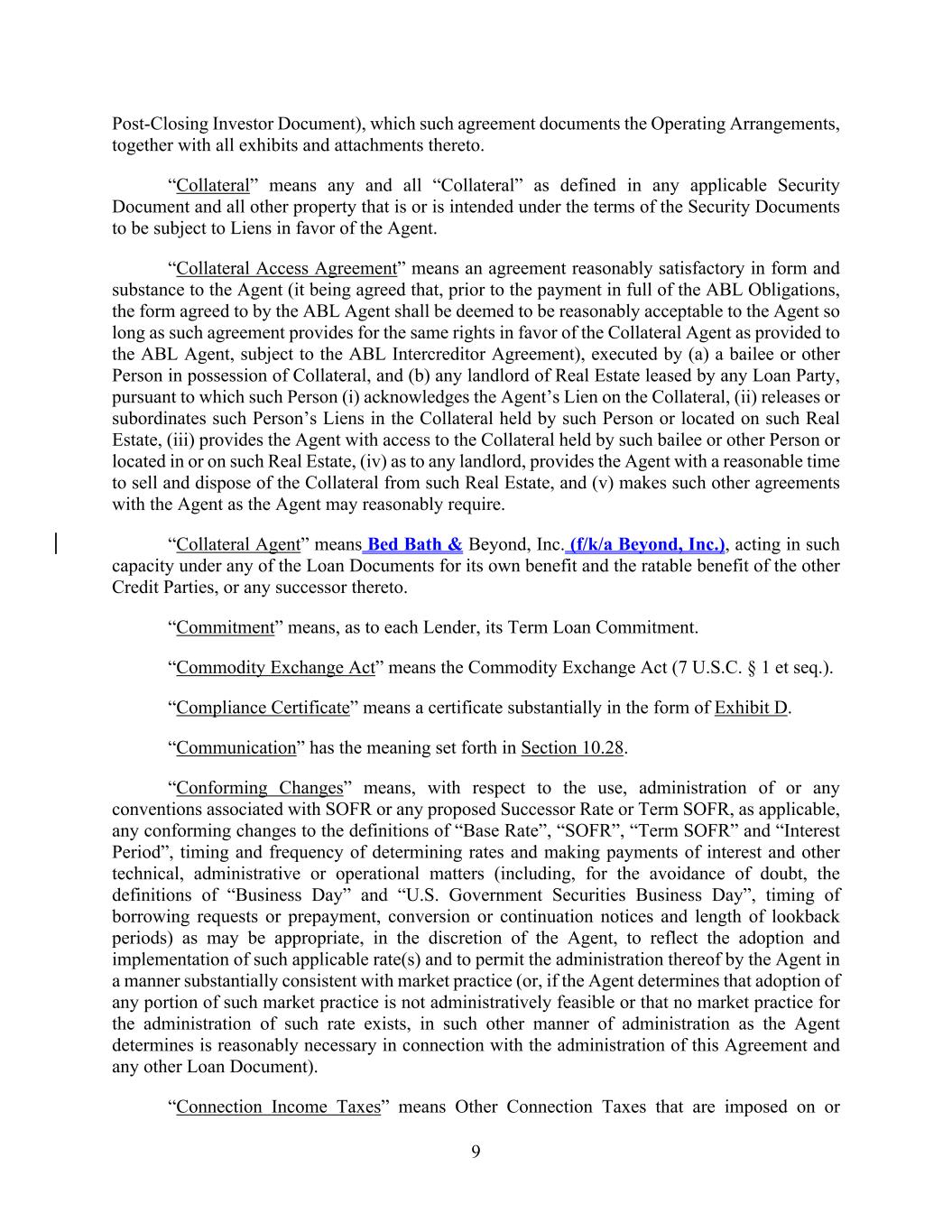 9 Post-Closing Investor Document), which such agreement documents the Operating Arrangements, together with all exhibits and attachments thereto. “Collateral” means any and all “Collateral” as defined in any applicable Security Document and all other property that is or is intended under the terms of the Security Documents to be subject to Liens in favor of the Agent. “Collateral Access Agreement” means an agreement reasonably satisfactory in form and substance to the Agent (it being agreed that, prior to the payment in full of the ABL Obligations, the form agreed to by the ABL Agent shall be deemed to be reasonably acceptable to the Agent so long as such agreement provides for the same rights in favor of the Collateral Agent as provided to the ABL Agent, subject to the ABL Intercreditor Agreement), executed by (a) a bailee or other Person in possession of Collateral, and (b) any landlord of Real Estate leased by any Loan Party, pursuant to which such Person (i) acknowledges the Agent’s Lien on the Collateral, (ii) releases or subordinates such Person’s Liens in the Collateral held by such Person or located on such Real Estate, (iii) provides the Agent with access to the Collateral held by such bailee or other Person or located in or on such Real Estate, (iv) as to any landlord, provides the Agent with a reasonable time to sell and dispose of the Collateral from such Real Estate, and (v) makes such other agreements with the Agent as the Agent may reasonably require. “Collateral Agent” means Bed Bath & Beyond, Inc. (f/k/a Beyond, Inc.), acting in such capacity under any of the Loan Documents for its own benefit and the ratable benefit of the other Credit Parties, or any successor thereto. “Commitment” means, as to each Lender, its Term Loan Commitment. “Commodity Exchange Act” means the Commodity Exchange Act (7 U.S.C. § 1 et seq.). “Compliance Certificate” means a certificate substantially in the form of Exhibit D. “Communication” has the meaning set forth in Section 10.28. “Conforming Changes” means, with respect to the use, administration of or any conventions associated with SOFR or any proposed Successor Rate or Term SOFR, as applicable, any conforming changes to the definitions of “Base Rate”, “SOFR”, “Term SOFR” and “Interest Period”, timing and frequency of determining rates and making payments of interest and other technical, administrative or operational matters (including, for the avoidance of doubt, the definitions of “Business Day” and “U.S. Government Securities Business Day”, timing of borrowing requests or prepayment, conversion or continuation notices and length of lookback periods) as may be appropriate, in the discretion of the Agent, to reflect the adoption and implementation of such applicable rate(s) and to permit the administration thereof by the Agent in a manner substantially consistent with market practice (or, if the Agent determines that adoption of any portion of such market practice is not administratively feasible or that no market practice for the administration of such rate exists, in such other manner of administration as the Agent determines is reasonably necessary in connection with the administration of this Agreement and any other Loan Document). “Connection Income Taxes” means Other Connection Taxes that are imposed on or