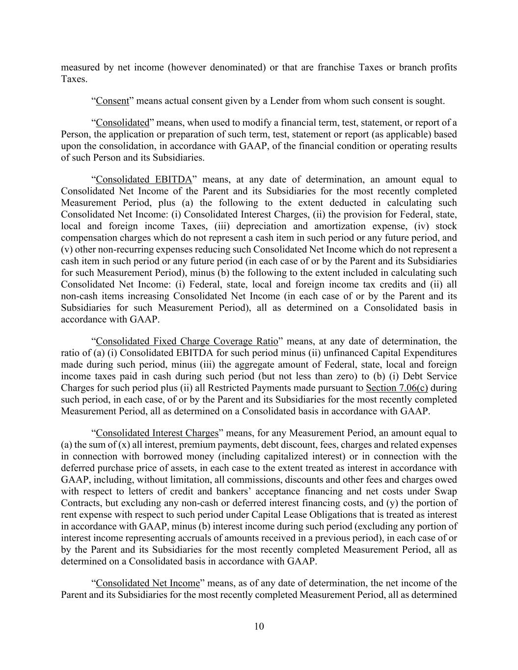 10 measured by net income (however denominated) or that are franchise Taxes or branch profits Taxes. “Consent” means actual consent given by a Lender from whom such consent is sought. “Consolidated” means, when used to modify a financial term, test, statement, or report of a Person, the application or preparation of such term, test, statement or report (as applicable) based upon the consolidation, in accordance with GAAP, of the financial condition or operating results of such Person and its Subsidiaries. “Consolidated EBITDA” means, at any date of determination, an amount equal to Consolidated Net Income of the Parent and its Subsidiaries for the most recently completed Measurement Period, plus (a) the following to the extent deducted in calculating such Consolidated Net Income: (i) Consolidated Interest Charges, (ii) the provision for Federal, state, local and foreign income Taxes, (iii) depreciation and amortization expense, (iv) stock compensation charges which do not represent a cash item in such period or any future period, and (v) other non-recurring expenses reducing such Consolidated Net Income which do not represent a cash item in such period or any future period (in each case of or by the Parent and its Subsidiaries for such Measurement Period), minus (b) the following to the extent included in calculating such Consolidated Net Income: (i) Federal, state, local and foreign income tax credits and (ii) all non-cash items increasing Consolidated Net Income (in each case of or by the Parent and its Subsidiaries for such Measurement Period), all as determined on a Consolidated basis in accordance with GAAP. “Consolidated Fixed Charge Coverage Ratio” means, at any date of determination, the ratio of (a) (i) Consolidated EBITDA for such period minus (ii) unfinanced Capital Expenditures made during such period, minus (iii) the aggregate amount of Federal, state, local and foreign income taxes paid in cash during such period (but not less than zero) to (b) (i) Debt Service Charges for such period plus (ii) all Restricted Payments made pursuant to Section 7.06(c) during such period, in each case, of or by the Parent and its Subsidiaries for the most recently completed Measurement Period, all as determined on a Consolidated basis in accordance with GAAP. “Consolidated Interest Charges” means, for any Measurement Period, an amount equal to (a) the sum of (x) all interest, premium payments, debt discount, fees, charges and related expenses in connection with borrowed money (including capitalized interest) or in connection with the deferred purchase price of assets, in each case to the extent treated as interest in accordance with GAAP, including, without limitation, all commissions, discounts and other fees and charges owed with respect to letters of credit and bankers’ acceptance financing and net costs under Swap Contracts, but excluding any non-cash or deferred interest financing costs, and (y) the portion of rent expense with respect to such period under Capital Lease Obligations that is treated as interest in accordance with GAAP, minus (b) interest income during such period (excluding any portion of interest income representing accruals of amounts received in a previous period), in each case of or by the Parent and its Subsidiaries for the most recently completed Measurement Period, all as determined on a Consolidated basis in accordance with GAAP. “Consolidated Net Income” means, as of any date of determination, the net income of the Parent and its Subsidiaries for the most recently completed Measurement Period, all as determined