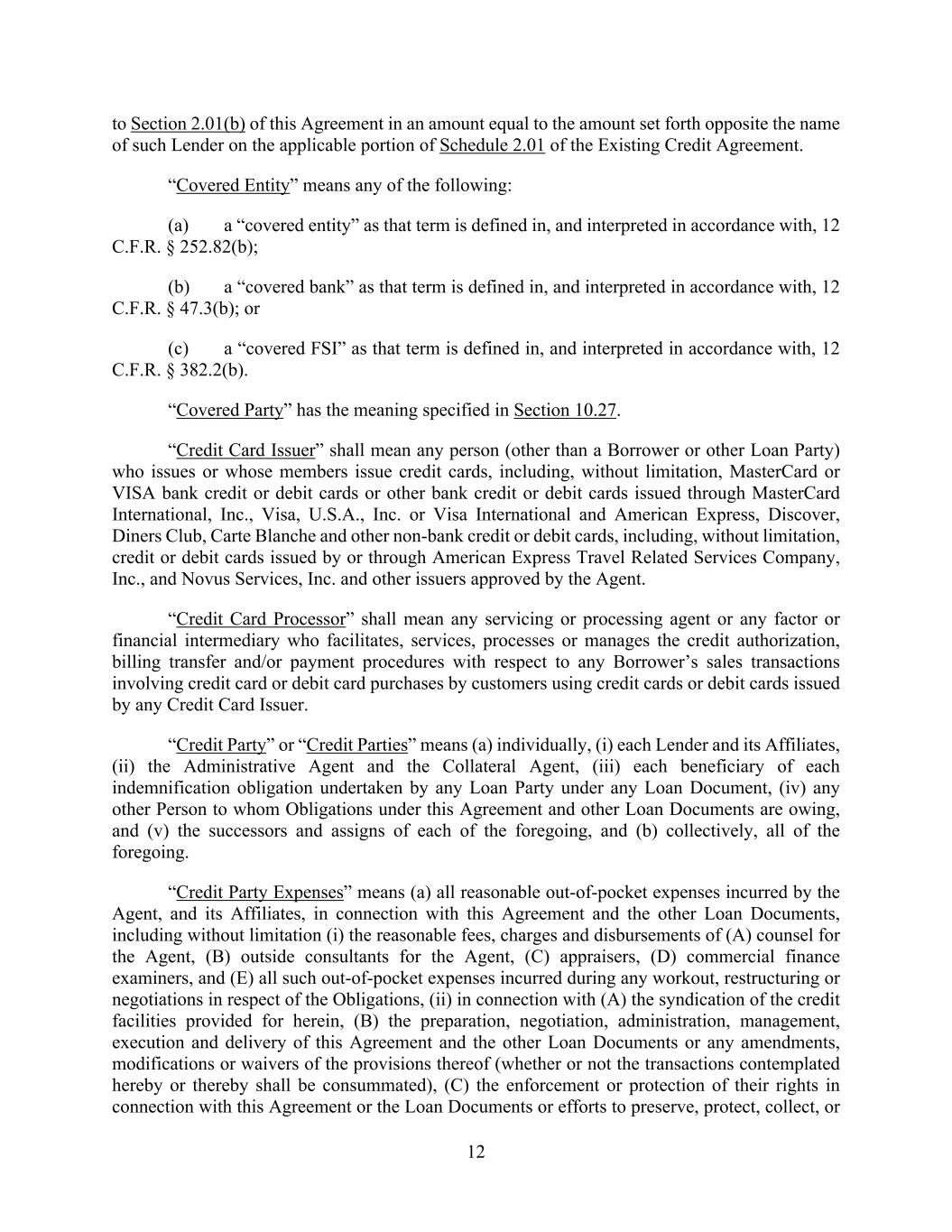 12 to Section 2.01(b) of this Agreement in an amount equal to the amount set forth opposite the name of such Lender on the applicable portion of Schedule 2.01 of the Existing Credit Agreement. “Covered Entity” means any of the following: (a) a “covered entity” as that term is defined in, and interpreted in accordance with, 12 C.F.R. § 252.82(b); (b) a “covered bank” as that term is defined in, and interpreted in accordance with, 12 C.F.R. § 47.3(b); or (c) a “covered FSI” as that term is defined in, and interpreted in accordance with, 12 C.F.R. § 382.2(b). “Covered Party” has the meaning specified in Section 10.27. “Credit Card Issuer” shall mean any person (other than a Borrower or other Loan Party) who issues or whose members issue credit cards, including, without limitation, MasterCard or VISA bank credit or debit cards or other bank credit or debit cards issued through MasterCard International, Inc., Visa, U.S.A., Inc. or Visa International and American Express, Discover, Diners Club, Carte Blanche and other non-bank credit or debit cards, including, without limitation, credit or debit cards issued by or through American Express Travel Related Services Company, Inc., and Novus Services, Inc. and other issuers approved by the Agent. “Credit Card Processor” shall mean any servicing or processing agent or any factor or financial intermediary who facilitates, services, processes or manages the credit authorization, billing transfer and/or payment procedures with respect to any Borrower’s sales transactions involving credit card or debit card purchases by customers using credit cards or debit cards issued by any Credit Card Issuer. “Credit Party” or “Credit Parties” means (a) individually, (i) each Lender and its Affiliates, (ii) the Administrative Agent and the Collateral Agent, (iii) each beneficiary of each indemnification obligation undertaken by any Loan Party under any Loan Document, (iv) any other Person to whom Obligations under this Agreement and other Loan Documents are owing, and (v) the successors and assigns of each of the foregoing, and (b) collectively, all of the foregoing. “Credit Party Expenses” means (a) all reasonable out-of-pocket expenses incurred by the Agent, and its Affiliates, in connection with this Agreement and the other Loan Documents, including without limitation (i) the reasonable fees, charges and disbursements of (A) counsel for the Agent, (B) outside consultants for the Agent, (C) appraisers, (D) commercial finance examiners, and (E) all such out-of-pocket expenses incurred during any workout, restructuring or negotiations in respect of the Obligations, (ii) in connection with (A) the syndication of the credit facilities provided for herein, (B) the preparation, negotiation, administration, management, execution and delivery of this Agreement and the other Loan Documents or any amendments, modifications or waivers of the provisions thereof (whether or not the transactions contemplated hereby or thereby shall be consummated), (C) the enforcement or protection of their rights in connection with this Agreement or the Loan Documents or efforts to preserve, protect, collect, or