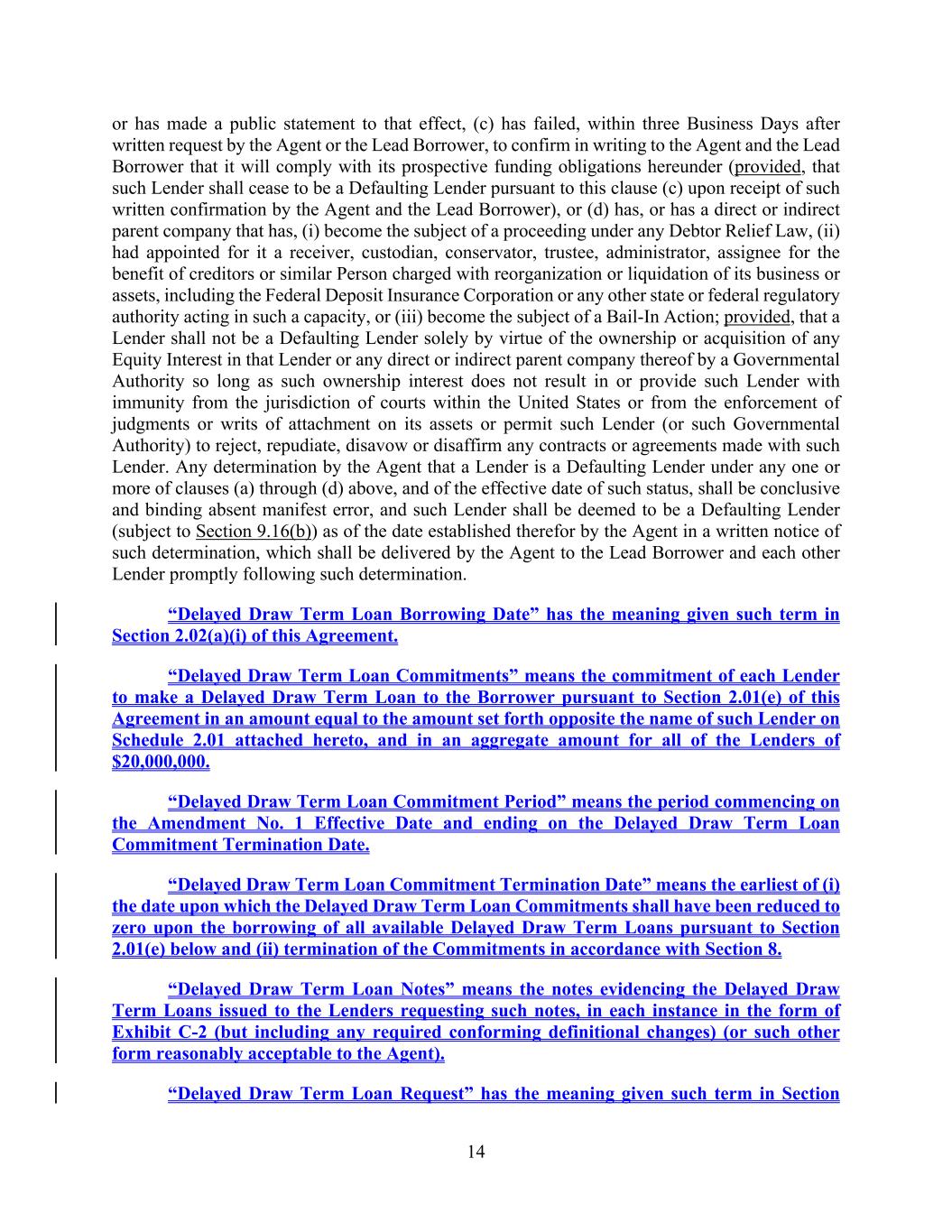 14 or has made a public statement to that effect, (c) has failed, within three Business Days after written request by the Agent or the Lead Borrower, to confirm in writing to the Agent and the Lead Borrower that it will comply with its prospective funding obligations hereunder (provided, that such Lender shall cease to be a Defaulting Lender pursuant to this clause (c) upon receipt of such written confirmation by the Agent and the Lead Borrower), or (d) has, or has a direct or indirect parent company that has, (i) become the subject of a proceeding under any Debtor Relief Law, (ii) had appointed for it a receiver, custodian, conservator, trustee, administrator, assignee for the benefit of creditors or similar Person charged with reorganization or liquidation of its business or assets, including the Federal Deposit Insurance Corporation or any other state or federal regulatory authority acting in such a capacity, or (iii) become the subject of a Bail-In Action; provided, that a Lender shall not be a Defaulting Lender solely by virtue of the ownership or acquisition of any Equity Interest in that Lender or any direct or indirect parent company thereof by a Governmental Authority so long as such ownership interest does not result in or provide such Lender with immunity from the jurisdiction of courts within the United States or from the enforcement of judgments or writs of attachment on its assets or permit such Lender (or such Governmental Authority) to reject, repudiate, disavow or disaffirm any contracts or agreements made with such Lender. Any determination by the Agent that a Lender is a Defaulting Lender under any one or more of clauses (a) through (d) above, and of the effective date of such status, shall be conclusive and binding absent manifest error, and such Lender shall be deemed to be a Defaulting Lender (subject to Section 9.16(b)) as of the date established therefor by the Agent in a written notice of such determination, which shall be delivered by the Agent to the Lead Borrower and each other Lender promptly following such determination. “Delayed Draw Term Loan Borrowing Date” has the meaning given such term in Section 2.02(a)(i) of this Agreement. “Delayed Draw Term Loan Commitments” means the commitment of each Lender to make a Delayed Draw Term Loan to the Borrower pursuant to Section 2.01(e) of this Agreement in an amount equal to the amount set forth opposite the name of such Lender on Schedule 2.01 attached hereto, and in an aggregate amount for all of the Lenders of $20,000,000. “Delayed Draw Term Loan Commitment Period” means the period commencing on the Amendment No. 1 Effective Date and ending on the Delayed Draw Term Loan Commitment Termination Date. “Delayed Draw Term Loan Commitment Termination Date” means the earliest of (i) the date upon which the Delayed Draw Term Loan Commitments shall have been reduced to zero upon the borrowing of all available Delayed Draw Term Loans pursuant to Section 2.01(e) below and (ii) termination of the Commitments in accordance with Section 8. “Delayed Draw Term Loan Notes” means the notes evidencing the Delayed Draw Term Loans issued to the Lenders requesting such notes, in each instance in the form of Exhibit C-2 (but including any required conforming definitional changes) (or such other form reasonably acceptable to the Agent). “Delayed Draw Term Loan Request” has the meaning given such term in Section