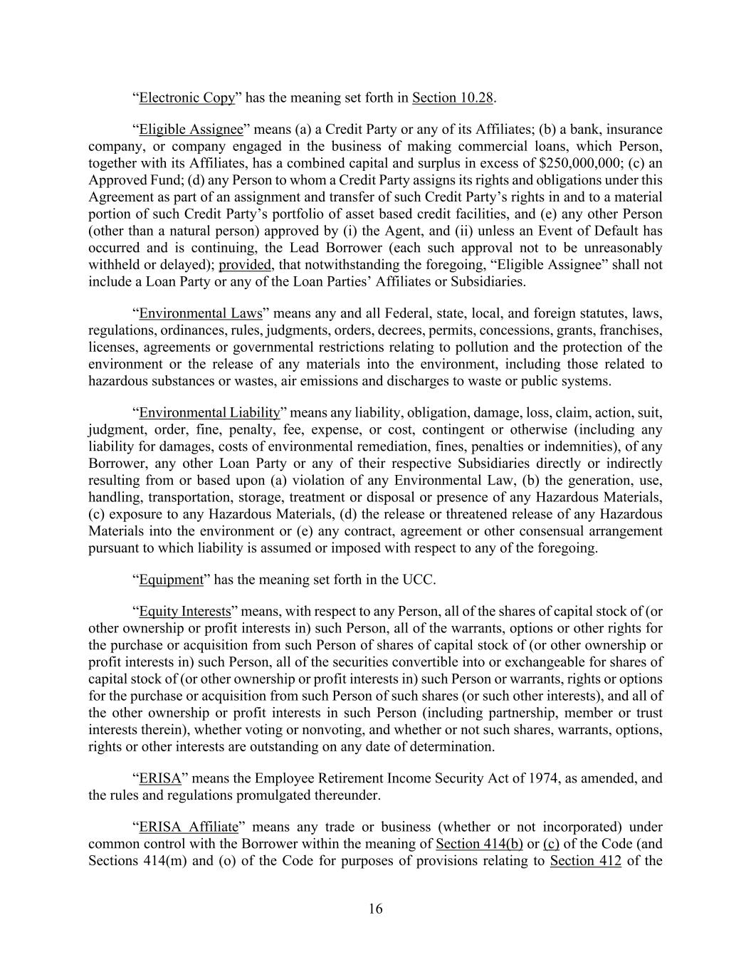16 “Electronic Copy” has the meaning set forth in Section 10.28. “Eligible Assignee” means (a) a Credit Party or any of its Affiliates; (b) a bank, insurance company, or company engaged in the business of making commercial loans, which Person, together with its Affiliates, has a combined capital and surplus in excess of $250,000,000; (c) an Approved Fund; (d) any Person to whom a Credit Party assigns its rights and obligations under this Agreement as part of an assignment and transfer of such Credit Party’s rights in and to a material portion of such Credit Party’s portfolio of asset based credit facilities, and (e) any other Person (other than a natural person) approved by (i) the Agent, and (ii) unless an Event of Default has occurred and is continuing, the Lead Borrower (each such approval not to be unreasonably withheld or delayed); provided, that notwithstanding the foregoing, “Eligible Assignee” shall not include a Loan Party or any of the Loan Parties’ Affiliates or Subsidiaries. “Environmental Laws” means any and all Federal, state, local, and foreign statutes, laws, regulations, ordinances, rules, judgments, orders, decrees, permits, concessions, grants, franchises, licenses, agreements or governmental restrictions relating to pollution and the protection of the environment or the release of any materials into the environment, including those related to hazardous substances or wastes, air emissions and discharges to waste or public systems. “Environmental Liability” means any liability, obligation, damage, loss, claim, action, suit, judgment, order, fine, penalty, fee, expense, or cost, contingent or otherwise (including any liability for damages, costs of environmental remediation, fines, penalties or indemnities), of any Borrower, any other Loan Party or any of their respective Subsidiaries directly or indirectly resulting from or based upon (a) violation of any Environmental Law, (b) the generation, use, handling, transportation, storage, treatment or disposal or presence of any Hazardous Materials, (c) exposure to any Hazardous Materials, (d) the release or threatened release of any Hazardous Materials into the environment or (e) any contract, agreement or other consensual arrangement pursuant to which liability is assumed or imposed with respect to any of the foregoing. “Equipment” has the meaning set forth in the UCC. “Equity Interests” means, with respect to any Person, all of the shares of capital stock of (or other ownership or profit interests in) such Person, all of the warrants, options or other rights for the purchase or acquisition from such Person of shares of capital stock of (or other ownership or profit interests in) such Person, all of the securities convertible into or exchangeable for shares of capital stock of (or other ownership or profit interests in) such Person or warrants, rights or options for the purchase or acquisition from such Person of such shares (or such other interests), and all of the other ownership or profit interests in such Person (including partnership, member or trust interests therein), whether voting or nonvoting, and whether or not such shares, warrants, options, rights or other interests are outstanding on any date of determination. “ERISA” means the Employee Retirement Income Security Act of 1974, as amended, and the rules and regulations promulgated thereunder. “ERISA Affiliate” means any trade or business (whether or not incorporated) under common control with the Borrower within the meaning of Section 414(b) or (c) of the Code (and Sections 414(m) and (o) of the Code for purposes of provisions relating to Section 412 of the