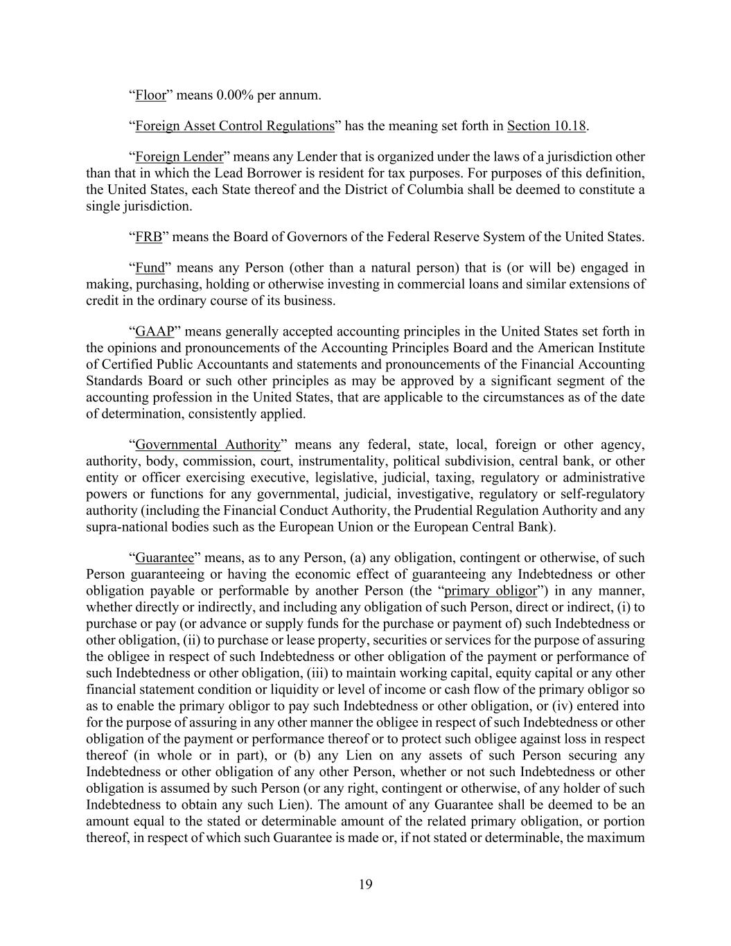 19 “Floor” means 0.00% per annum. “Foreign Asset Control Regulations” has the meaning set forth in Section 10.18. “Foreign Lender” means any Lender that is organized under the laws of a jurisdiction other than that in which the Lead Borrower is resident for tax purposes. For purposes of this definition, the United States, each State thereof and the District of Columbia shall be deemed to constitute a single jurisdiction. “FRB” means the Board of Governors of the Federal Reserve System of the United States. “Fund” means any Person (other than a natural person) that is (or will be) engaged in making, purchasing, holding or otherwise investing in commercial loans and similar extensions of credit in the ordinary course of its business. “GAAP” means generally accepted accounting principles in the United States set forth in the opinions and pronouncements of the Accounting Principles Board and the American Institute of Certified Public Accountants and statements and pronouncements of the Financial Accounting Standards Board or such other principles as may be approved by a significant segment of the accounting profession in the United States, that are applicable to the circumstances as of the date of determination, consistently applied. “Governmental Authority” means any federal, state, local, foreign or other agency, authority, body, commission, court, instrumentality, political subdivision, central bank, or other entity or officer exercising executive, legislative, judicial, taxing, regulatory or administrative powers or functions for any governmental, judicial, investigative, regulatory or self-regulatory authority (including the Financial Conduct Authority, the Prudential Regulation Authority and any supra-national bodies such as the European Union or the European Central Bank). “Guarantee” means, as to any Person, (a) any obligation, contingent or otherwise, of such Person guaranteeing or having the economic effect of guaranteeing any Indebtedness or other obligation payable or performable by another Person (the “primary obligor”) in any manner, whether directly or indirectly, and including any obligation of such Person, direct or indirect, (i) to purchase or pay (or advance or supply funds for the purchase or payment of) such Indebtedness or other obligation, (ii) to purchase or lease property, securities or services for the purpose of assuring the obligee in respect of such Indebtedness or other obligation of the payment or performance of such Indebtedness or other obligation, (iii) to maintain working capital, equity capital or any other financial statement condition or liquidity or level of income or cash flow of the primary obligor so as to enable the primary obligor to pay such Indebtedness or other obligation, or (iv) entered into for the purpose of assuring in any other manner the obligee in respect of such Indebtedness or other obligation of the payment or performance thereof or to protect such obligee against loss in respect thereof (in whole or in part), or (b) any Lien on any assets of such Person securing any Indebtedness or other obligation of any other Person, whether or not such Indebtedness or other obligation is assumed by such Person (or any right, contingent or otherwise, of any holder of such Indebtedness to obtain any such Lien). The amount of any Guarantee shall be deemed to be an amount equal to the stated or determinable amount of the related primary obligation, or portion thereof, in respect of which such Guarantee is made or, if not stated or determinable, the maximum