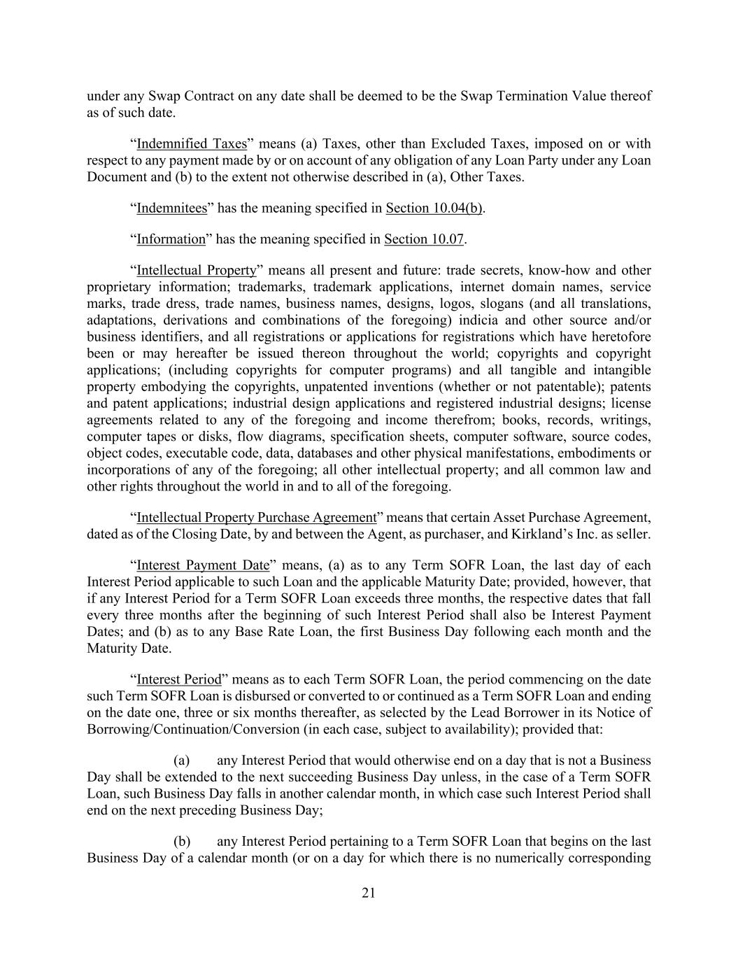 21 under any Swap Contract on any date shall be deemed to be the Swap Termination Value thereof as of such date. “Indemnified Taxes” means (a) Taxes, other than Excluded Taxes, imposed on or with respect to any payment made by or on account of any obligation of any Loan Party under any Loan Document and (b) to the extent not otherwise described in (a), Other Taxes. “Indemnitees” has the meaning specified in Section 10.04(b). “Information” has the meaning specified in Section 10.07. “Intellectual Property” means all present and future: trade secrets, know-how and other proprietary information; trademarks, trademark applications, internet domain names, service marks, trade dress, trade names, business names, designs, logos, slogans (and all translations, adaptations, derivations and combinations of the foregoing) indicia and other source and/or business identifiers, and all registrations or applications for registrations which have heretofore been or may hereafter be issued thereon throughout the world; copyrights and copyright applications; (including copyrights for computer programs) and all tangible and intangible property embodying the copyrights, unpatented inventions (whether or not patentable); patents and patent applications; industrial design applications and registered industrial designs; license agreements related to any of the foregoing and income therefrom; books, records, writings, computer tapes or disks, flow diagrams, specification sheets, computer software, source codes, object codes, executable code, data, databases and other physical manifestations, embodiments or incorporations of any of the foregoing; all other intellectual property; and all common law and other rights throughout the world in and to all of the foregoing. “Intellectual Property Purchase Agreement” means that certain Asset Purchase Agreement, dated as of the Closing Date, by and between the Agent, as purchaser, and Kirkland’s Inc. as seller. “Interest Payment Date” means, (a) as to any Term SOFR Loan, the last day of each Interest Period applicable to such Loan and the applicable Maturity Date; provided, however, that if any Interest Period for a Term SOFR Loan exceeds three months, the respective dates that fall every three months after the beginning of such Interest Period shall also be Interest Payment Dates; and (b) as to any Base Rate Loan, the first Business Day following each month and the Maturity Date. “Interest Period” means as to each Term SOFR Loan, the period commencing on the date such Term SOFR Loan is disbursed or converted to or continued as a Term SOFR Loan and ending on the date one, three or six months thereafter, as selected by the Lead Borrower in its Notice of Borrowing/Continuation/Conversion (in each case, subject to availability); provided that: (a) any Interest Period that would otherwise end on a day that is not a Business Day shall be extended to the next succeeding Business Day unless, in the case of a Term SOFR Loan, such Business Day falls in another calendar month, in which case such Interest Period shall end on the next preceding Business Day; (b) any Interest Period pertaining to a Term SOFR Loan that begins on the last Business Day of a calendar month (or on a day for which there is no numerically corresponding