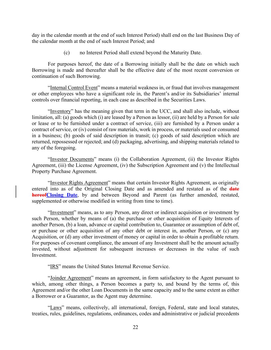 22 day in the calendar month at the end of such Interest Period) shall end on the last Business Day of the calendar month at the end of such Interest Period; and (c) no Interest Period shall extend beyond the Maturity Date. For purposes hereof, the date of a Borrowing initially shall be the date on which such Borrowing is made and thereafter shall be the effective date of the most recent conversion or continuation of such Borrowing. “Internal Control Event” means a material weakness in, or fraud that involves management or other employees who have a significant role in, the Parent’s and/or its Subsidiaries’ internal controls over financial reporting, in each case as described in the Securities Laws. “Inventory” has the meaning given that term in the UCC, and shall also include, without limitation, all: (a) goods which (i) are leased by a Person as lessor, (ii) are held by a Person for sale or lease or to be furnished under a contract of service, (iii) are furnished by a Person under a contract of service, or (iv) consist of raw materials, work in process, or materials used or consumed in a business; (b) goods of said description in transit; (c) goods of said description which are returned, repossessed or rejected; and (d) packaging, advertising, and shipping materials related to any of the foregoing. “Investor Documents” means (i) the Collaboration Agreement, (ii) the Investor Rights Agreement, (iii) the License Agreement, (iv) the Subscription Agreement and (v) the Intellectual Property Purchase Agreement. “Investor Rights Agreement” means that certain Investor Rights Agreement, as originally entered into as of the Original Closing Date and as amended and restated as of the date hereofClosing Date, by and between Beyond and Parent (as further amended, restated, supplemented or otherwise modified in writing from time to time). “Investment” means, as to any Person, any direct or indirect acquisition or investment by such Person, whether by means of (a) the purchase or other acquisition of Equity Interests of another Person, (b) a loan, advance or capital contribution to, Guarantee or assumption of debt of, or purchase or other acquisition of any other debt or interest in, another Person, or (c) any Acquisition, or (d) any other investment of money or capital in order to obtain a profitable return. For purposes of covenant compliance, the amount of any Investment shall be the amount actually invested, without adjustment for subsequent increases or decreases in the value of such Investment. “IRS” means the United States Internal Revenue Service. “Joinder Agreement” means an agreement, in form satisfactory to the Agent pursuant to which, among other things, a Person becomes a party to, and bound by the terms of, this Agreement and/or the other Loan Documents in the same capacity and to the same extent as either a Borrower or a Guarantor, as the Agent may determine. “Laws” means, collectively, all international, foreign, Federal, state and local statutes, treaties, rules, guidelines, regulations, ordinances, codes and administrative or judicial precedents