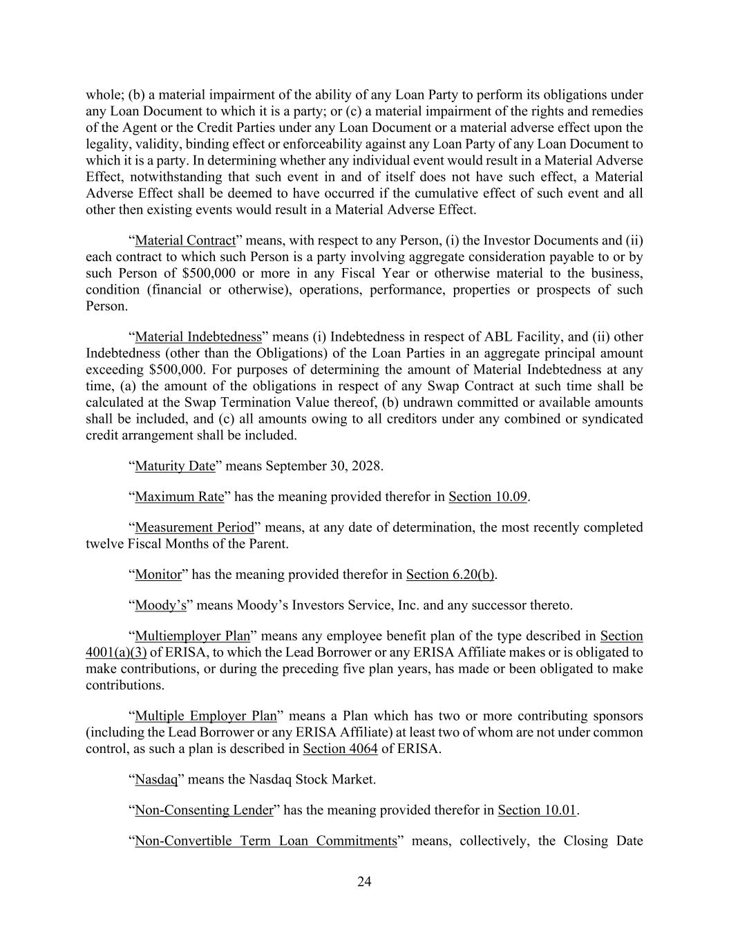 24 whole; (b) a material impairment of the ability of any Loan Party to perform its obligations under any Loan Document to which it is a party; or (c) a material impairment of the rights and remedies of the Agent or the Credit Parties under any Loan Document or a material adverse effect upon the legality, validity, binding effect or enforceability against any Loan Party of any Loan Document to which it is a party. In determining whether any individual event would result in a Material Adverse Effect, notwithstanding that such event in and of itself does not have such effect, a Material Adverse Effect shall be deemed to have occurred if the cumulative effect of such event and all other then existing events would result in a Material Adverse Effect. “Material Contract” means, with respect to any Person, (i) the Investor Documents and (ii) each contract to which such Person is a party involving aggregate consideration payable to or by such Person of $500,000 or more in any Fiscal Year or otherwise material to the business, condition (financial or otherwise), operations, performance, properties or prospects of such Person. “Material Indebtedness” means (i) Indebtedness in respect of ABL Facility, and (ii) other Indebtedness (other than the Obligations) of the Loan Parties in an aggregate principal amount exceeding $500,000. For purposes of determining the amount of Material Indebtedness at any time, (a) the amount of the obligations in respect of any Swap Contract at such time shall be calculated at the Swap Termination Value thereof, (b) undrawn committed or available amounts shall be included, and (c) all amounts owing to all creditors under any combined or syndicated credit arrangement shall be included. “Maturity Date” means September 30, 2028. “Maximum Rate” has the meaning provided therefor in Section 10.09. “Measurement Period” means, at any date of determination, the most recently completed twelve Fiscal Months of the Parent. “Monitor” has the meaning provided therefor in Section 6.20(b). “Moody’s” means Moody’s Investors Service, Inc. and any successor thereto. “Multiemployer Plan” means any employee benefit plan of the type described in Section 4001(a)(3) of ERISA, to which the Lead Borrower or any ERISA Affiliate makes or is obligated to make contributions, or during the preceding five plan years, has made or been obligated to make contributions. “Multiple Employer Plan” means a Plan which has two or more contributing sponsors (including the Lead Borrower or any ERISA Affiliate) at least two of whom are not under common control, as such a plan is described in Section 4064 of ERISA. “Nasdaq” means the Nasdaq Stock Market. “Non-Consenting Lender” has the meaning provided therefor in Section 10.01. “Non-Convertible Term Loan Commitments” means, collectively, the Closing Date