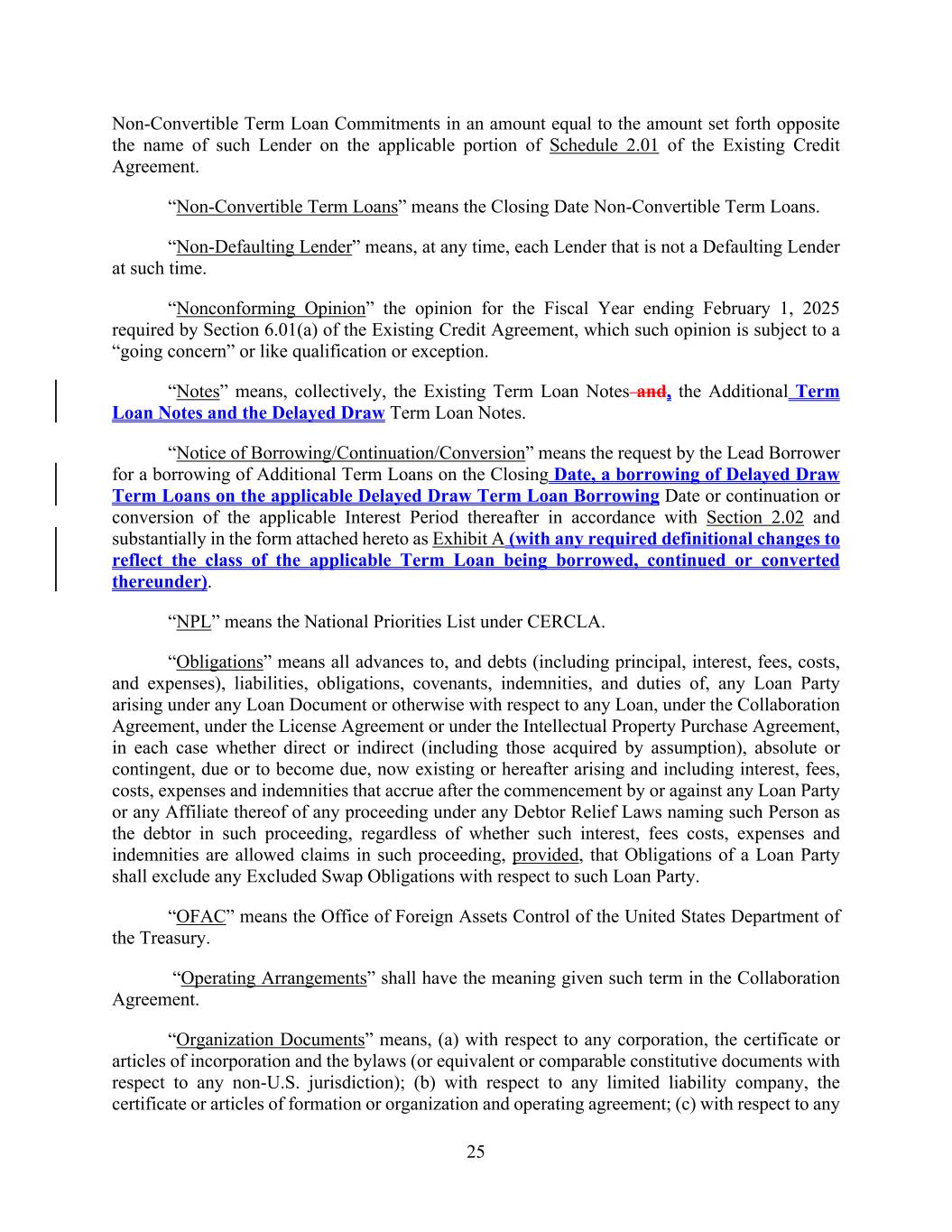 25 Non-Convertible Term Loan Commitments in an amount equal to the amount set forth opposite the name of such Lender on the applicable portion of Schedule 2.01 of the Existing Credit Agreement. “Non-Convertible Term Loans” means the Closing Date Non-Convertible Term Loans. “Non-Defaulting Lender” means, at any time, each Lender that is not a Defaulting Lender at such time. “Nonconforming Opinion” the opinion for the Fiscal Year ending February 1, 2025 required by Section 6.01(a) of the Existing Credit Agreement, which such opinion is subject to a “going concern” or like qualification or exception. “Notes” means, collectively, the Existing Term Loan Notes and, the Additional Term Loan Notes and the Delayed Draw Term Loan Notes. “Notice of Borrowing/Continuation/Conversion” means the request by the Lead Borrower for a borrowing of Additional Term Loans on the Closing Date, a borrowing of Delayed Draw Term Loans on the applicable Delayed Draw Term Loan Borrowing Date or continuation or conversion of the applicable Interest Period thereafter in accordance with Section 2.02 and substantially in the form attached hereto as Exhibit A (with any required definitional changes to reflect the class of the applicable Term Loan being borrowed, continued or converted thereunder). “NPL” means the National Priorities List under CERCLA. “Obligations” means all advances to, and debts (including principal, interest, fees, costs, and expenses), liabilities, obligations, covenants, indemnities, and duties of, any Loan Party arising under any Loan Document or otherwise with respect to any Loan, under the Collaboration Agreement, under the License Agreement or under the Intellectual Property Purchase Agreement, in each case whether direct or indirect (including those acquired by assumption), absolute or contingent, due or to become due, now existing or hereafter arising and including interest, fees, costs, expenses and indemnities that accrue after the commencement by or against any Loan Party or any Affiliate thereof of any proceeding under any Debtor Relief Laws naming such Person as the debtor in such proceeding, regardless of whether such interest, fees costs, expenses and indemnities are allowed claims in such proceeding, provided, that Obligations of a Loan Party shall exclude any Excluded Swap Obligations with respect to such Loan Party. “OFAC” means the Office of Foreign Assets Control of the United States Department of the Treasury. “Operating Arrangements” shall have the meaning given such term in the Collaboration Agreement. “Organization Documents” means, (a) with respect to any corporation, the certificate or articles of incorporation and the bylaws (or equivalent or comparable constitutive documents with respect to any non-U.S. jurisdiction); (b) with respect to any limited liability company, the certificate or articles of formation or organization and operating agreement; (c) with respect to any