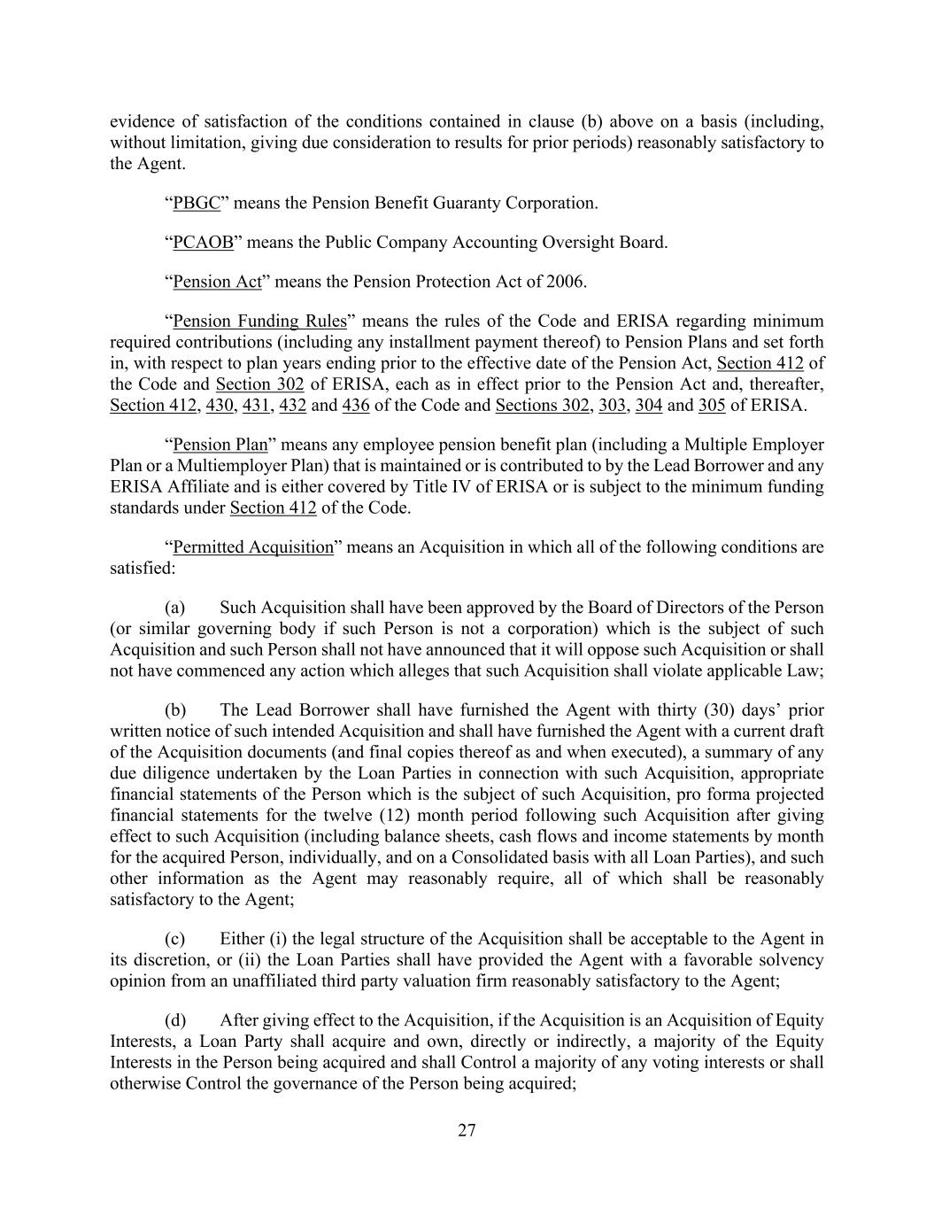 27 evidence of satisfaction of the conditions contained in clause (b) above on a basis (including, without limitation, giving due consideration to results for prior periods) reasonably satisfactory to the Agent. “PBGC” means the Pension Benefit Guaranty Corporation. “PCAOB” means the Public Company Accounting Oversight Board. “Pension Act” means the Pension Protection Act of 2006. “Pension Funding Rules” means the rules of the Code and ERISA regarding minimum required contributions (including any installment payment thereof) to Pension Plans and set forth in, with respect to plan years ending prior to the effective date of the Pension Act, Section 412 of the Code and Section 302 of ERISA, each as in effect prior to the Pension Act and, thereafter, Section 412, 430, 431, 432 and 436 of the Code and Sections 302, 303, 304 and 305 of ERISA. “Pension Plan” means any employee pension benefit plan (including a Multiple Employer Plan or a Multiemployer Plan) that is maintained or is contributed to by the Lead Borrower and any ERISA Affiliate and is either covered by Title IV of ERISA or is subject to the minimum funding standards under Section 412 of the Code. “Permitted Acquisition” means an Acquisition in which all of the following conditions are satisfied: (a) Such Acquisition shall have been approved by the Board of Directors of the Person (or similar governing body if such Person is not a corporation) which is the subject of such Acquisition and such Person shall not have announced that it will oppose such Acquisition or shall not have commenced any action which alleges that such Acquisition shall violate applicable Law; (b) The Lead Borrower shall have furnished the Agent with thirty (30) days’ prior written notice of such intended Acquisition and shall have furnished the Agent with a current draft of the Acquisition documents (and final copies thereof as and when executed), a summary of any due diligence undertaken by the Loan Parties in connection with such Acquisition, appropriate financial statements of the Person which is the subject of such Acquisition, pro forma projected financial statements for the twelve (12) month period following such Acquisition after giving effect to such Acquisition (including balance sheets, cash flows and income statements by month for the acquired Person, individually, and on a Consolidated basis with all Loan Parties), and such other information as the Agent may reasonably require, all of which shall be reasonably satisfactory to the Agent; (c) Either (i) the legal structure of the Acquisition shall be acceptable to the Agent in its discretion, or (ii) the Loan Parties shall have provided the Agent with a favorable solvency opinion from an unaffiliated third party valuation firm reasonably satisfactory to the Agent; (d) After giving effect to the Acquisition, if the Acquisition is an Acquisition of Equity Interests, a Loan Party shall acquire and own, directly or indirectly, a majority of the Equity Interests in the Person being acquired and shall Control a majority of any voting interests or shall otherwise Control the governance of the Person being acquired;