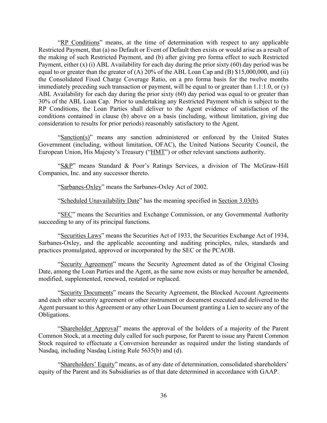 36 “RP Conditions” means, at the time of determination with respect to any applicable Restricted Payment, that (a) no Default or Event of Default then exists or would arise as a result of the making of such Restricted Payment, and (b) after giving pro forma effect to such Restricted Payment, either (x) (i) ABL Availability for each day during the prior sixty (60) day period was be equal to or greater than the greater of (A) 20% of the ABL Loan Cap and (B) $15,000,000, and (ii) the Consolidated Fixed Charge Coverage Ratio, on a pro forma basis for the twelve months immediately preceding such transaction or payment, will be equal to or greater than 1.1:1.0, or (y) ABL Availability for each day during the prior sixty (60) day period was equal to or greater than 30% of the ABL Loan Cap. Prior to undertaking any Restricted Payment which is subject to the RP Conditions, the Loan Parties shall deliver to the Agent evidence of satisfaction of the conditions contained in clause (b) above on a basis (including, without limitation, giving due consideration to results for prior periods) reasonably satisfactory to the Agent. “Sanction(s)” means any sanction administered or enforced by the United States Government (including, without limitation, OFAC), the United Nations Security Council, the European Union, His Majesty’s Treasury (“HMT”) or other relevant sanctions authority. “S&P” means Standard & Poor’s Ratings Services, a division of The McGraw-Hill Companies, Inc. and any successor thereto. “Sarbanes-Oxley” means the Sarbanes-Oxley Act of 2002. “Scheduled Unavailability Date” has the meaning specified in Section 3.03(b). “SEC” means the Securities and Exchange Commission, or any Governmental Authority succeeding to any of its principal functions. “Securities Laws” means the Securities Act of 1933, the Securities Exchange Act of 1934, Sarbanes-Oxley, and the applicable accounting and auditing principles, rules, standards and practices promulgated, approved or incorporated by the SEC or the PCAOB. “Security Agreement” means the Security Agreement dated as of the Original Closing Date, among the Loan Parties and the Agent, as the same now exists or may hereafter be amended, modified, supplemented, renewed, restated or replaced. “Security Documents” means the Security Agreement, the Blocked Account Agreements and each other security agreement or other instrument or document executed and delivered to the Agent pursuant to this Agreement or any other Loan Document granting a Lien to secure any of the Obligations. “Shareholder Approval” means the approval of the holders of a majority of the Parent Common Stock, at a meeting duly called for such purpose, for Parent to issue any Parent Common Stock required to effectuate a Conversion hereunder as required under the listing standards of Nasdaq, including Nasdaq Listing Rule 5635(b) and (d). “Shareholders’ Equity” means, as of any date of determination, consolidated shareholders’ equity of the Parent and its Subsidiaries as of that date determined in accordance with GAAP.