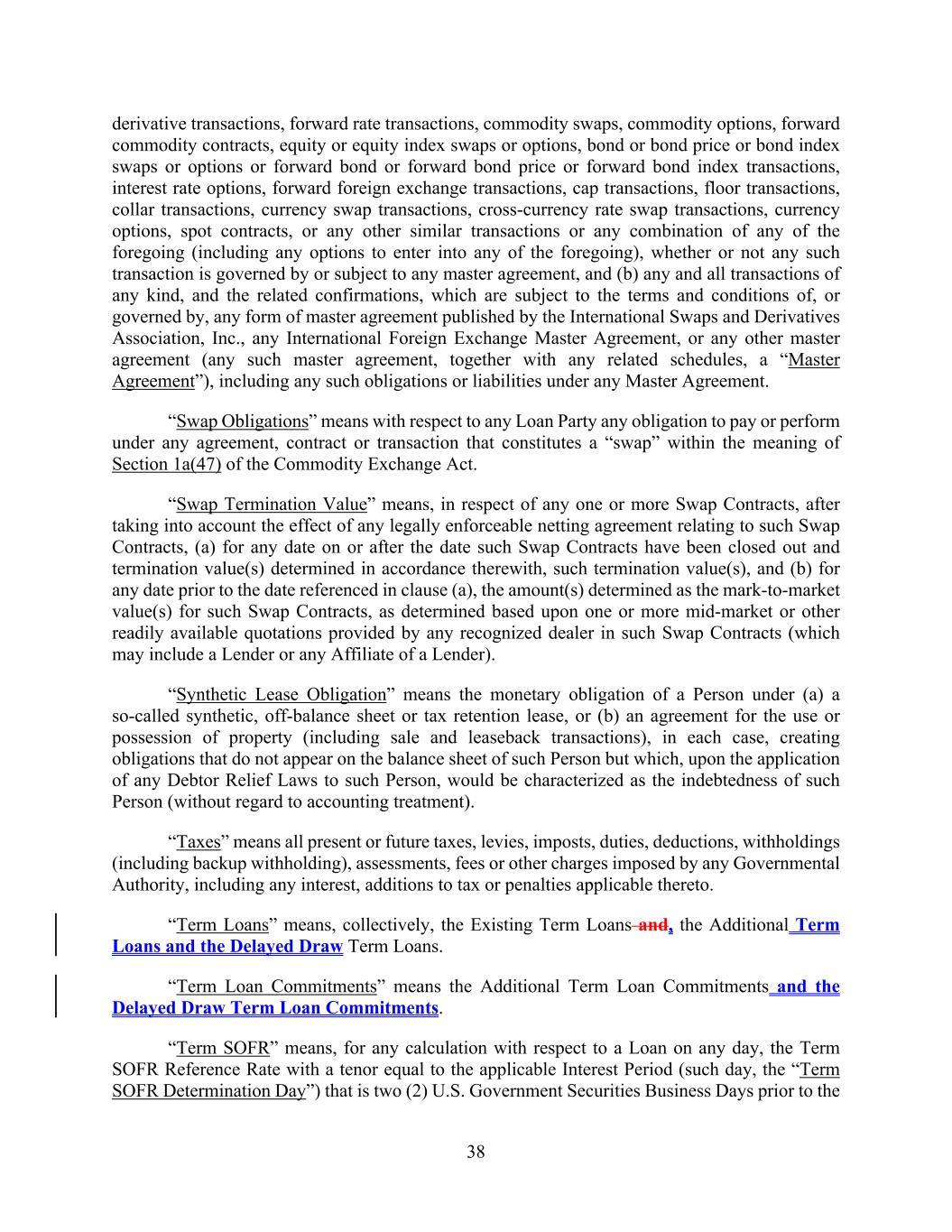 38 derivative transactions, forward rate transactions, commodity swaps, commodity options, forward commodity contracts, equity or equity index swaps or options, bond or bond price or bond index swaps or options or forward bond or forward bond price or forward bond index transactions, interest rate options, forward foreign exchange transactions, cap transactions, floor transactions, collar transactions, currency swap transactions, cross-currency rate swap transactions, currency options, spot contracts, or any other similar transactions or any combination of any of the foregoing (including any options to enter into any of the foregoing), whether or not any such transaction is governed by or subject to any master agreement, and (b) any and all transactions of any kind, and the related confirmations, which are subject to the terms and conditions of, or governed by, any form of master agreement published by the International Swaps and Derivatives Association, Inc., any International Foreign Exchange Master Agreement, or any other master agreement (any such master agreement, together with any related schedules, a “Master Agreement”), including any such obligations or liabilities under any Master Agreement. “Swap Obligations” means with respect to any Loan Party any obligation to pay or perform under any agreement, contract or transaction that constitutes a “swap” within the meaning of Section 1a(47) of the Commodity Exchange Act. “Swap Termination Value” means, in respect of any one or more Swap Contracts, after taking into account the effect of any legally enforceable netting agreement relating to such Swap Contracts, (a) for any date on or after the date such Swap Contracts have been closed out and termination value(s) determined in accordance therewith, such termination value(s), and (b) for any date prior to the date referenced in clause (a), the amount(s) determined as the mark-to-market value(s) for such Swap Contracts, as determined based upon one or more mid-market or other readily available quotations provided by any recognized dealer in such Swap Contracts (which may include a Lender or any Affiliate of a Lender). “Synthetic Lease Obligation” means the monetary obligation of a Person under (a) a so-called synthetic, off-balance sheet or tax retention lease, or (b) an agreement for the use or possession of property (including sale and leaseback transactions), in each case, creating obligations that do not appear on the balance sheet of such Person but which, upon the application of any Debtor Relief Laws to such Person, would be characterized as the indebtedness of such Person (without regard to accounting treatment). “Taxes” means all present or future taxes, levies, imposts, duties, deductions, withholdings (including backup withholding), assessments, fees or other charges imposed by any Governmental Authority, including any interest, additions to tax or penalties applicable thereto. “Term Loans” means, collectively, the Existing Term Loans and, the Additional Term Loans and the Delayed Draw Term Loans. “Term Loan Commitments” means the Additional Term Loan Commitments and the Delayed Draw Term Loan Commitments. “Term SOFR” means, for any calculation with respect to a Loan on any day, the Term SOFR Reference Rate with a tenor equal to the applicable Interest Period (such day, the “Term SOFR Determination Day”) that is two (2) U.S. Government Securities Business Days prior to the