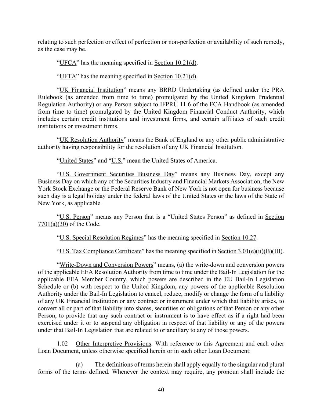 40 relating to such perfection or effect of perfection or non-perfection or availability of such remedy, as the case may be. “UFCA” has the meaning specified in Section 10.21(d). “UFTA” has the meaning specified in Section 10.21(d). “UK Financial Institution” means any BRRD Undertaking (as defined under the PRA Rulebook (as amended from time to time) promulgated by the United Kingdom Prudential Regulation Authority) or any Person subject to IFPRU 11.6 of the FCA Handbook (as amended from time to time) promulgated by the United Kingdom Financial Conduct Authority, which includes certain credit institutions and investment firms, and certain affiliates of such credit institutions or investment firms. “UK Resolution Authority” means the Bank of England or any other public administrative authority having responsibility for the resolution of any UK Financial Institution. “United States” and “U.S.” mean the United States of America. “U.S. Government Securities Business Day” means any Business Day, except any Business Day on which any of the Securities Industry and Financial Markets Association, the New York Stock Exchange or the Federal Reserve Bank of New York is not open for business because such day is a legal holiday under the federal laws of the United States or the laws of the State of New York, as applicable. “U.S. Person” means any Person that is a “United States Person” as defined in Section 7701(a)(30) of the Code. “U.S. Special Resolution Regimes” has the meaning specified in Section 10.27. “U.S. Tax Compliance Certificate” has the meaning specified in Section 3.01(e)(ii)(B)(III). “Write-Down and Conversion Powers” means, (a) the write-down and conversion powers of the applicable EEA Resolution Authority from time to time under the Bail-In Legislation for the applicable EEA Member Country, which powers are described in the EU Bail-In Legislation Schedule or (b) with respect to the United Kingdom, any powers of the applicable Resolution Authority under the Bail-In Legislation to cancel, reduce, modify or change the form of a liability of any UK Financial Institution or any contract or instrument under which that liability arises, to convert all or part of that liability into shares, securities or obligations of that Person or any other Person, to provide that any such contract or instrument is to have effect as if a right had been exercised under it or to suspend any obligation in respect of that liability or any of the powers under that Bail-In Legislation that are related to or ancillary to any of those powers. 1.02 Other Interpretive Provisions. With reference to this Agreement and each other Loan Document, unless otherwise specified herein or in such other Loan Document: (a) The definitions of terms herein shall apply equally to the singular and plural forms of the terms defined. Whenever the context may require, any pronoun shall include the