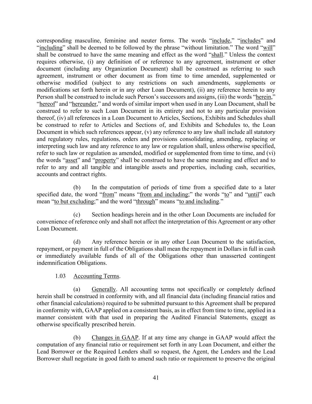 41 corresponding masculine, feminine and neuter forms. The words “include,” “includes” and “including” shall be deemed to be followed by the phrase “without limitation.” The word “will” shall be construed to have the same meaning and effect as the word “shall.” Unless the context requires otherwise, (i) any definition of or reference to any agreement, instrument or other document (including any Organization Document) shall be construed as referring to such agreement, instrument or other document as from time to time amended, supplemented or otherwise modified (subject to any restrictions on such amendments, supplements or modifications set forth herein or in any other Loan Document), (ii) any reference herein to any Person shall be construed to include such Person’s successors and assigns, (iii) the words “herein,” “hereof” and “hereunder,” and words of similar import when used in any Loan Document, shall be construed to refer to such Loan Document in its entirety and not to any particular provision thereof, (iv) all references in a Loan Document to Articles, Sections, Exhibits and Schedules shall be construed to refer to Articles and Sections of, and Exhibits and Schedules to, the Loan Document in which such references appear, (v) any reference to any law shall include all statutory and regulatory rules, regulations, orders and provisions consolidating, amending, replacing or interpreting such law and any reference to any law or regulation shall, unless otherwise specified, refer to such law or regulation as amended, modified or supplemented from time to time, and (vi) the words “asset” and “property” shall be construed to have the same meaning and effect and to refer to any and all tangible and intangible assets and properties, including cash, securities, accounts and contract rights. (b) In the computation of periods of time from a specified date to a later specified date, the word “from” means “from and including;” the words “to” and “until” each mean “to but excluding;” and the word “through” means “to and including.” (c) Section headings herein and in the other Loan Documents are included for convenience of reference only and shall not affect the interpretation of this Agreement or any other Loan Document. (d) Any reference herein or in any other Loan Document to the satisfaction, repayment, or payment in full of the Obligations shall mean the repayment in Dollars in full in cash or immediately available funds of all of the Obligations other than unasserted contingent indemnification Obligations. 1.03 Accounting Terms. (a) Generally. All accounting terms not specifically or completely defined herein shall be construed in conformity with, and all financial data (including financial ratios and other financial calculations) required to be submitted pursuant to this Agreement shall be prepared in conformity with, GAAP applied on a consistent basis, as in effect from time to time, applied in a manner consistent with that used in preparing the Audited Financial Statements, except as otherwise specifically prescribed herein. (b) Changes in GAAP. If at any time any change in GAAP would affect the computation of any financial ratio or requirement set forth in any Loan Document, and either the Lead Borrower or the Required Lenders shall so request, the Agent, the Lenders and the Lead Borrower shall negotiate in good faith to amend such ratio or requirement to preserve the original