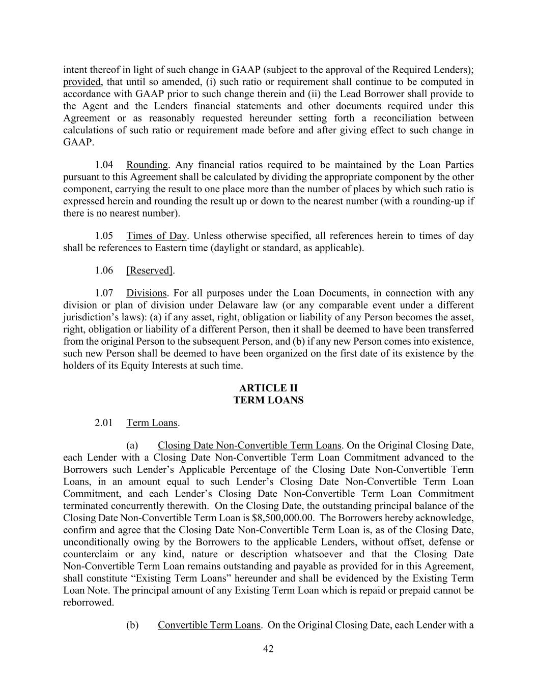 42 intent thereof in light of such change in GAAP (subject to the approval of the Required Lenders); provided, that until so amended, (i) such ratio or requirement shall continue to be computed in accordance with GAAP prior to such change therein and (ii) the Lead Borrower shall provide to the Agent and the Lenders financial statements and other documents required under this Agreement or as reasonably requested hereunder setting forth a reconciliation between calculations of such ratio or requirement made before and after giving effect to such change in GAAP. 1.04 Rounding. Any financial ratios required to be maintained by the Loan Parties pursuant to this Agreement shall be calculated by dividing the appropriate component by the other component, carrying the result to one place more than the number of places by which such ratio is expressed herein and rounding the result up or down to the nearest number (with a rounding-up if there is no nearest number). 1.05 Times of Day. Unless otherwise specified, all references herein to times of day shall be references to Eastern time (daylight or standard, as applicable). 1.06 [Reserved]. 1.07 Divisions. For all purposes under the Loan Documents, in connection with any division or plan of division under Delaware law (or any comparable event under a different jurisdiction’s laws): (a) if any asset, right, obligation or liability of any Person becomes the asset, right, obligation or liability of a different Person, then it shall be deemed to have been transferred from the original Person to the subsequent Person, and (b) if any new Person comes into existence, such new Person shall be deemed to have been organized on the first date of its existence by the holders of its Equity Interests at such time. ARTICLE II TERM LOANS 2.01 Term Loans. (a) Closing Date Non-Convertible Term Loans. On the Original Closing Date, each Lender with a Closing Date Non-Convertible Term Loan Commitment advanced to the Borrowers such Lender’s Applicable Percentage of the Closing Date Non-Convertible Term Loans, in an amount equal to such Lender’s Closing Date Non-Convertible Term Loan Commitment, and each Lender’s Closing Date Non-Convertible Term Loan Commitment terminated concurrently therewith. On the Closing Date, the outstanding principal balance of the Closing Date Non-Convertible Term Loan is $8,500,000.00. The Borrowers hereby acknowledge, confirm and agree that the Closing Date Non-Convertible Term Loan is, as of the Closing Date, unconditionally owing by the Borrowers to the applicable Lenders, without offset, defense or counterclaim or any kind, nature or description whatsoever and that the Closing Date Non-Convertible Term Loan remains outstanding and payable as provided for in this Agreement, shall constitute “Existing Term Loans” hereunder and shall be evidenced by the Existing Term Loan Note. The principal amount of any Existing Term Loan which is repaid or prepaid cannot be reborrowed. (b) Convertible Term Loans. On the Original Closing Date, each Lender with a