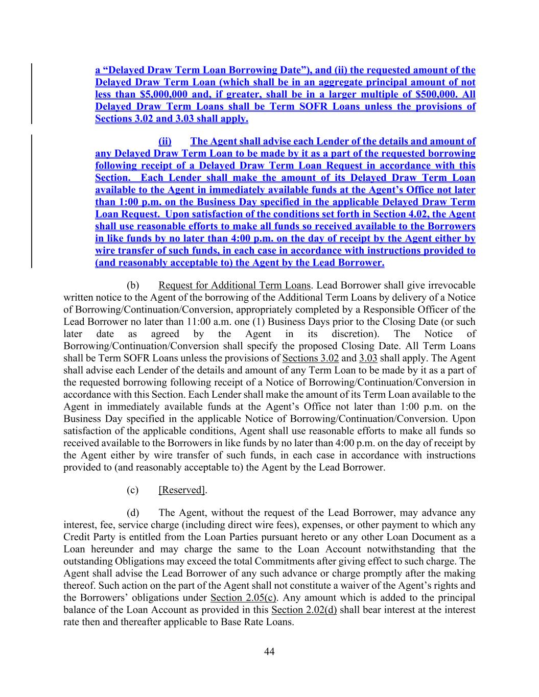 44 a “Delayed Draw Term Loan Borrowing Date”), and (ii) the requested amount of the Delayed Draw Term Loan (which shall be in an aggregate principal amount of not less than $5,000,000 and, if greater, shall be in a larger multiple of $500,000. All Delayed Draw Term Loans shall be Term SOFR Loans unless the provisions of Sections 3.02 and 3.03 shall apply. (ii) The Agent shall advise each Lender of the details and amount of any Delayed Draw Term Loan to be made by it as a part of the requested borrowing following receipt of a Delayed Draw Term Loan Request in accordance with this Section. Each Lender shall make the amount of its Delayed Draw Term Loan available to the Agent in immediately available funds at the Agent’s Office not later than 1:00 p.m. on the Business Day specified in the applicable Delayed Draw Term Loan Request. Upon satisfaction of the conditions set forth in Section 4.02, the Agent shall use reasonable efforts to make all funds so received available to the Borrowers in like funds by no later than 4:00 p.m. on the day of receipt by the Agent either by wire transfer of such funds, in each case in accordance with instructions provided to (and reasonably acceptable to) the Agent by the Lead Borrower. (b) Request for Additional Term Loans. Lead Borrower shall give irrevocable written notice to the Agent of the borrowing of the Additional Term Loans by delivery of a Notice of Borrowing/Continuation/Conversion, appropriately completed by a Responsible Officer of the Lead Borrower no later than 11:00 a.m. one (1) Business Days prior to the Closing Date (or such later date as agreed by the Agent in its discretion). The Notice of Borrowing/Continuation/Conversion shall specify the proposed Closing Date. All Term Loans shall be Term SOFR Loans unless the provisions of Sections 3.02 and 3.03 shall apply. The Agent shall advise each Lender of the details and amount of any Term Loan to be made by it as a part of the requested borrowing following receipt of a Notice of Borrowing/Continuation/Conversion in accordance with this Section. Each Lender shall make the amount of its Term Loan available to the Agent in immediately available funds at the Agent’s Office not later than 1:00 p.m. on the Business Day specified in the applicable Notice of Borrowing/Continuation/Conversion. Upon satisfaction of the applicable conditions, Agent shall use reasonable efforts to make all funds so received available to the Borrowers in like funds by no later than 4:00 p.m. on the day of receipt by the Agent either by wire transfer of such funds, in each case in accordance with instructions provided to (and reasonably acceptable to) the Agent by the Lead Borrower. (c) [Reserved]. (d) The Agent, without the request of the Lead Borrower, may advance any interest, fee, service charge (including direct wire fees), expenses, or other payment to which any Credit Party is entitled from the Loan Parties pursuant hereto or any other Loan Document as a Loan hereunder and may charge the same to the Loan Account notwithstanding that the outstanding Obligations may exceed the total Commitments after giving effect to such charge. The Agent shall advise the Lead Borrower of any such advance or charge promptly after the making thereof. Such action on the part of the Agent shall not constitute a waiver of the Agent’s rights and the Borrowers’ obligations under Section 2.05(c). Any amount which is added to the principal balance of the Loan Account as provided in this Section 2.02(d) shall bear interest at the interest rate then and thereafter applicable to Base Rate Loans.