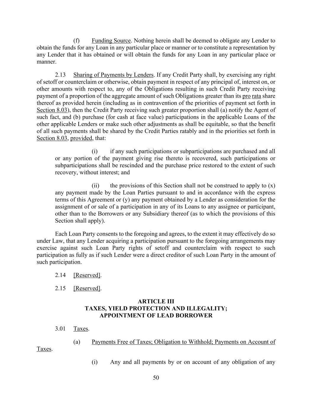 50 (f) Funding Source. Nothing herein shall be deemed to obligate any Lender to obtain the funds for any Loan in any particular place or manner or to constitute a representation by any Lender that it has obtained or will obtain the funds for any Loan in any particular place or manner. 2.13 Sharing of Payments by Lenders. If any Credit Party shall, by exercising any right of setoff or counterclaim or otherwise, obtain payment in respect of any principal of, interest on, or other amounts with respect to, any of the Obligations resulting in such Credit Party receiving payment of a proportion of the aggregate amount of such Obligations greater than its pro rata share thereof as provided herein (including as in contravention of the priorities of payment set forth in Section 8.03), then the Credit Party receiving such greater proportion shall (a) notify the Agent of such fact, and (b) purchase (for cash at face value) participations in the applicable Loans of the other applicable Lenders or make such other adjustments as shall be equitable, so that the benefit of all such payments shall be shared by the Credit Parties ratably and in the priorities set forth in Section 8.03, provided, that: (i) if any such participations or subparticipations are purchased and all or any portion of the payment giving rise thereto is recovered, such participations or subparticipations shall be rescinded and the purchase price restored to the extent of such recovery, without interest; and (ii) the provisions of this Section shall not be construed to apply to (x) any payment made by the Loan Parties pursuant to and in accordance with the express terms of this Agreement or (y) any payment obtained by a Lender as consideration for the assignment of or sale of a participation in any of its Loans to any assignee or participant, other than to the Borrowers or any Subsidiary thereof (as to which the provisions of this Section shall apply). Each Loan Party consents to the foregoing and agrees, to the extent it may effectively do so under Law, that any Lender acquiring a participation pursuant to the foregoing arrangements may exercise against such Loan Party rights of setoff and counterclaim with respect to such participation as fully as if such Lender were a direct creditor of such Loan Party in the amount of such participation. 2.14 [Reserved]. 2.15 [Reserved]. ARTICLE III TAXES, YIELD PROTECTION AND ILLEGALITY; APPOINTMENT OF LEAD BORROWER 3.01 Taxes. (a) Payments Free of Taxes; Obligation to Withhold; Payments on Account of Taxes. (i) Any and all payments by or on account of any obligation of any