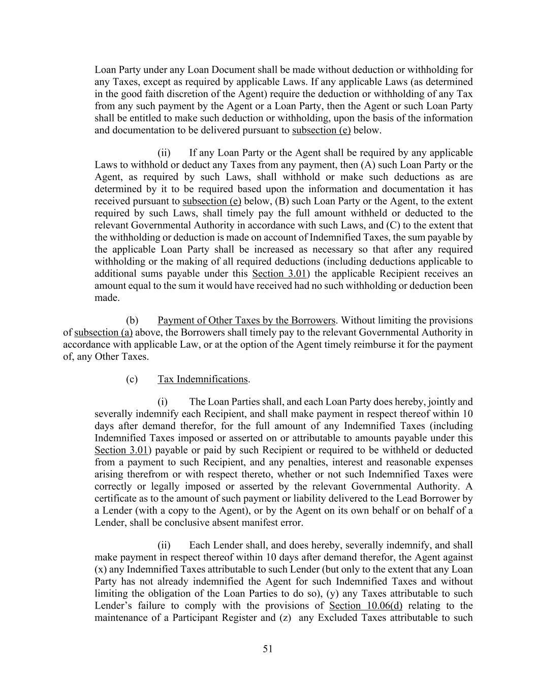 51 Loan Party under any Loan Document shall be made without deduction or withholding for any Taxes, except as required by applicable Laws. If any applicable Laws (as determined in the good faith discretion of the Agent) require the deduction or withholding of any Tax from any such payment by the Agent or a Loan Party, then the Agent or such Loan Party shall be entitled to make such deduction or withholding, upon the basis of the information and documentation to be delivered pursuant to subsection (e) below. (ii) If any Loan Party or the Agent shall be required by any applicable Laws to withhold or deduct any Taxes from any payment, then (A) such Loan Party or the Agent, as required by such Laws, shall withhold or make such deductions as are determined by it to be required based upon the information and documentation it has received pursuant to subsection (e) below, (B) such Loan Party or the Agent, to the extent required by such Laws, shall timely pay the full amount withheld or deducted to the relevant Governmental Authority in accordance with such Laws, and (C) to the extent that the withholding or deduction is made on account of Indemnified Taxes, the sum payable by the applicable Loan Party shall be increased as necessary so that after any required withholding or the making of all required deductions (including deductions applicable to additional sums payable under this Section 3.01) the applicable Recipient receives an amount equal to the sum it would have received had no such withholding or deduction been made. (b) Payment of Other Taxes by the Borrowers. Without limiting the provisions of subsection (a) above, the Borrowers shall timely pay to the relevant Governmental Authority in accordance with applicable Law, or at the option of the Agent timely reimburse it for the payment of, any Other Taxes. (c) Tax Indemnifications. (i) The Loan Parties shall, and each Loan Party does hereby, jointly and severally indemnify each Recipient, and shall make payment in respect thereof within 10 days after demand therefor, for the full amount of any Indemnified Taxes (including Indemnified Taxes imposed or asserted on or attributable to amounts payable under this Section 3.01) payable or paid by such Recipient or required to be withheld or deducted from a payment to such Recipient, and any penalties, interest and reasonable expenses arising therefrom or with respect thereto, whether or not such Indemnified Taxes were correctly or legally imposed or asserted by the relevant Governmental Authority. A certificate as to the amount of such payment or liability delivered to the Lead Borrower by a Lender (with a copy to the Agent), or by the Agent on its own behalf or on behalf of a Lender, shall be conclusive absent manifest error. (ii) Each Lender shall, and does hereby, severally indemnify, and shall make payment in respect thereof within 10 days after demand therefor, the Agent against (x) any Indemnified Taxes attributable to such Lender (but only to the extent that any Loan Party has not already indemnified the Agent for such Indemnified Taxes and without limiting the obligation of the Loan Parties to do so), (y) any Taxes attributable to such Lender’s failure to comply with the provisions of Section 10.06(d) relating to the maintenance of a Participant Register and (z) any Excluded Taxes attributable to such