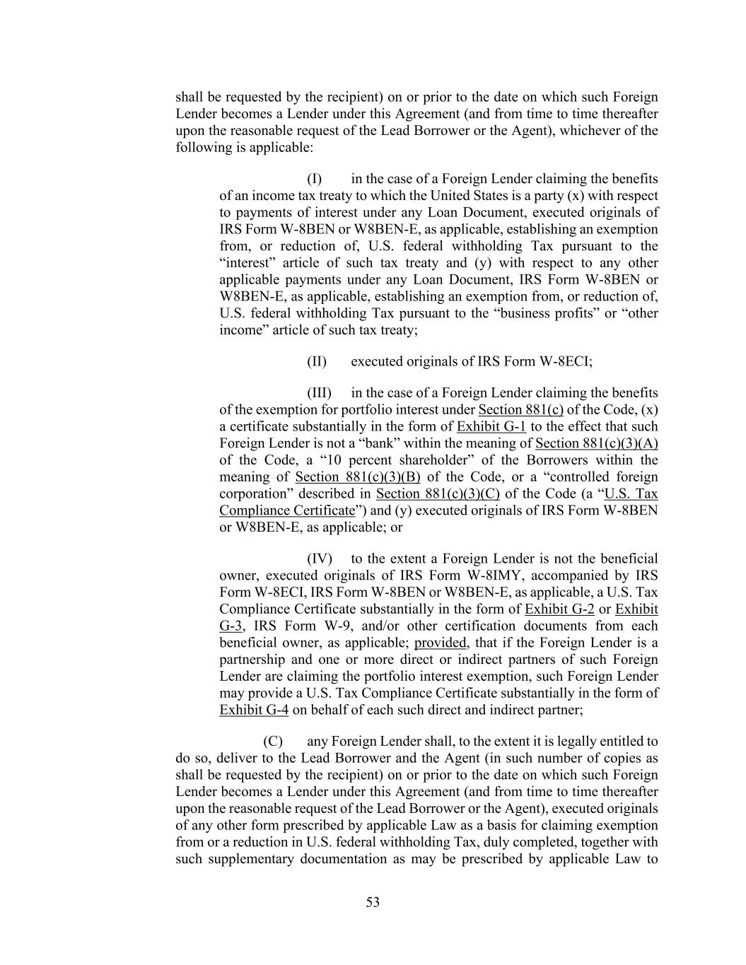 53 shall be requested by the recipient) on or prior to the date on which such Foreign Lender becomes a Lender under this Agreement (and from time to time thereafter upon the reasonable request of the Lead Borrower or the Agent), whichever of the following is applicable: (I) in the case of a Foreign Lender claiming the benefits of an income tax treaty to which the United States is a party (x) with respect to payments of interest under any Loan Document, executed originals of IRS Form W-8BEN or W8BEN-E, as applicable, establishing an exemption from, or reduction of, U.S. federal withholding Tax pursuant to the “interest” article of such tax treaty and (y) with respect to any other applicable payments under any Loan Document, IRS Form W-8BEN or W8BEN-E, as applicable, establishing an exemption from, or reduction of, U.S. federal withholding Tax pursuant to the “business profits” or “other income” article of such tax treaty; (II) executed originals of IRS Form W-8ECI; (III) in the case of a Foreign Lender claiming the benefits of the exemption for portfolio interest under Section 881(c) of the Code, (x) a certificate substantially in the form of Exhibit G-1 to the effect that such Foreign Lender is not a “bank” within the meaning of Section 881(c)(3)(A) of the Code, a “10 percent shareholder” of the Borrowers within the meaning of Section 881(c)(3)(B) of the Code, or a “controlled foreign corporation” described in Section 881(c)(3)(C) of the Code (a “U.S. Tax Compliance Certificate”) and (y) executed originals of IRS Form W-8BEN or W8BEN-E, as applicable; or (IV) to the extent a Foreign Lender is not the beneficial owner, executed originals of IRS Form W-8IMY, accompanied by IRS Form W-8ECI, IRS Form W-8BEN or W8BEN-E, as applicable, a U.S. Tax Compliance Certificate substantially in the form of Exhibit G-2 or Exhibit G-3, IRS Form W-9, and/or other certification documents from each beneficial owner, as applicable; provided, that if the Foreign Lender is a partnership and one or more direct or indirect partners of such Foreign Lender are claiming the portfolio interest exemption, such Foreign Lender may provide a U.S. Tax Compliance Certificate substantially in the form of Exhibit G-4 on behalf of each such direct and indirect partner; (C) any Foreign Lender shall, to the extent it is legally entitled to do so, deliver to the Lead Borrower and the Agent (in such number of copies as shall be requested by the recipient) on or prior to the date on which such Foreign Lender becomes a Lender under this Agreement (and from time to time thereafter upon the reasonable request of the Lead Borrower or the Agent), executed originals of any other form prescribed by applicable Law as a basis for claiming exemption from or a reduction in U.S. federal withholding Tax, duly completed, together with such supplementary documentation as may be prescribed by applicable Law to