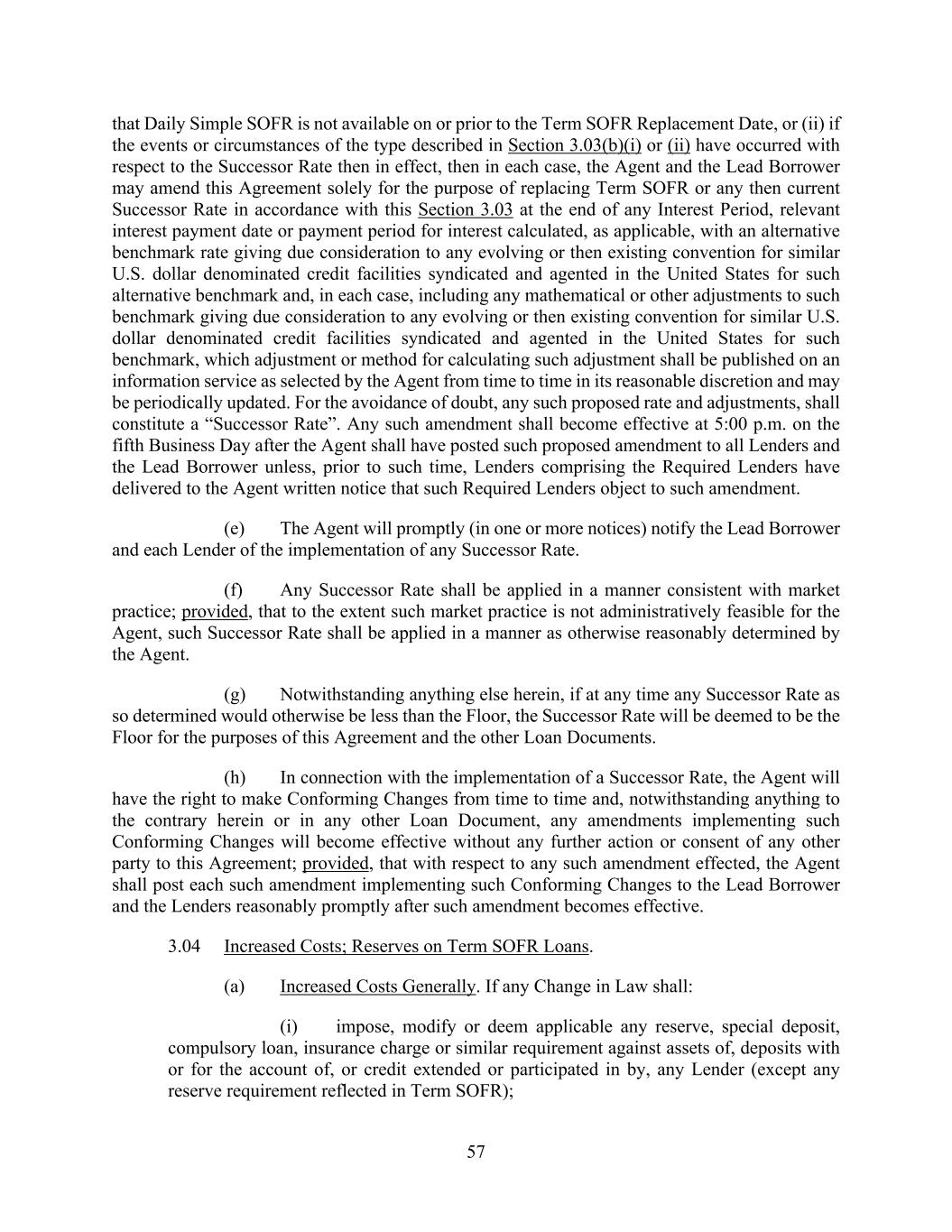 57 that Daily Simple SOFR is not available on or prior to the Term SOFR Replacement Date, or (ii) if the events or circumstances of the type described in Section 3.03(b)(i) or (ii) have occurred with respect to the Successor Rate then in effect, then in each case, the Agent and the Lead Borrower may amend this Agreement solely for the purpose of replacing Term SOFR or any then current Successor Rate in accordance with this Section 3.03 at the end of any Interest Period, relevant interest payment date or payment period for interest calculated, as applicable, with an alternative benchmark rate giving due consideration to any evolving or then existing convention for similar U.S. dollar denominated credit facilities syndicated and agented in the United States for such alternative benchmark and, in each case, including any mathematical or other adjustments to such benchmark giving due consideration to any evolving or then existing convention for similar U.S. dollar denominated credit facilities syndicated and agented in the United States for such benchmark, which adjustment or method for calculating such adjustment shall be published on an information service as selected by the Agent from time to time in its reasonable discretion and may be periodically updated. For the avoidance of doubt, any such proposed rate and adjustments, shall constitute a “Successor Rate”. Any such amendment shall become effective at 5:00 p.m. on the fifth Business Day after the Agent shall have posted such proposed amendment to all Lenders and the Lead Borrower unless, prior to such time, Lenders comprising the Required Lenders have delivered to the Agent written notice that such Required Lenders object to such amendment. (e) The Agent will promptly (in one or more notices) notify the Lead Borrower and each Lender of the implementation of any Successor Rate. (f) Any Successor Rate shall be applied in a manner consistent with market practice; provided, that to the extent such market practice is not administratively feasible for the Agent, such Successor Rate shall be applied in a manner as otherwise reasonably determined by the Agent. (g) Notwithstanding anything else herein, if at any time any Successor Rate as so determined would otherwise be less than the Floor, the Successor Rate will be deemed to be the Floor for the purposes of this Agreement and the other Loan Documents. (h) In connection with the implementation of a Successor Rate, the Agent will have the right to make Conforming Changes from time to time and, notwithstanding anything to the contrary herein or in any other Loan Document, any amendments implementing such Conforming Changes will become effective without any further action or consent of any other party to this Agreement; provided, that with respect to any such amendment effected, the Agent shall post each such amendment implementing such Conforming Changes to the Lead Borrower and the Lenders reasonably promptly after such amendment becomes effective. 3.04 Increased Costs; Reserves on Term SOFR Loans. (a) Increased Costs Generally. If any Change in Law shall: (i) impose, modify or deem applicable any reserve, special deposit, compulsory loan, insurance charge or similar requirement against assets of, deposits with or for the account of, or credit extended or participated in by, any Lender (except any reserve requirement reflected in Term SOFR);