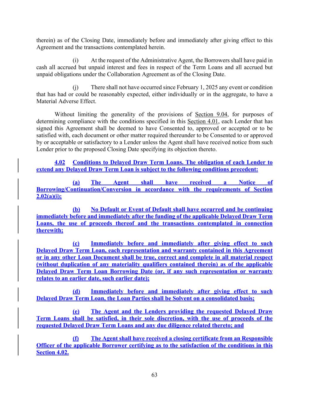 63 therein) as of the Closing Date, immediately before and immediately after giving effect to this Agreement and the transactions contemplated herein. (i) At the request of the Administrative Agent, the Borrowers shall have paid in cash all accrued but unpaid interest and fees in respect of the Term Loans and all accrued but unpaid obligations under the Collaboration Agreement as of the Closing Date. (j) There shall not have occurred since February 1, 2025 any event or condition that has had or could be reasonably expected, either individually or in the aggregate, to have a Material Adverse Effect. Without limiting the generality of the provisions of Section 9.04, for purposes of determining compliance with the conditions specified in this Section 4.01, each Lender that has signed this Agreement shall be deemed to have Consented to, approved or accepted or to be satisfied with, each document or other matter required thereunder to be Consented to or approved by or acceptable or satisfactory to a Lender unless the Agent shall have received notice from such Lender prior to the proposed Closing Date specifying its objection thereto. 4.02 Conditions to Delayed Draw Term Loans. The obligation of each Lender to extend any Delayed Draw Term Loan is subject to the following conditions precedent: (a) The Agent shall have received a Notice of Borrowing/Continuation/Conversion in accordance with the requirements of Section 2.02(a)(i); (b) No Default or Event of Default shall have occurred and be continuing immediately before and immediately after the funding of the applicable Delayed Draw Term Loans, the use of proceeds thereof and the transactions contemplated in connection therewith; (c) Immediately before and immediately after giving effect to such Delayed Draw Term Loan, each representation and warranty contained in this Agreement or in any other Loan Document shall be true, correct and complete in all material respect (without duplication of any materiality qualifiers contained therein) as of the applicable Delayed Draw Term Loan Borrowing Date (or, if any such representation or warranty relates to an earlier date, such earlier date); (d) Immediately before and immediately after giving effect to such Delayed Draw Term Loan, the Loan Parties shall be Solvent on a consolidated basis; (e) The Agent and the Lenders providing the requested Delayed Draw Term Loans shall be satisfied, in their sole discretion, with the use of proceeds of the requested Delayed Draw Term Loans and any due diligence related thereto; and (f) The Agent shall have received a closing certificate from an Responsible Officer of the applicable Borrower certifying as to the satisfaction of the conditions in this Section 4.02.