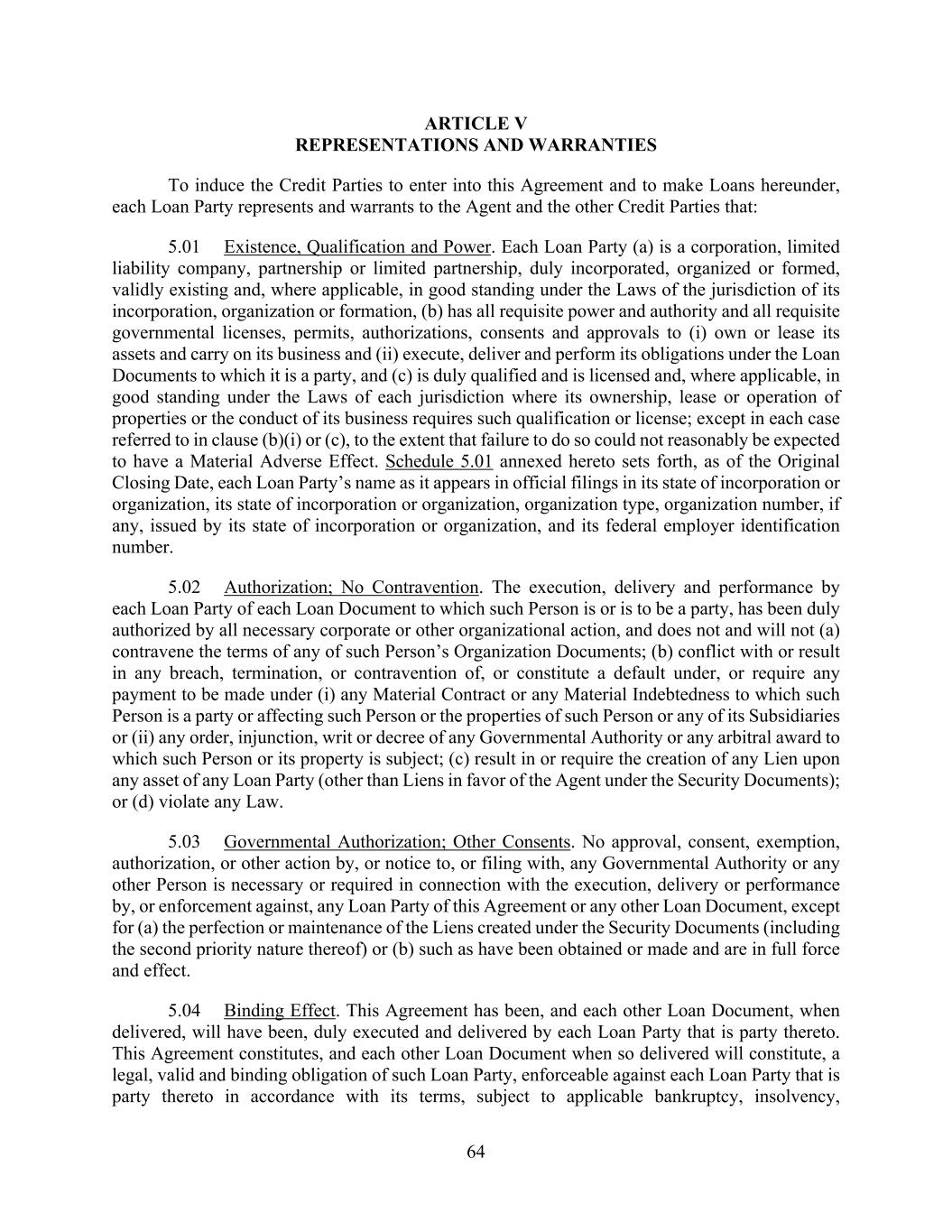 64 ARTICLE V REPRESENTATIONS AND WARRANTIES To induce the Credit Parties to enter into this Agreement and to make Loans hereunder, each Loan Party represents and warrants to the Agent and the other Credit Parties that: 5.01 Existence, Qualification and Power. Each Loan Party (a) is a corporation, limited liability company, partnership or limited partnership, duly incorporated, organized or formed, validly existing and, where applicable, in good standing under the Laws of the jurisdiction of its incorporation, organization or formation, (b) has all requisite power and authority and all requisite governmental licenses, permits, authorizations, consents and approvals to (i) own or lease its assets and carry on its business and (ii) execute, deliver and perform its obligations under the Loan Documents to which it is a party, and (c) is duly qualified and is licensed and, where applicable, in good standing under the Laws of each jurisdiction where its ownership, lease or operation of properties or the conduct of its business requires such qualification or license; except in each case referred to in clause (b)(i) or (c), to the extent that failure to do so could not reasonably be expected to have a Material Adverse Effect. Schedule 5.01 annexed hereto sets forth, as of the Original Closing Date, each Loan Party’s name as it appears in official filings in its state of incorporation or organization, its state of incorporation or organization, organization type, organization number, if any, issued by its state of incorporation or organization, and its federal employer identification number. 5.02 Authorization; No Contravention. The execution, delivery and performance by each Loan Party of each Loan Document to which such Person is or is to be a party, has been duly authorized by all necessary corporate or other organizational action, and does not and will not (a) contravene the terms of any of such Person’s Organization Documents; (b) conflict with or result in any breach, termination, or contravention of, or constitute a default under, or require any payment to be made under (i) any Material Contract or any Material Indebtedness to which such Person is a party or affecting such Person or the properties of such Person or any of its Subsidiaries or (ii) any order, injunction, writ or decree of any Governmental Authority or any arbitral award to which such Person or its property is subject; (c) result in or require the creation of any Lien upon any asset of any Loan Party (other than Liens in favor of the Agent under the Security Documents); or (d) violate any Law. 5.03 Governmental Authorization; Other Consents. No approval, consent, exemption, authorization, or other action by, or notice to, or filing with, any Governmental Authority or any other Person is necessary or required in connection with the execution, delivery or performance by, or enforcement against, any Loan Party of this Agreement or any other Loan Document, except for (a) the perfection or maintenance of the Liens created under the Security Documents (including the second priority nature thereof) or (b) such as have been obtained or made and are in full force and effect. 5.04 Binding Effect. This Agreement has been, and each other Loan Document, when delivered, will have been, duly executed and delivered by each Loan Party that is party thereto. This Agreement constitutes, and each other Loan Document when so delivered will constitute, a legal, valid and binding obligation of such Loan Party, enforceable against each Loan Party that is party thereto in accordance with its terms, subject to applicable bankruptcy, insolvency,