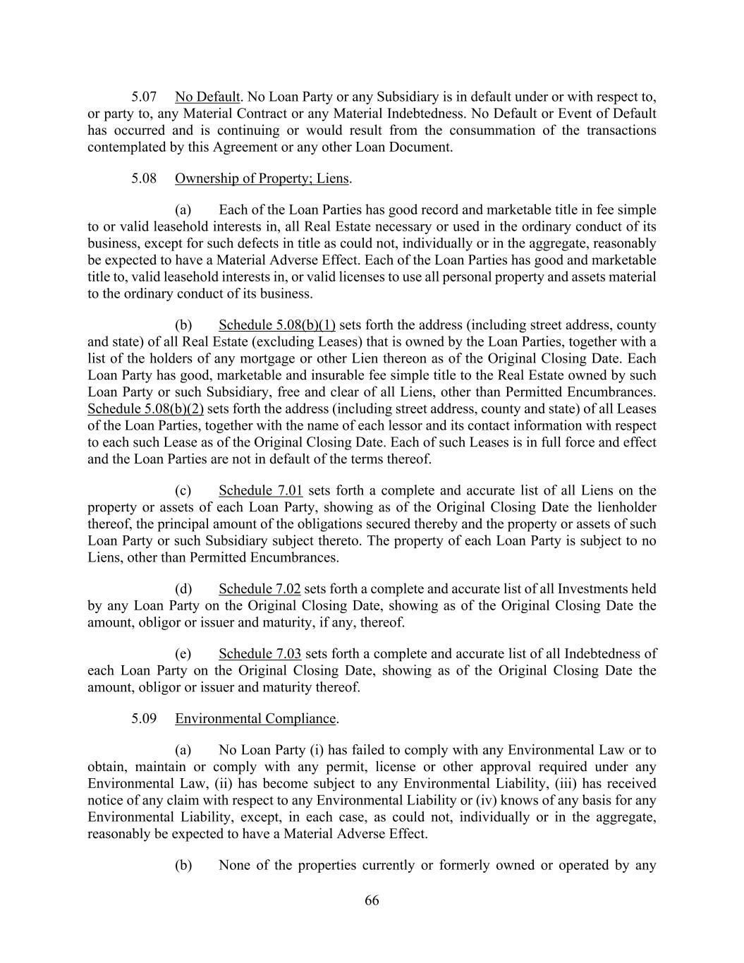 66 5.07 No Default. No Loan Party or any Subsidiary is in default under or with respect to, or party to, any Material Contract or any Material Indebtedness. No Default or Event of Default has occurred and is continuing or would result from the consummation of the transactions contemplated by this Agreement or any other Loan Document. 5.08 Ownership of Property; Liens. (a) Each of the Loan Parties has good record and marketable title in fee simple to or valid leasehold interests in, all Real Estate necessary or used in the ordinary conduct of its business, except for such defects in title as could not, individually or in the aggregate, reasonably be expected to have a Material Adverse Effect. Each of the Loan Parties has good and marketable title to, valid leasehold interests in, or valid licenses to use all personal property and assets material to the ordinary conduct of its business. (b) Schedule 5.08(b)(1) sets forth the address (including street address, county and state) of all Real Estate (excluding Leases) that is owned by the Loan Parties, together with a list of the holders of any mortgage or other Lien thereon as of the Original Closing Date. Each Loan Party has good, marketable and insurable fee simple title to the Real Estate owned by such Loan Party or such Subsidiary, free and clear of all Liens, other than Permitted Encumbrances. Schedule 5.08(b)(2) sets forth the address (including street address, county and state) of all Leases of the Loan Parties, together with the name of each lessor and its contact information with respect to each such Lease as of the Original Closing Date. Each of such Leases is in full force and effect and the Loan Parties are not in default of the terms thereof. (c) Schedule 7.01 sets forth a complete and accurate list of all Liens on the property or assets of each Loan Party, showing as of the Original Closing Date the lienholder thereof, the principal amount of the obligations secured thereby and the property or assets of such Loan Party or such Subsidiary subject thereto. The property of each Loan Party is subject to no Liens, other than Permitted Encumbrances. (d) Schedule 7.02 sets forth a complete and accurate list of all Investments held by any Loan Party on the Original Closing Date, showing as of the Original Closing Date the amount, obligor or issuer and maturity, if any, thereof. (e) Schedule 7.03 sets forth a complete and accurate list of all Indebtedness of each Loan Party on the Original Closing Date, showing as of the Original Closing Date the amount, obligor or issuer and maturity thereof. 5.09 Environmental Compliance. (a) No Loan Party (i) has failed to comply with any Environmental Law or to obtain, maintain or comply with any permit, license or other approval required under any Environmental Law, (ii) has become subject to any Environmental Liability, (iii) has received notice of any claim with respect to any Environmental Liability or (iv) knows of any basis for any Environmental Liability, except, in each case, as could not, individually or in the aggregate, reasonably be expected to have a Material Adverse Effect. (b) None of the properties currently or formerly owned or operated by any