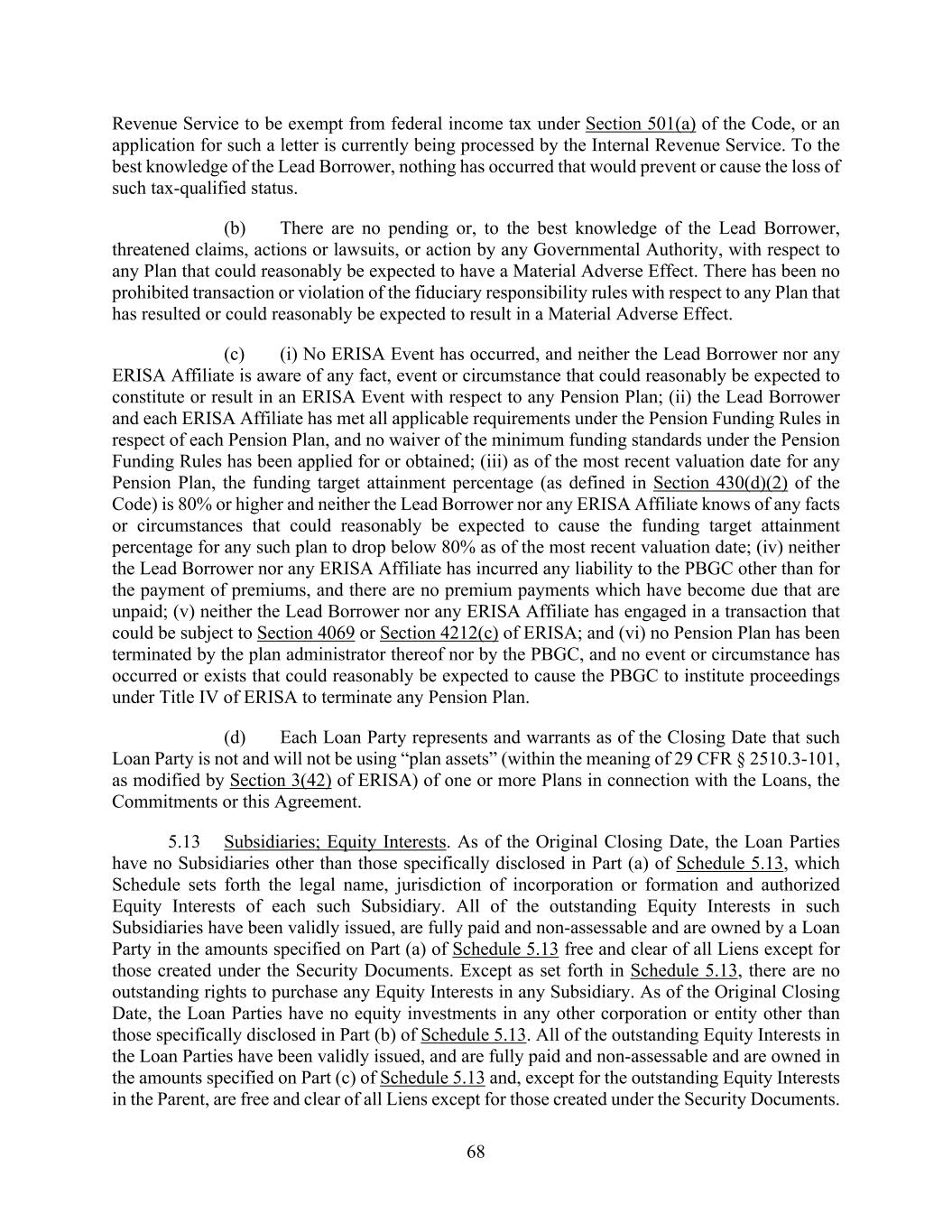 68 Revenue Service to be exempt from federal income tax under Section 501(a) of the Code, or an application for such a letter is currently being processed by the Internal Revenue Service. To the best knowledge of the Lead Borrower, nothing has occurred that would prevent or cause the loss of such tax-qualified status. (b) There are no pending or, to the best knowledge of the Lead Borrower, threatened claims, actions or lawsuits, or action by any Governmental Authority, with respect to any Plan that could reasonably be expected to have a Material Adverse Effect. There has been no prohibited transaction or violation of the fiduciary responsibility rules with respect to any Plan that has resulted or could reasonably be expected to result in a Material Adverse Effect. (c) (i) No ERISA Event has occurred, and neither the Lead Borrower nor any ERISA Affiliate is aware of any fact, event or circumstance that could reasonably be expected to constitute or result in an ERISA Event with respect to any Pension Plan; (ii) the Lead Borrower and each ERISA Affiliate has met all applicable requirements under the Pension Funding Rules in respect of each Pension Plan, and no waiver of the minimum funding standards under the Pension Funding Rules has been applied for or obtained; (iii) as of the most recent valuation date for any Pension Plan, the funding target attainment percentage (as defined in Section 430(d)(2) of the Code) is 80% or higher and neither the Lead Borrower nor any ERISA Affiliate knows of any facts or circumstances that could reasonably be expected to cause the funding target attainment percentage for any such plan to drop below 80% as of the most recent valuation date; (iv) neither the Lead Borrower nor any ERISA Affiliate has incurred any liability to the PBGC other than for the payment of premiums, and there are no premium payments which have become due that are unpaid; (v) neither the Lead Borrower nor any ERISA Affiliate has engaged in a transaction that could be subject to Section 4069 or Section 4212(c) of ERISA; and (vi) no Pension Plan has been terminated by the plan administrator thereof nor by the PBGC, and no event or circumstance has occurred or exists that could reasonably be expected to cause the PBGC to institute proceedings under Title IV of ERISA to terminate any Pension Plan. (d) Each Loan Party represents and warrants as of the Closing Date that such Loan Party is not and will not be using “plan assets” (within the meaning of 29 CFR § 2510.3-101, as modified by Section 3(42) of ERISA) of one or more Plans in connection with the Loans, the Commitments or this Agreement. 5.13 Subsidiaries; Equity Interests. As of the Original Closing Date, the Loan Parties have no Subsidiaries other than those specifically disclosed in Part (a) of Schedule 5.13, which Schedule sets forth the legal name, jurisdiction of incorporation or formation and authorized Equity Interests of each such Subsidiary. All of the outstanding Equity Interests in such Subsidiaries have been validly issued, are fully paid and non-assessable and are owned by a Loan Party in the amounts specified on Part (a) of Schedule 5.13 free and clear of all Liens except for those created under the Security Documents. Except as set forth in Schedule 5.13, there are no outstanding rights to purchase any Equity Interests in any Subsidiary. As of the Original Closing Date, the Loan Parties have no equity investments in any other corporation or entity other than those specifically disclosed in Part (b) of Schedule 5.13. All of the outstanding Equity Interests in the Loan Parties have been validly issued, and are fully paid and non-assessable and are owned in the amounts specified on Part (c) of Schedule 5.13 and, except for the outstanding Equity Interests in the Parent, are free and clear of all Liens except for those created under the Security Documents.