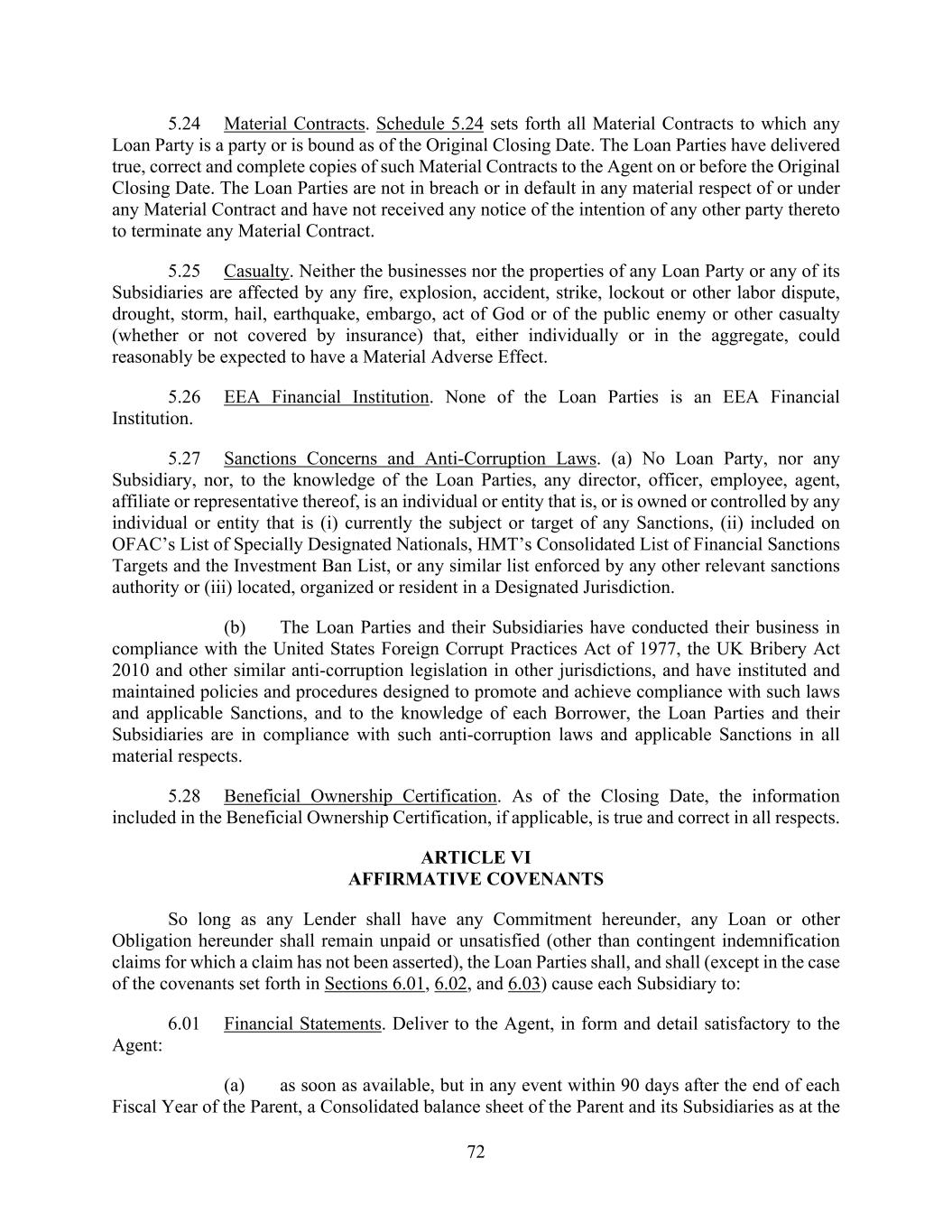 72 5.24 Material Contracts. Schedule 5.24 sets forth all Material Contracts to which any Loan Party is a party or is bound as of the Original Closing Date. The Loan Parties have delivered true, correct and complete copies of such Material Contracts to the Agent on or before the Original Closing Date. The Loan Parties are not in breach or in default in any material respect of or under any Material Contract and have not received any notice of the intention of any other party thereto to terminate any Material Contract. 5.25 Casualty. Neither the businesses nor the properties of any Loan Party or any of its Subsidiaries are affected by any fire, explosion, accident, strike, lockout or other labor dispute, drought, storm, hail, earthquake, embargo, act of God or of the public enemy or other casualty (whether or not covered by insurance) that, either individually or in the aggregate, could reasonably be expected to have a Material Adverse Effect. 5.26 EEA Financial Institution. None of the Loan Parties is an EEA Financial Institution. 5.27 Sanctions Concerns and Anti-Corruption Laws. (a) No Loan Party, nor any Subsidiary, nor, to the knowledge of the Loan Parties, any director, officer, employee, agent, affiliate or representative thereof, is an individual or entity that is, or is owned or controlled by any individual or entity that is (i) currently the subject or target of any Sanctions, (ii) included on OFAC’s List of Specially Designated Nationals, HMT’s Consolidated List of Financial Sanctions Targets and the Investment Ban List, or any similar list enforced by any other relevant sanctions authority or (iii) located, organized or resident in a Designated Jurisdiction. (b) The Loan Parties and their Subsidiaries have conducted their business in compliance with the United States Foreign Corrupt Practices Act of 1977, the UK Bribery Act 2010 and other similar anti-corruption legislation in other jurisdictions, and have instituted and maintained policies and procedures designed to promote and achieve compliance with such laws and applicable Sanctions, and to the knowledge of each Borrower, the Loan Parties and their Subsidiaries are in compliance with such anti-corruption laws and applicable Sanctions in all material respects. 5.28 Beneficial Ownership Certification. As of the Closing Date, the information included in the Beneficial Ownership Certification, if applicable, is true and correct in all respects. ARTICLE VI AFFIRMATIVE COVENANTS So long as any Lender shall have any Commitment hereunder, any Loan or other Obligation hereunder shall remain unpaid or unsatisfied (other than contingent indemnification claims for which a claim has not been asserted), the Loan Parties shall, and shall (except in the case of the covenants set forth in Sections 6.01, 6.02, and 6.03) cause each Subsidiary to: 6.01 Financial Statements. Deliver to the Agent, in form and detail satisfactory to the Agent: (a) as soon as available, but in any event within 90 days after the end of each Fiscal Year of the Parent, a Consolidated balance sheet of the Parent and its Subsidiaries as at the