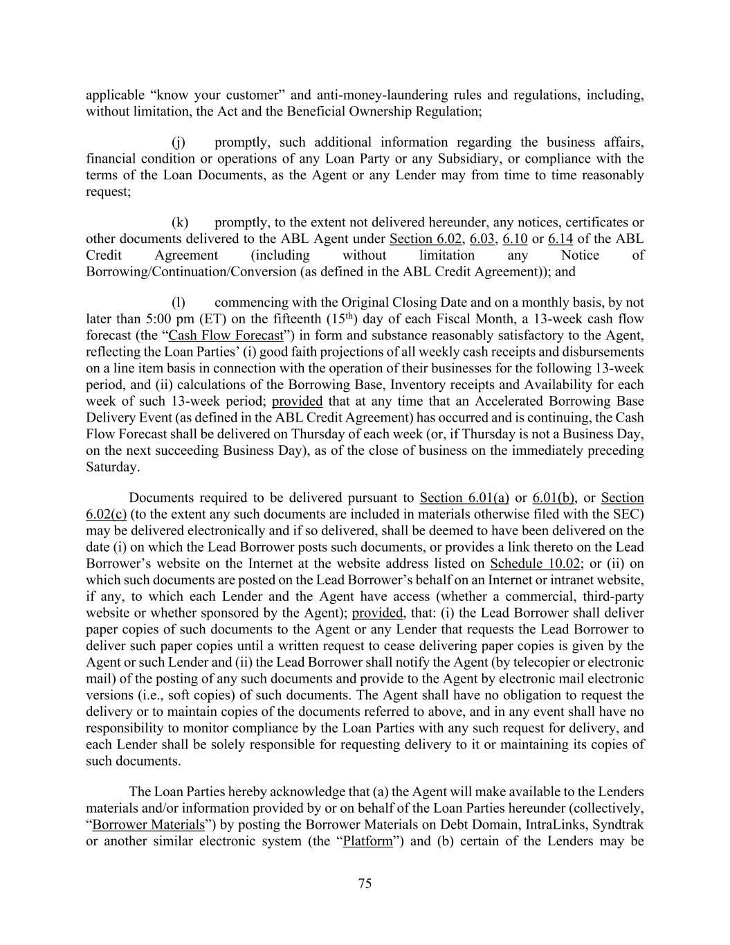 75 applicable “know your customer” and anti-money-laundering rules and regulations, including, without limitation, the Act and the Beneficial Ownership Regulation; (j) promptly, such additional information regarding the business affairs, financial condition or operations of any Loan Party or any Subsidiary, or compliance with the terms of the Loan Documents, as the Agent or any Lender may from time to time reasonably request; (k) promptly, to the extent not delivered hereunder, any notices, certificates or other documents delivered to the ABL Agent under Section 6.02, 6.03, 6.10 or 6.14 of the ABL Credit Agreement (including without limitation any Notice of Borrowing/Continuation/Conversion (as defined in the ABL Credit Agreement)); and (l) commencing with the Original Closing Date and on a monthly basis, by not later than 5:00 pm (ET) on the fifteenth (15th) day of each Fiscal Month, a 13-week cash flow forecast (the “Cash Flow Forecast”) in form and substance reasonably satisfactory to the Agent, reflecting the Loan Parties’ (i) good faith projections of all weekly cash receipts and disbursements on a line item basis in connection with the operation of their businesses for the following 13-week period, and (ii) calculations of the Borrowing Base, Inventory receipts and Availability for each week of such 13-week period; provided that at any time that an Accelerated Borrowing Base Delivery Event (as defined in the ABL Credit Agreement) has occurred and is continuing, the Cash Flow Forecast shall be delivered on Thursday of each week (or, if Thursday is not a Business Day, on the next succeeding Business Day), as of the close of business on the immediately preceding Saturday. Documents required to be delivered pursuant to Section 6.01(a) or 6.01(b), or Section 6.02(c) (to the extent any such documents are included in materials otherwise filed with the SEC) may be delivered electronically and if so delivered, shall be deemed to have been delivered on the date (i) on which the Lead Borrower posts such documents, or provides a link thereto on the Lead Borrower’s website on the Internet at the website address listed on Schedule 10.02; or (ii) on which such documents are posted on the Lead Borrower’s behalf on an Internet or intranet website, if any, to which each Lender and the Agent have access (whether a commercial, third-party website or whether sponsored by the Agent); provided, that: (i) the Lead Borrower shall deliver paper copies of such documents to the Agent or any Lender that requests the Lead Borrower to deliver such paper copies until a written request to cease delivering paper copies is given by the Agent or such Lender and (ii) the Lead Borrower shall notify the Agent (by telecopier or electronic mail) of the posting of any such documents and provide to the Agent by electronic mail electronic versions (i.e., soft copies) of such documents. The Agent shall have no obligation to request the delivery or to maintain copies of the documents referred to above, and in any event shall have no responsibility to monitor compliance by the Loan Parties with any such request for delivery, and each Lender shall be solely responsible for requesting delivery to it or maintaining its copies of such documents. The Loan Parties hereby acknowledge that (a) the Agent will make available to the Lenders materials and/or information provided by or on behalf of the Loan Parties hereunder (collectively, “Borrower Materials”) by posting the Borrower Materials on Debt Domain, IntraLinks, Syndtrak or another similar electronic system (the “Platform”) and (b) certain of the Lenders may be