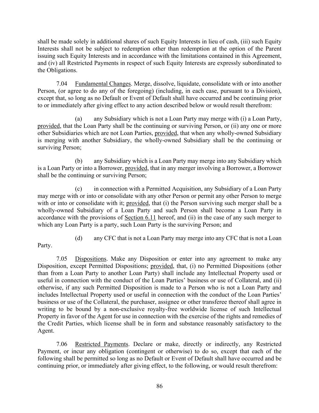 86 shall be made solely in additional shares of such Equity Interests in lieu of cash, (iii) such Equity Interests shall not be subject to redemption other than redemption at the option of the Parent issuing such Equity Interests and in accordance with the limitations contained in this Agreement, and (iv) all Restricted Payments in respect of such Equity Interests are expressly subordinated to the Obligations. 7.04 Fundamental Changes. Merge, dissolve, liquidate, consolidate with or into another Person, (or agree to do any of the foregoing) (including, in each case, pursuant to a Division), except that, so long as no Default or Event of Default shall have occurred and be continuing prior to or immediately after giving effect to any action described below or would result therefrom: (a) any Subsidiary which is not a Loan Party may merge with (i) a Loan Party, provided, that the Loan Party shall be the continuing or surviving Person, or (ii) any one or more other Subsidiaries which are not Loan Parties, provided, that when any wholly-owned Subsidiary is merging with another Subsidiary, the wholly-owned Subsidiary shall be the continuing or surviving Person; (b) any Subsidiary which is a Loan Party may merge into any Subsidiary which is a Loan Party or into a Borrower, provided, that in any merger involving a Borrower, a Borrower shall be the continuing or surviving Person; (c) in connection with a Permitted Acquisition, any Subsidiary of a Loan Party may merge with or into or consolidate with any other Person or permit any other Person to merge with or into or consolidate with it; provided, that (i) the Person surviving such merger shall be a wholly-owned Subsidiary of a Loan Party and such Person shall become a Loan Party in accordance with the provisions of Section 6.11 hereof, and (ii) in the case of any such merger to which any Loan Party is a party, such Loan Party is the surviving Person; and (d) any CFC that is not a Loan Party may merge into any CFC that is not a Loan Party. 7.05 Dispositions. Make any Disposition or enter into any agreement to make any Disposition, except Permitted Dispositions; provided, that, (i) no Permitted Dispositions (other than from a Loan Party to another Loan Party) shall include any Intellectual Property used or useful in connection with the conduct of the Loan Parties’ business or use of Collateral, and (ii) otherwise, if any such Permitted Disposition is made to a Person who is not a Loan Party and includes Intellectual Property used or useful in connection with the conduct of the Loan Parties’ business or use of the Collateral, the purchaser, assignee or other transferee thereof shall agree in writing to be bound by a non-exclusive royalty-free worldwide license of such Intellectual Property in favor of the Agent for use in connection with the exercise of the rights and remedies of the Credit Parties, which license shall be in form and substance reasonably satisfactory to the Agent. 7.06 Restricted Payments. Declare or make, directly or indirectly, any Restricted Payment, or incur any obligation (contingent or otherwise) to do so, except that each of the following shall be permitted so long as no Default or Event of Default shall have occurred and be continuing prior, or immediately after giving effect, to the following, or would result therefrom: