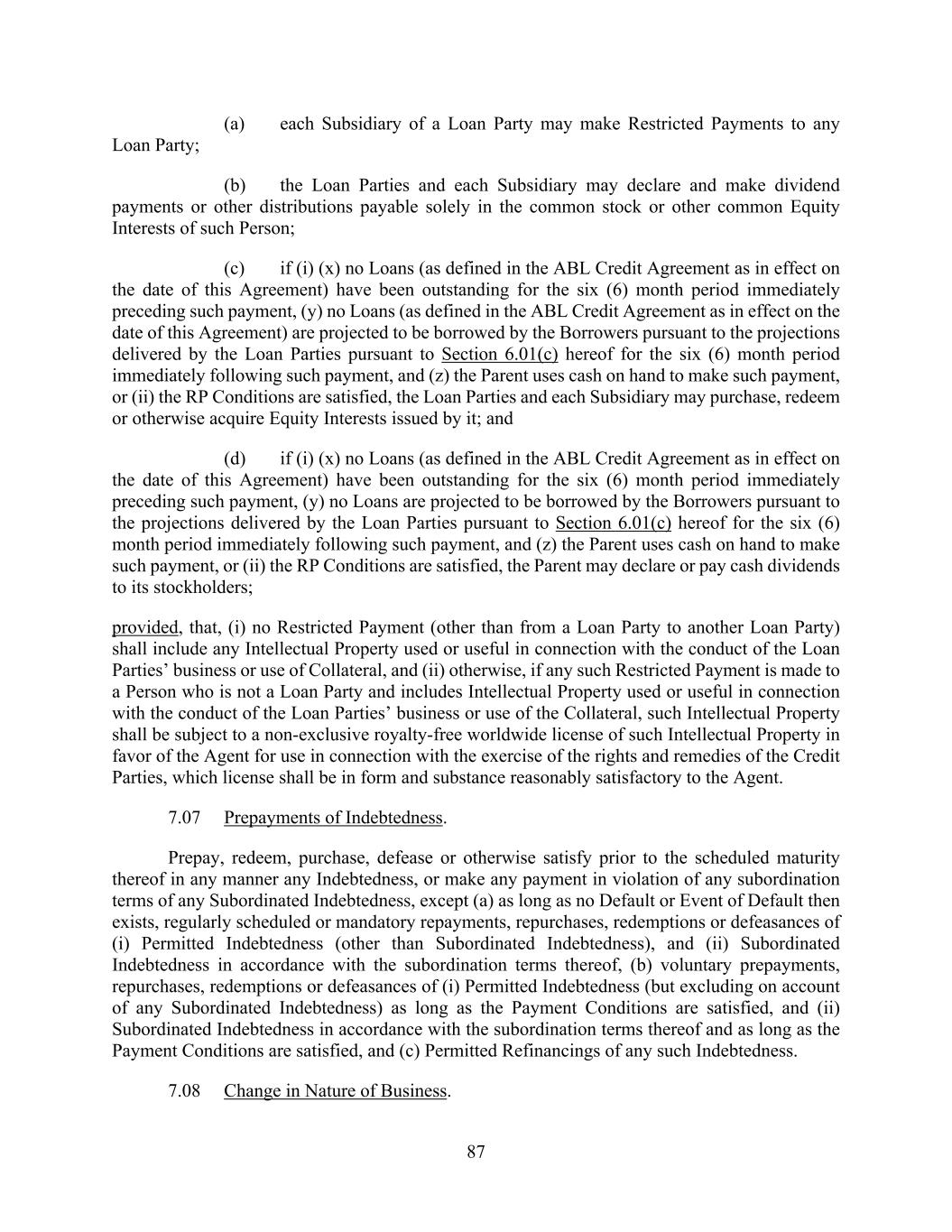 87 (a) each Subsidiary of a Loan Party may make Restricted Payments to any Loan Party; (b) the Loan Parties and each Subsidiary may declare and make dividend payments or other distributions payable solely in the common stock or other common Equity Interests of such Person; (c) if (i) (x) no Loans (as defined in the ABL Credit Agreement as in effect on the date of this Agreement) have been outstanding for the six (6) month period immediately preceding such payment, (y) no Loans (as defined in the ABL Credit Agreement as in effect on the date of this Agreement) are projected to be borrowed by the Borrowers pursuant to the projections delivered by the Loan Parties pursuant to Section 6.01(c) hereof for the six (6) month period immediately following such payment, and (z) the Parent uses cash on hand to make such payment, or (ii) the RP Conditions are satisfied, the Loan Parties and each Subsidiary may purchase, redeem or otherwise acquire Equity Interests issued by it; and (d) if (i) (x) no Loans (as defined in the ABL Credit Agreement as in effect on the date of this Agreement) have been outstanding for the six (6) month period immediately preceding such payment, (y) no Loans are projected to be borrowed by the Borrowers pursuant to the projections delivered by the Loan Parties pursuant to Section 6.01(c) hereof for the six (6) month period immediately following such payment, and (z) the Parent uses cash on hand to make such payment, or (ii) the RP Conditions are satisfied, the Parent may declare or pay cash dividends to its stockholders; provided, that, (i) no Restricted Payment (other than from a Loan Party to another Loan Party) shall include any Intellectual Property used or useful in connection with the conduct of the Loan Parties’ business or use of Collateral, and (ii) otherwise, if any such Restricted Payment is made to a Person who is not a Loan Party and includes Intellectual Property used or useful in connection with the conduct of the Loan Parties’ business or use of the Collateral, such Intellectual Property shall be subject to a non-exclusive royalty-free worldwide license of such Intellectual Property in favor of the Agent for use in connection with the exercise of the rights and remedies of the Credit Parties, which license shall be in form and substance reasonably satisfactory to the Agent. 7.07 Prepayments of Indebtedness. Prepay, redeem, purchase, defease or otherwise satisfy prior to the scheduled maturity thereof in any manner any Indebtedness, or make any payment in violation of any subordination terms of any Subordinated Indebtedness, except (a) as long as no Default or Event of Default then exists, regularly scheduled or mandatory repayments, repurchases, redemptions or defeasances of (i) Permitted Indebtedness (other than Subordinated Indebtedness), and (ii) Subordinated Indebtedness in accordance with the subordination terms thereof, (b) voluntary prepayments, repurchases, redemptions or defeasances of (i) Permitted Indebtedness (but excluding on account of any Subordinated Indebtedness) as long as the Payment Conditions are satisfied, and (ii) Subordinated Indebtedness in accordance with the subordination terms thereof and as long as the Payment Conditions are satisfied, and (c) Permitted Refinancings of any such Indebtedness. 7.08 Change in Nature of Business.