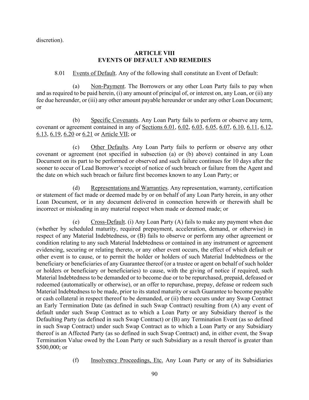 90 discretion). ARTICLE VIII EVENTS OF DEFAULT AND REMEDIES 8.01 Events of Default. Any of the following shall constitute an Event of Default: (a) Non-Payment. The Borrowers or any other Loan Party fails to pay when and as required to be paid herein, (i) any amount of principal of, or interest on, any Loan, or (ii) any fee due hereunder, or (iii) any other amount payable hereunder or under any other Loan Document; or (b) Specific Covenants. Any Loan Party fails to perform or observe any term, covenant or agreement contained in any of Sections 6.01, 6.02, 6.03, 6.05, 6.07, 6.10, 6.11, 6.12, 6.13, 6.19, 6.20 or 6.21 or Article VII; or (c) Other Defaults. Any Loan Party fails to perform or observe any other covenant or agreement (not specified in subsection (a) or (b) above) contained in any Loan Document on its part to be performed or observed and such failure continues for 10 days after the sooner to occur of Lead Borrower’s receipt of notice of such breach or failure from the Agent and the date on which such breach or failure first becomes known to any Loan Party; or (d) Representations and Warranties. Any representation, warranty, certification or statement of fact made or deemed made by or on behalf of any Loan Party herein, in any other Loan Document, or in any document delivered in connection herewith or therewith shall be incorrect or misleading in any material respect when made or deemed made; or (e) Cross-Default. (i) Any Loan Party (A) fails to make any payment when due (whether by scheduled maturity, required prepayment, acceleration, demand, or otherwise) in respect of any Material Indebtedness, or (B) fails to observe or perform any other agreement or condition relating to any such Material Indebtedness or contained in any instrument or agreement evidencing, securing or relating thereto, or any other event occurs, the effect of which default or other event is to cause, or to permit the holder or holders of such Material Indebtedness or the beneficiary or beneficiaries of any Guarantee thereof (or a trustee or agent on behalf of such holder or holders or beneficiary or beneficiaries) to cause, with the giving of notice if required, such Material Indebtedness to be demanded or to become due or to be repurchased, prepaid, defeased or redeemed (automatically or otherwise), or an offer to repurchase, prepay, defease or redeem such Material Indebtedness to be made, prior to its stated maturity or such Guarantee to become payable or cash collateral in respect thereof to be demanded, or (ii) there occurs under any Swap Contract an Early Termination Date (as defined in such Swap Contract) resulting from (A) any event of default under such Swap Contract as to which a Loan Party or any Subsidiary thereof is the Defaulting Party (as defined in such Swap Contract) or (B) any Termination Event (as so defined in such Swap Contract) under such Swap Contract as to which a Loan Party or any Subsidiary thereof is an Affected Party (as so defined in such Swap Contract) and, in either event, the Swap Termination Value owed by the Loan Party or such Subsidiary as a result thereof is greater than $500,000; or (f) Insolvency Proceedings, Etc. Any Loan Party or any of its Subsidiaries