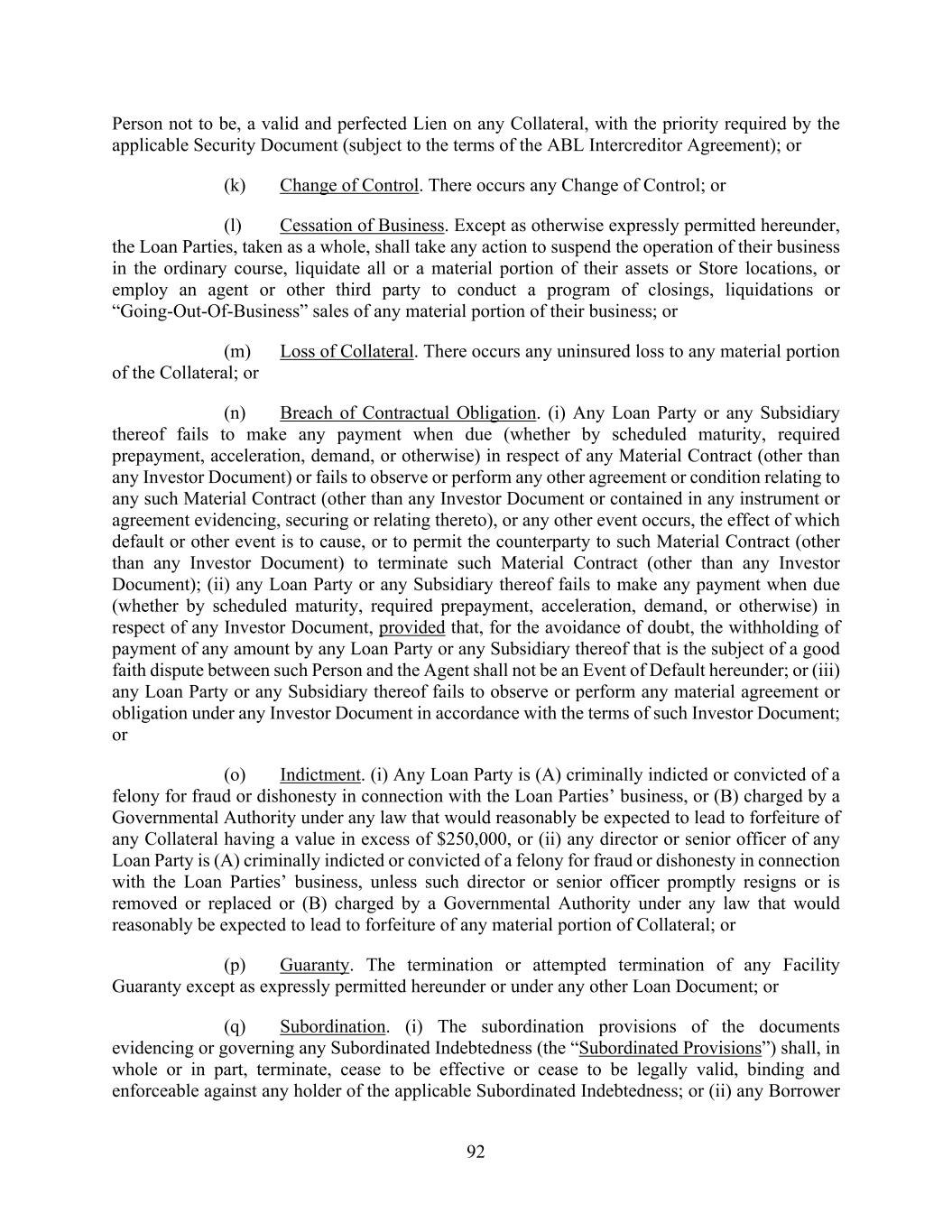 92 Person not to be, a valid and perfected Lien on any Collateral, with the priority required by the applicable Security Document (subject to the terms of the ABL Intercreditor Agreement); or (k) Change of Control. There occurs any Change of Control; or (l) Cessation of Business. Except as otherwise expressly permitted hereunder, the Loan Parties, taken as a whole, shall take any action to suspend the operation of their business in the ordinary course, liquidate all or a material portion of their assets or Store locations, or employ an agent or other third party to conduct a program of closings, liquidations or “Going-Out-Of-Business” sales of any material portion of their business; or (m) Loss of Collateral. There occurs any uninsured loss to any material portion of the Collateral; or (n) Breach of Contractual Obligation. (i) Any Loan Party or any Subsidiary thereof fails to make any payment when due (whether by scheduled maturity, required prepayment, acceleration, demand, or otherwise) in respect of any Material Contract (other than any Investor Document) or fails to observe or perform any other agreement or condition relating to any such Material Contract (other than any Investor Document or contained in any instrument or agreement evidencing, securing or relating thereto), or any other event occurs, the effect of which default or other event is to cause, or to permit the counterparty to such Material Contract (other than any Investor Document) to terminate such Material Contract (other than any Investor Document); (ii) any Loan Party or any Subsidiary thereof fails to make any payment when due (whether by scheduled maturity, required prepayment, acceleration, demand, or otherwise) in respect of any Investor Document, provided that, for the avoidance of doubt, the withholding of payment of any amount by any Loan Party or any Subsidiary thereof that is the subject of a good faith dispute between such Person and the Agent shall not be an Event of Default hereunder; or (iii) any Loan Party or any Subsidiary thereof fails to observe or perform any material agreement or obligation under any Investor Document in accordance with the terms of such Investor Document; or (o) Indictment. (i) Any Loan Party is (A) criminally indicted or convicted of a felony for fraud or dishonesty in connection with the Loan Parties’ business, or (B) charged by a Governmental Authority under any law that would reasonably be expected to lead to forfeiture of any Collateral having a value in excess of $250,000, or (ii) any director or senior officer of any Loan Party is (A) criminally indicted or convicted of a felony for fraud or dishonesty in connection with the Loan Parties’ business, unless such director or senior officer promptly resigns or is removed or replaced or (B) charged by a Governmental Authority under any law that would reasonably be expected to lead to forfeiture of any material portion of Collateral; or (p) Guaranty. The termination or attempted termination of any Facility Guaranty except as expressly permitted hereunder or under any other Loan Document; or (q) Subordination. (i) The subordination provisions of the documents evidencing or governing any Subordinated Indebtedness (the “Subordinated Provisions”) shall, in whole or in part, terminate, cease to be effective or cease to be legally valid, binding and enforceable against any holder of the applicable Subordinated Indebtedness; or (ii) any Borrower