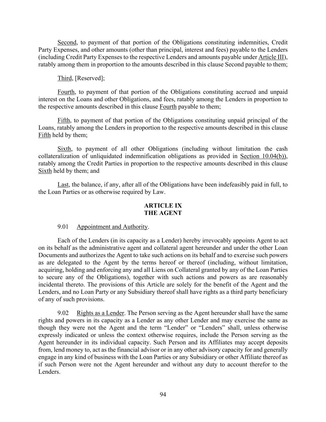 94 Second, to payment of that portion of the Obligations constituting indemnities, Credit Party Expenses, and other amounts (other than principal, interest and fees) payable to the Lenders (including Credit Party Expenses to the respective Lenders and amounts payable under Article III), ratably among them in proportion to the amounts described in this clause Second payable to them; Third, [Reserved]; Fourth, to payment of that portion of the Obligations constituting accrued and unpaid interest on the Loans and other Obligations, and fees, ratably among the Lenders in proportion to the respective amounts described in this clause Fourth payable to them; Fifth, to payment of that portion of the Obligations constituting unpaid principal of the Loans, ratably among the Lenders in proportion to the respective amounts described in this clause Fifth held by them; Sixth, to payment of all other Obligations (including without limitation the cash collateralization of unliquidated indemnification obligations as provided in Section 10.04(b)), ratably among the Credit Parties in proportion to the respective amounts described in this clause Sixth held by them; and Last, the balance, if any, after all of the Obligations have been indefeasibly paid in full, to the Loan Parties or as otherwise required by Law. ARTICLE IX THE AGENT 9.01 Appointment and Authority. Each of the Lenders (in its capacity as a Lender) hereby irrevocably appoints Agent to act on its behalf as the administrative agent and collateral agent hereunder and under the other Loan Documents and authorizes the Agent to take such actions on its behalf and to exercise such powers as are delegated to the Agent by the terms hereof or thereof (including, without limitation, acquiring, holding and enforcing any and all Liens on Collateral granted by any of the Loan Parties to secure any of the Obligations), together with such actions and powers as are reasonably incidental thereto. The provisions of this Article are solely for the benefit of the Agent and the Lenders, and no Loan Party or any Subsidiary thereof shall have rights as a third party beneficiary of any of such provisions. 9.02 Rights as a Lender. The Person serving as the Agent hereunder shall have the same rights and powers in its capacity as a Lender as any other Lender and may exercise the same as though they were not the Agent and the term “Lender” or “Lenders” shall, unless otherwise expressly indicated or unless the context otherwise requires, include the Person serving as the Agent hereunder in its individual capacity. Such Person and its Affiliates may accept deposits from, lend money to, act as the financial advisor or in any other advisory capacity for and generally engage in any kind of business with the Loan Parties or any Subsidiary or other Affiliate thereof as if such Person were not the Agent hereunder and without any duty to account therefor to the Lenders.