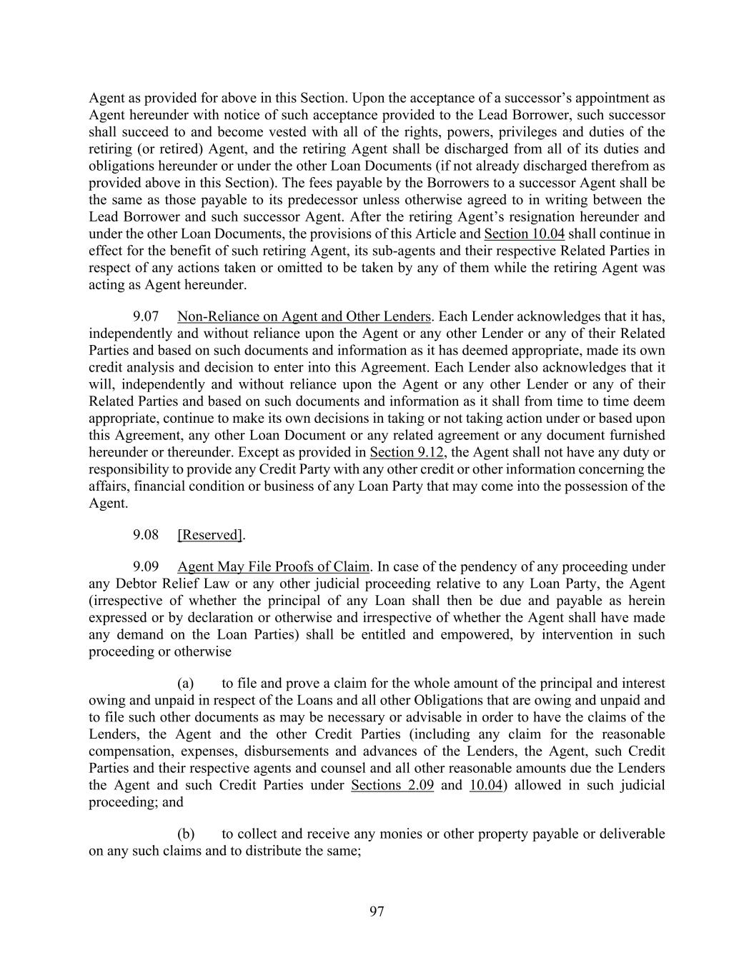 97 Agent as provided for above in this Section. Upon the acceptance of a successor’s appointment as Agent hereunder with notice of such acceptance provided to the Lead Borrower, such successor shall succeed to and become vested with all of the rights, powers, privileges and duties of the retiring (or retired) Agent, and the retiring Agent shall be discharged from all of its duties and obligations hereunder or under the other Loan Documents (if not already discharged therefrom as provided above in this Section). The fees payable by the Borrowers to a successor Agent shall be the same as those payable to its predecessor unless otherwise agreed to in writing between the Lead Borrower and such successor Agent. After the retiring Agent’s resignation hereunder and under the other Loan Documents, the provisions of this Article and Section 10.04 shall continue in effect for the benefit of such retiring Agent, its sub‑agents and their respective Related Parties in respect of any actions taken or omitted to be taken by any of them while the retiring Agent was acting as Agent hereunder. 9.07 Non-Reliance on Agent and Other Lenders. Each Lender acknowledges that it has, independently and without reliance upon the Agent or any other Lender or any of their Related Parties and based on such documents and information as it has deemed appropriate, made its own credit analysis and decision to enter into this Agreement. Each Lender also acknowledges that it will, independently and without reliance upon the Agent or any other Lender or any of their Related Parties and based on such documents and information as it shall from time to time deem appropriate, continue to make its own decisions in taking or not taking action under or based upon this Agreement, any other Loan Document or any related agreement or any document furnished hereunder or thereunder. Except as provided in Section 9.12, the Agent shall not have any duty or responsibility to provide any Credit Party with any other credit or other information concerning the affairs, financial condition or business of any Loan Party that may come into the possession of the Agent. 9.08 [Reserved]. 9.09 Agent May File Proofs of Claim. In case of the pendency of any proceeding under any Debtor Relief Law or any other judicial proceeding relative to any Loan Party, the Agent (irrespective of whether the principal of any Loan shall then be due and payable as herein expressed or by declaration or otherwise and irrespective of whether the Agent shall have made any demand on the Loan Parties) shall be entitled and empowered, by intervention in such proceeding or otherwise (a) to file and prove a claim for the whole amount of the principal and interest owing and unpaid in respect of the Loans and all other Obligations that are owing and unpaid and to file such other documents as may be necessary or advisable in order to have the claims of the Lenders, the Agent and the other Credit Parties (including any claim for the reasonable compensation, expenses, disbursements and advances of the Lenders, the Agent, such Credit Parties and their respective agents and counsel and all other reasonable amounts due the Lenders the Agent and such Credit Parties under Sections 2.09 and 10.04) allowed in such judicial proceeding; and (b) to collect and receive any monies or other property payable or deliverable on any such claims and to distribute the same;