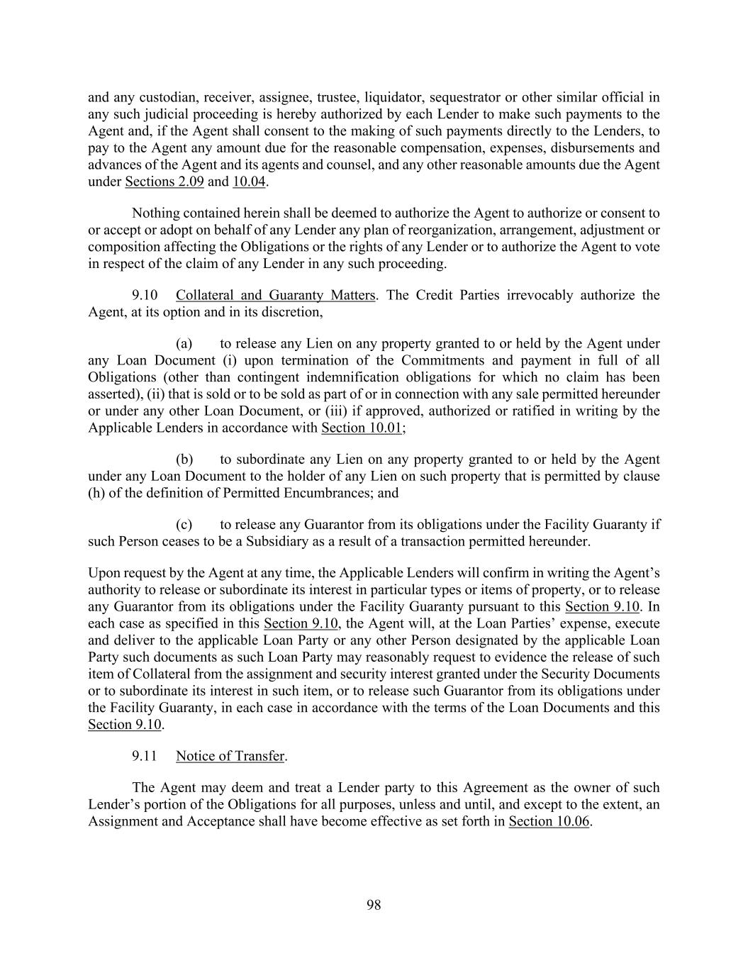 98 and any custodian, receiver, assignee, trustee, liquidator, sequestrator or other similar official in any such judicial proceeding is hereby authorized by each Lender to make such payments to the Agent and, if the Agent shall consent to the making of such payments directly to the Lenders, to pay to the Agent any amount due for the reasonable compensation, expenses, disbursements and advances of the Agent and its agents and counsel, and any other reasonable amounts due the Agent under Sections 2.09 and 10.04. Nothing contained herein shall be deemed to authorize the Agent to authorize or consent to or accept or adopt on behalf of any Lender any plan of reorganization, arrangement, adjustment or composition affecting the Obligations or the rights of any Lender or to authorize the Agent to vote in respect of the claim of any Lender in any such proceeding. 9.10 Collateral and Guaranty Matters. The Credit Parties irrevocably authorize the Agent, at its option and in its discretion, (a) to release any Lien on any property granted to or held by the Agent under any Loan Document (i) upon termination of the Commitments and payment in full of all Obligations (other than contingent indemnification obligations for which no claim has been asserted), (ii) that is sold or to be sold as part of or in connection with any sale permitted hereunder or under any other Loan Document, or (iii) if approved, authorized or ratified in writing by the Applicable Lenders in accordance with Section 10.01; (b) to subordinate any Lien on any property granted to or held by the Agent under any Loan Document to the holder of any Lien on such property that is permitted by clause (h) of the definition of Permitted Encumbrances; and (c) to release any Guarantor from its obligations under the Facility Guaranty if such Person ceases to be a Subsidiary as a result of a transaction permitted hereunder. Upon request by the Agent at any time, the Applicable Lenders will confirm in writing the Agent’s authority to release or subordinate its interest in particular types or items of property, or to release any Guarantor from its obligations under the Facility Guaranty pursuant to this Section 9.10. In each case as specified in this Section 9.10, the Agent will, at the Loan Parties’ expense, execute and deliver to the applicable Loan Party or any other Person designated by the applicable Loan Party such documents as such Loan Party may reasonably request to evidence the release of such item of Collateral from the assignment and security interest granted under the Security Documents or to subordinate its interest in such item, or to release such Guarantor from its obligations under the Facility Guaranty, in each case in accordance with the terms of the Loan Documents and this Section 9.10. 9.11 Notice of Transfer. The Agent may deem and treat a Lender party to this Agreement as the owner of such Lender’s portion of the Obligations for all purposes, unless and until, and except to the extent, an Assignment and Acceptance shall have become effective as set forth in Section 10.06.