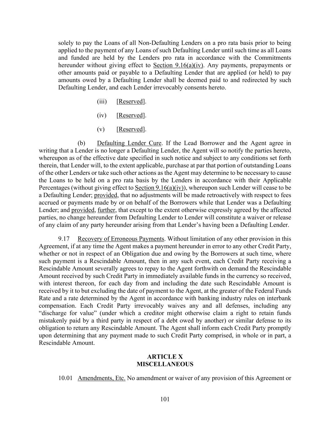 101 solely to pay the Loans of all Non-Defaulting Lenders on a pro rata basis prior to being applied to the payment of any Loans of such Defaulting Lender until such time as all Loans and funded are held by the Lenders pro rata in accordance with the Commitments hereunder without giving effect to Section 9.16(a)(iv). Any payments, prepayments or other amounts paid or payable to a Defaulting Lender that are applied (or held) to pay amounts owed by a Defaulting Lender shall be deemed paid to and redirected by such Defaulting Lender, and each Lender irrevocably consents hereto. (iii) [Reserved]. (iv) [Reserved]. (v) [Reserved]. (b) Defaulting Lender Cure. If the Lead Borrower and the Agent agree in writing that a Lender is no longer a Defaulting Lender, the Agent will so notify the parties hereto, whereupon as of the effective date specified in such notice and subject to any conditions set forth therein, that Lender will, to the extent applicable, purchase at par that portion of outstanding Loans of the other Lenders or take such other actions as the Agent may determine to be necessary to cause the Loans to be held on a pro rata basis by the Lenders in accordance with their Applicable Percentages (without giving effect to Section 9.16(a)(iv)), whereupon such Lender will cease to be a Defaulting Lender; provided, that no adjustments will be made retroactively with respect to fees accrued or payments made by or on behalf of the Borrowers while that Lender was a Defaulting Lender; and provided, further, that except to the extent otherwise expressly agreed by the affected parties, no change hereunder from Defaulting Lender to Lender will constitute a waiver or release of any claim of any party hereunder arising from that Lender’s having been a Defaulting Lender. 9.17 Recovery of Erroneous Payments. Without limitation of any other provision in this Agreement, if at any time the Agent makes a payment hereunder in error to any other Credit Party, whether or not in respect of an Obligation due and owing by the Borrowers at such time, where such payment is a Rescindable Amount, then in any such event, each Credit Party receiving a Rescindable Amount severally agrees to repay to the Agent forthwith on demand the Rescindable Amount received by such Credit Party in immediately available funds in the currency so received, with interest thereon, for each day from and including the date such Rescindable Amount is received by it to but excluding the date of payment to the Agent, at the greater of the Federal Funds Rate and a rate determined by the Agent in accordance with banking industry rules on interbank compensation. Each Credit Party irrevocably waives any and all defenses, including any “discharge for value” (under which a creditor might otherwise claim a right to retain funds mistakenly paid by a third party in respect of a debt owed by another) or similar defense to its obligation to return any Rescindable Amount. The Agent shall inform each Credit Party promptly upon determining that any payment made to such Credit Party comprised, in whole or in part, a Rescindable Amount. ARTICLE X MISCELLANEOUS 10.01 Amendments, Etc. No amendment or waiver of any provision of this Agreement or